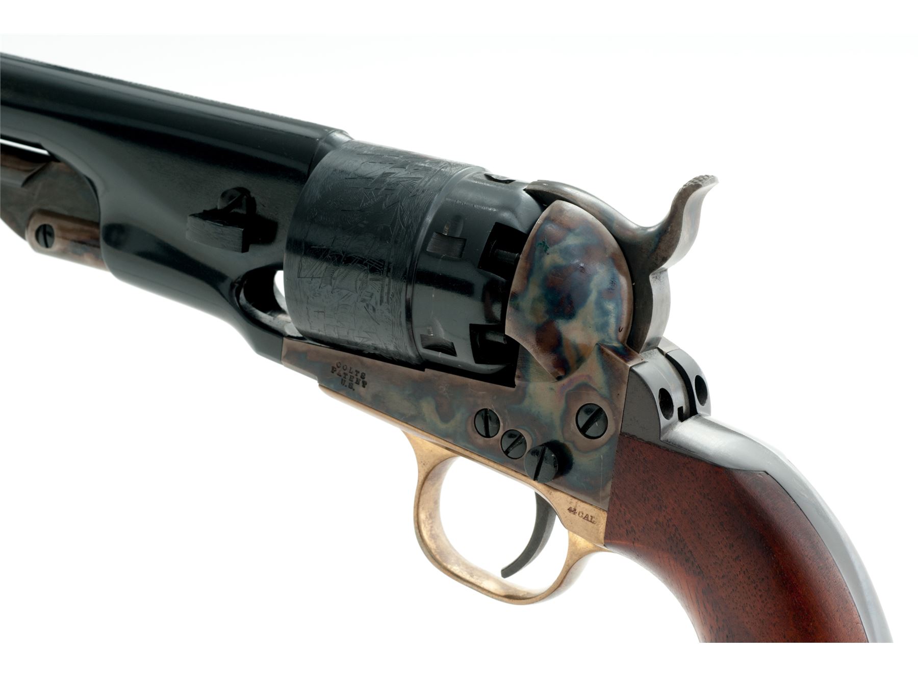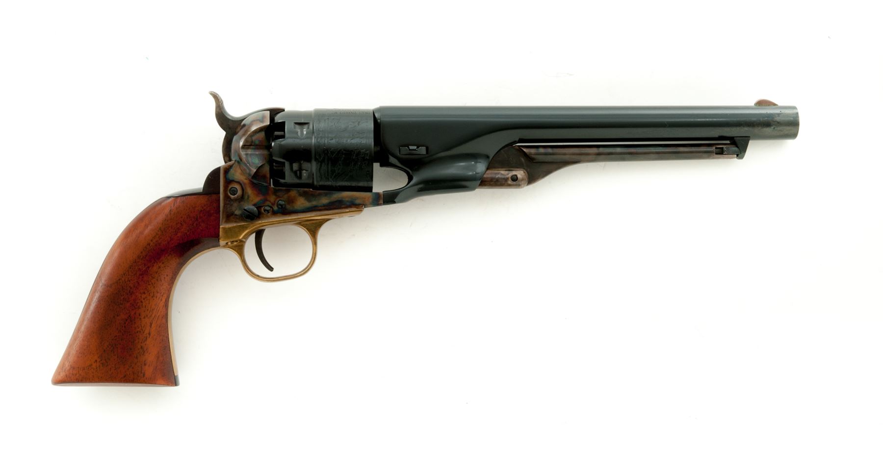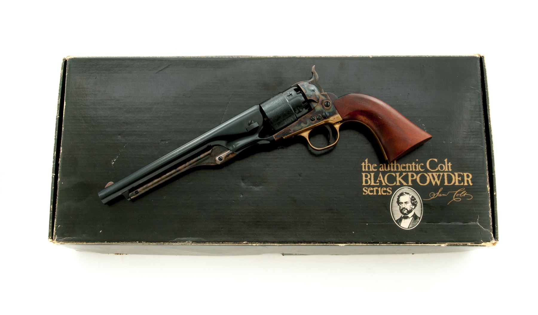 Colt Black Powder Series 1860 Army Revolver, #204746, .44 cal., 8'' barrel, blue and case hardened finish, naval battle scene engraved on cylinder, with smooth wood grips. In original box with hang tag and all associated paperwork. Condition is excellent, appearing as new, with vivid case colors and slight tarnishing to brass gripstrap and triggerguard. Box with minor handling and edgewear. Est.: $700-$900. (No FFL Required)
