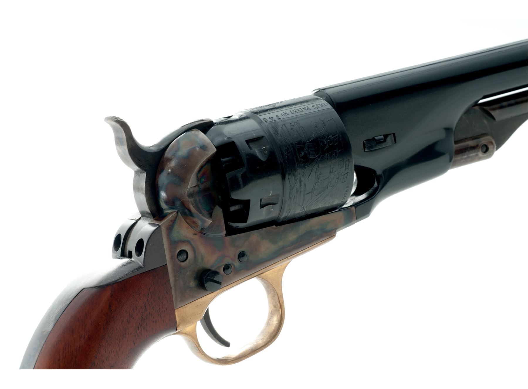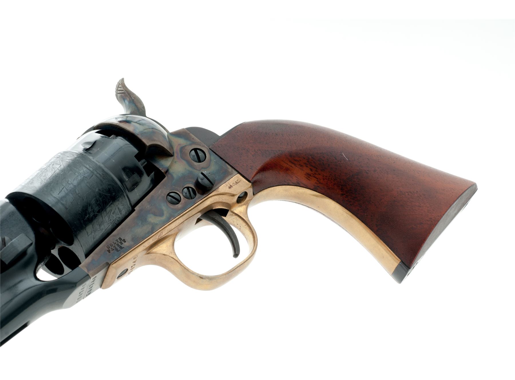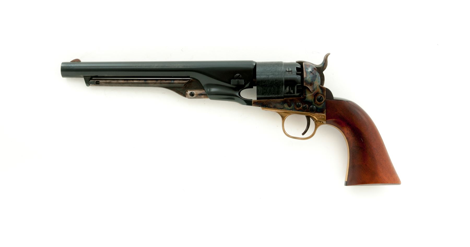 Colt Black Powder Series 1860 Army Revolver, #204746, .44 cal., 8'' barrel, blue and case hardened finish, naval battle scene engraved on cylinder, with smooth wood grips. In original box with hang tag and all associated paperwork. Condition is excellent, appearing as new, with vivid case colors and slight tarnishing to brass gripstrap and triggerguard. Box with minor handling and edgewear. Est.: $700-$900. (No FFL Required)