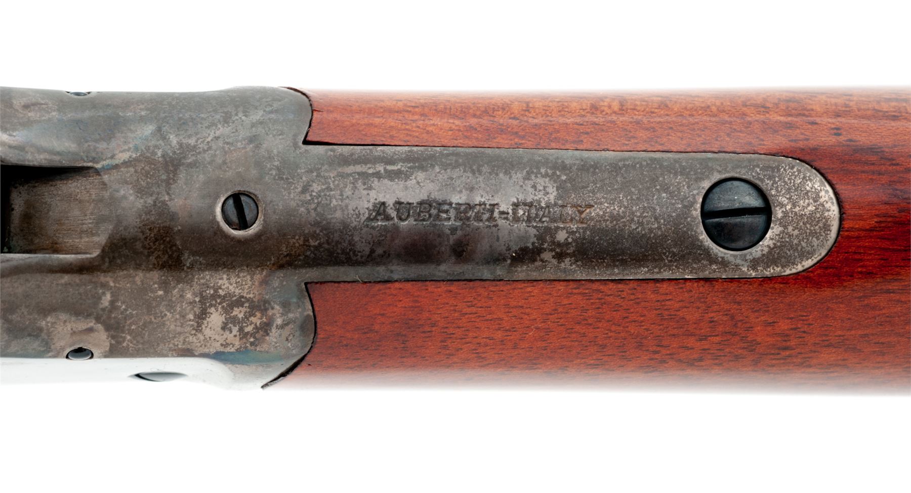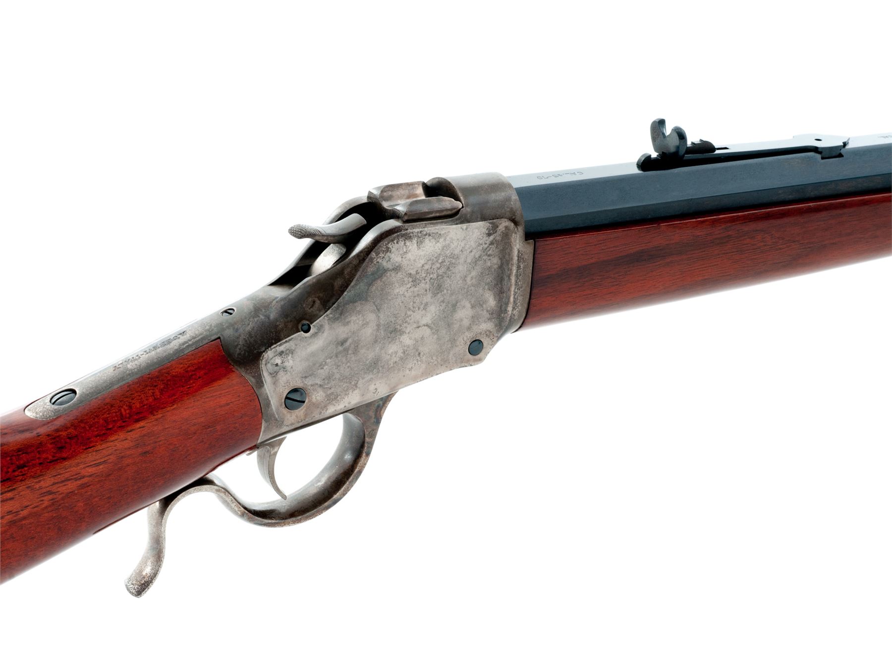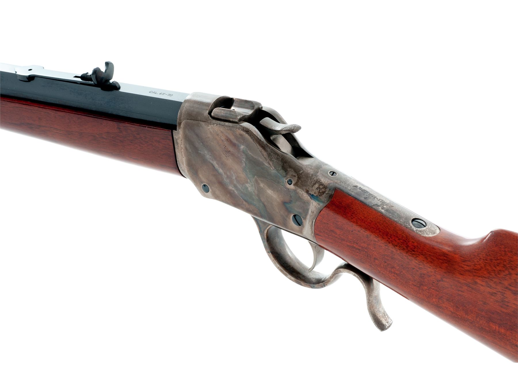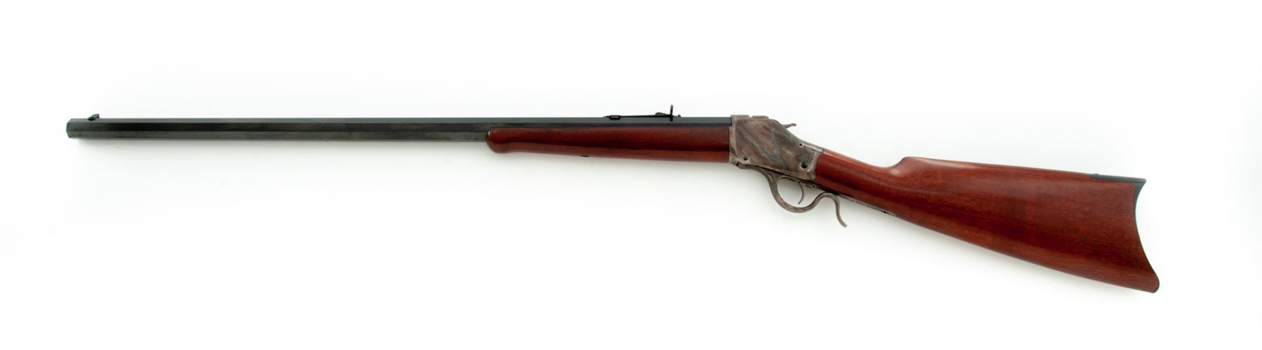 Uberti 1885 High-Wall Single Shot Sporting Rifle, #10178, .45-70 cal., 30'' blued steel octagon barrel, case hardened receiver and lever, semi-gloss finished straight grip walnut stock and forend, blued steel crescent buttplate with brass trapdoor, dovetailed blade front sight and semi-buckhorn rear sight with elevator. Approx. 99%+ of the original barrel finish remains with clear and defined factory lettering. Top and sides of barrel at about the mid-point and the rear sight base with a very fine haze of oxidation (nothing major and wasn't noticed on the barrel until you look at it closely). Receiver and lever with approx. 70% fading case colors, also with some hazy oxidation and darkening to the metal. Buttstock rates excellent with only a few minor handling marks; forend with two moderate impressions and a 3'' long hairline crack to the right side; both retain a nice even color and finish. Excellent action and bright bore. Est.: $400-$700. (Modern)