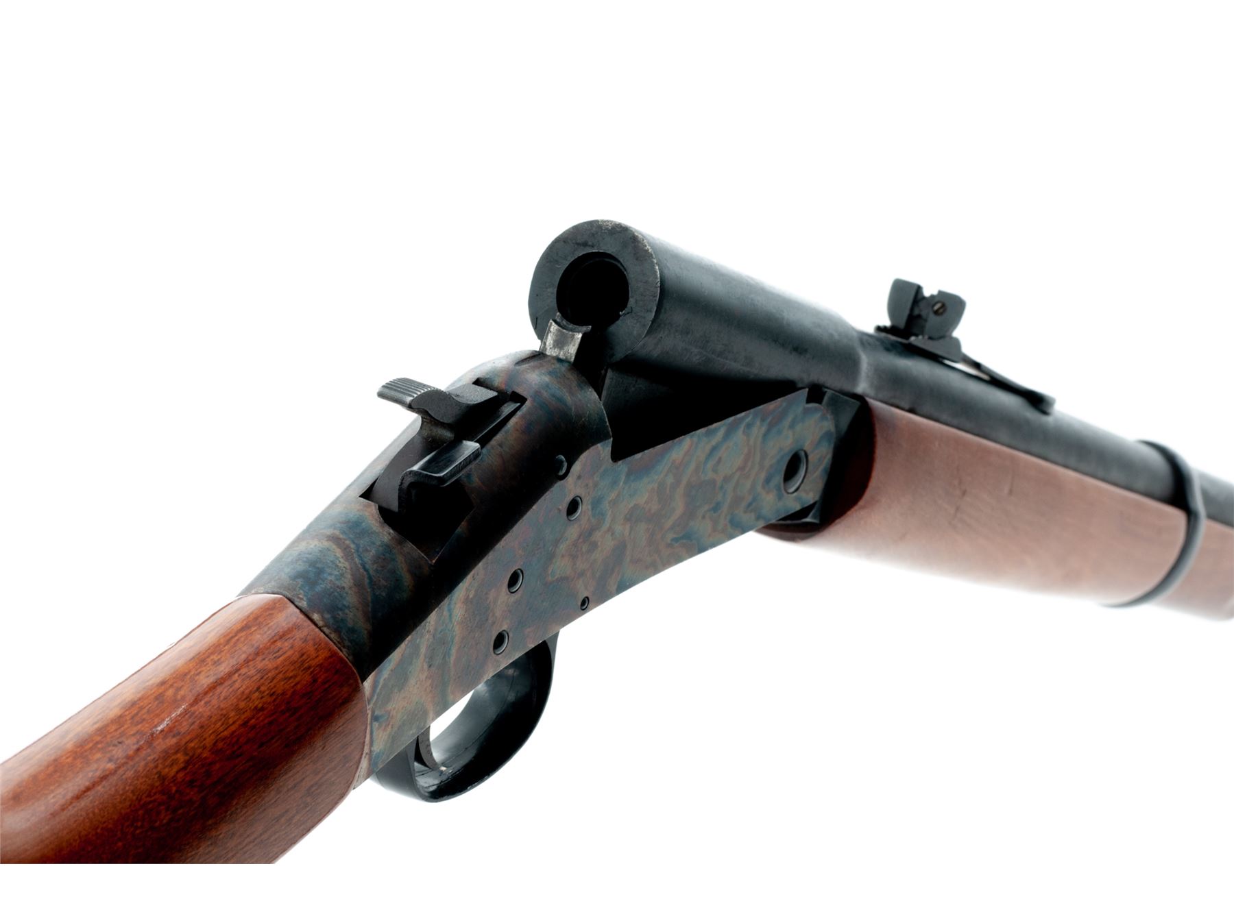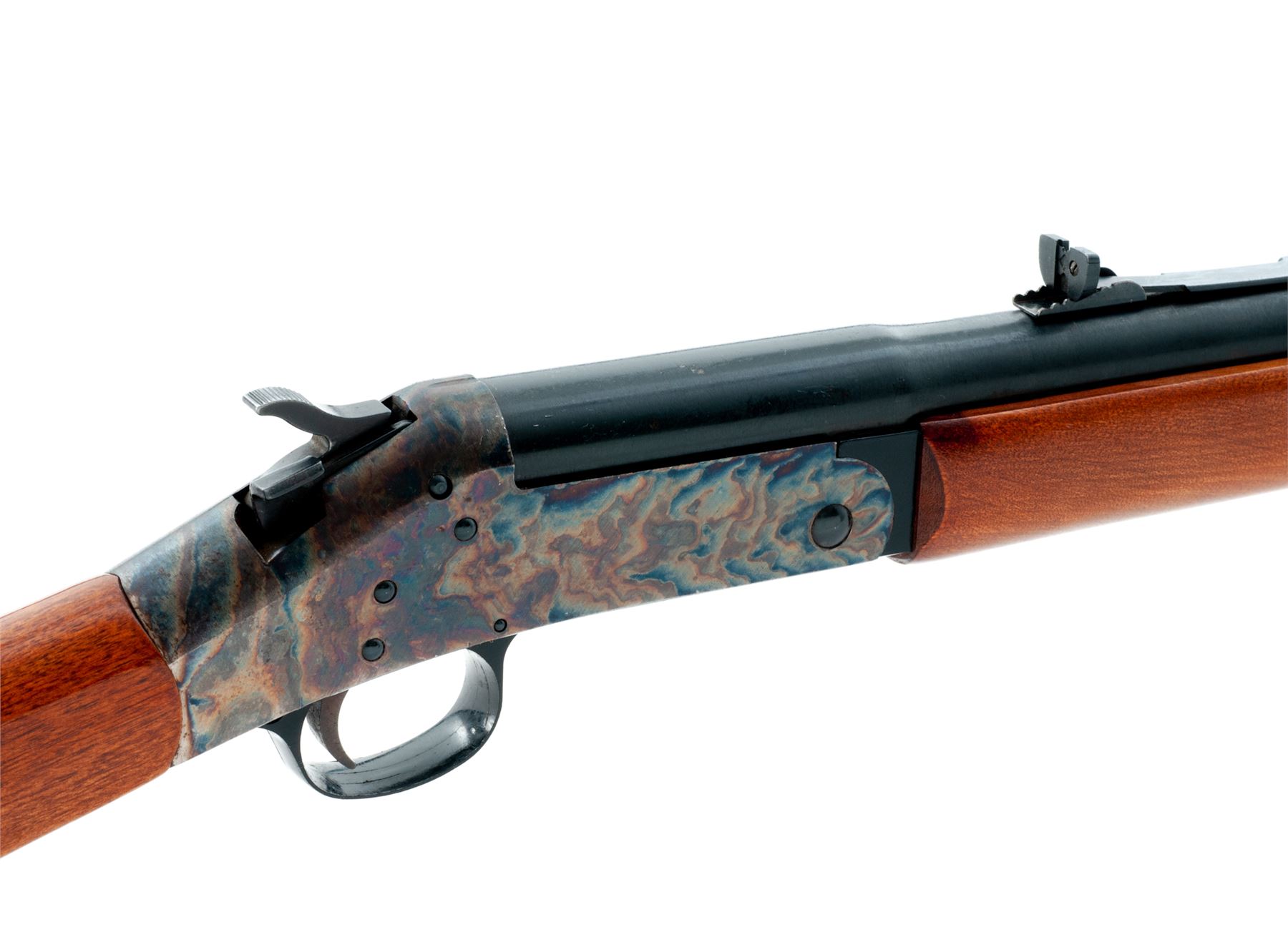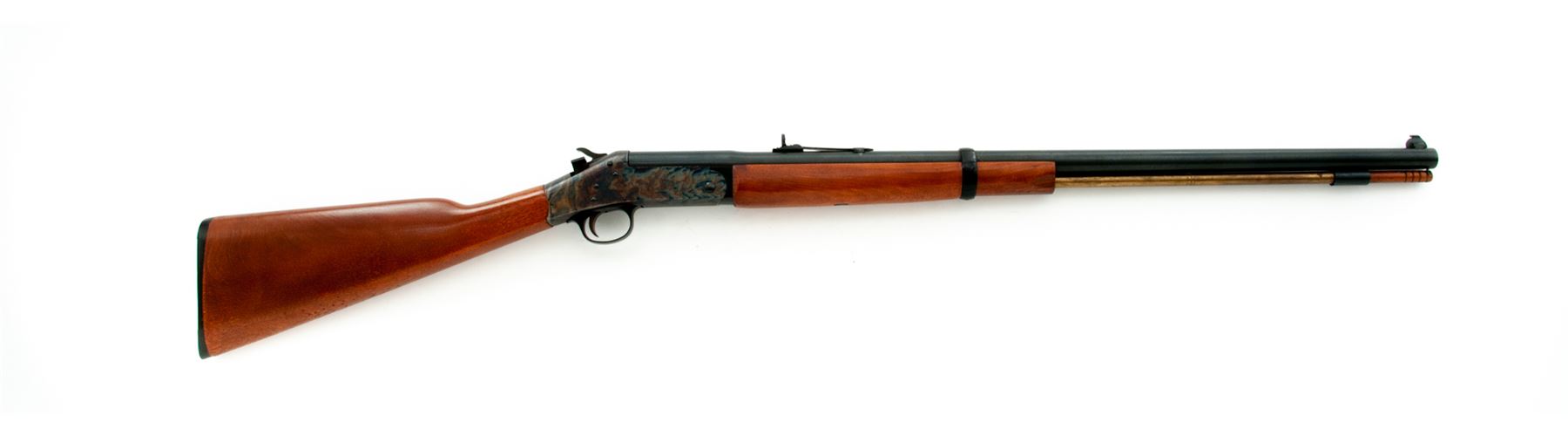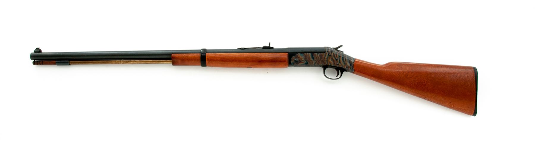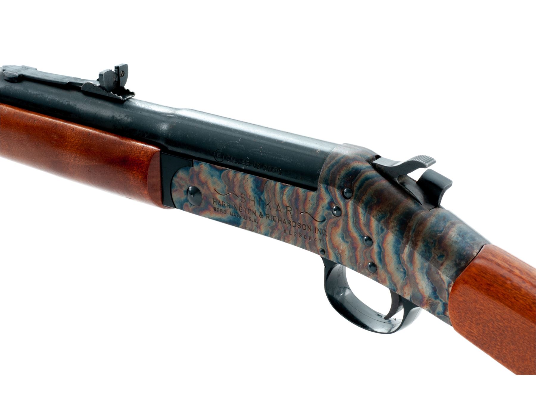 Harrington & Richardson Model 155 ''Shikari'' Big-Bore Single Barrel Tip-Up Rifle, #AL230947, .45-70 Gov't. cal., blued 28'' round barrel with dovetailed bead-blade front and adjustable open rear sights marked ''(circled P) Cal. 45-70 Gov't.'' in one line at left breech; wood-tipped brass under-barrel cleaning rod held by one blued steel ferrule; case hardened receiver is marked on left side ''Shikari'' with the maker's name, address and serial number in three lines; varnished hardwood forestock retained by a single blued barrel band and buttstock with grooved hard rubber buttplate having the entwined ''H&R'' logo within a circular panel. Condition is excellent retaining approx. 97% original barrel blue, showing scattered scratches and fiery case hardened colors. Stocks are smooth and solid showing only light handling marks. Action functions as designed; bore is bright with defined rifling. Est.: $300-$500. (Modern)