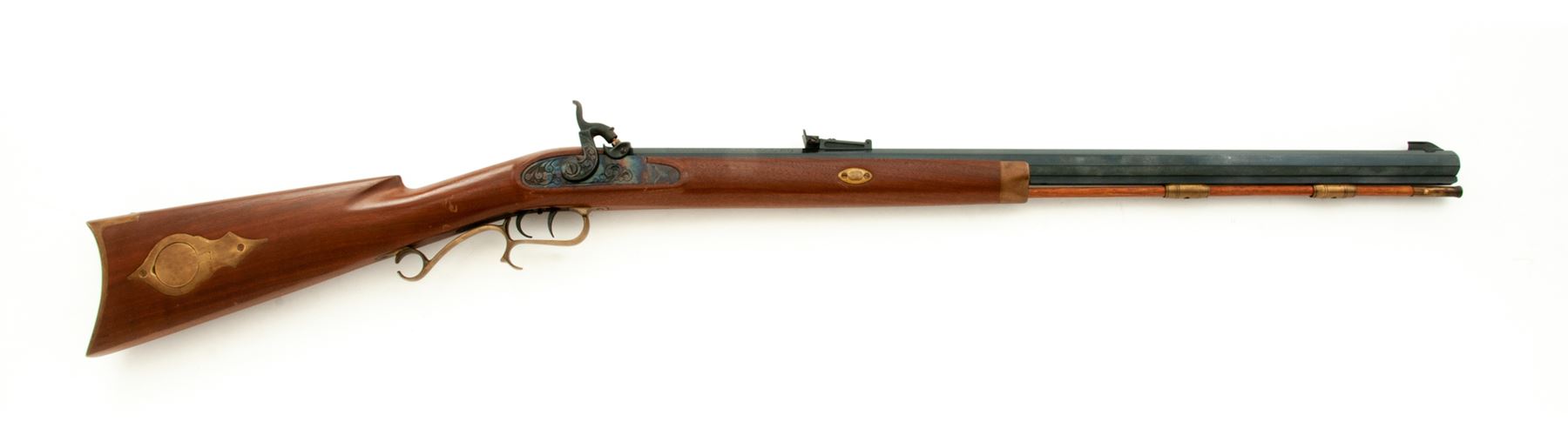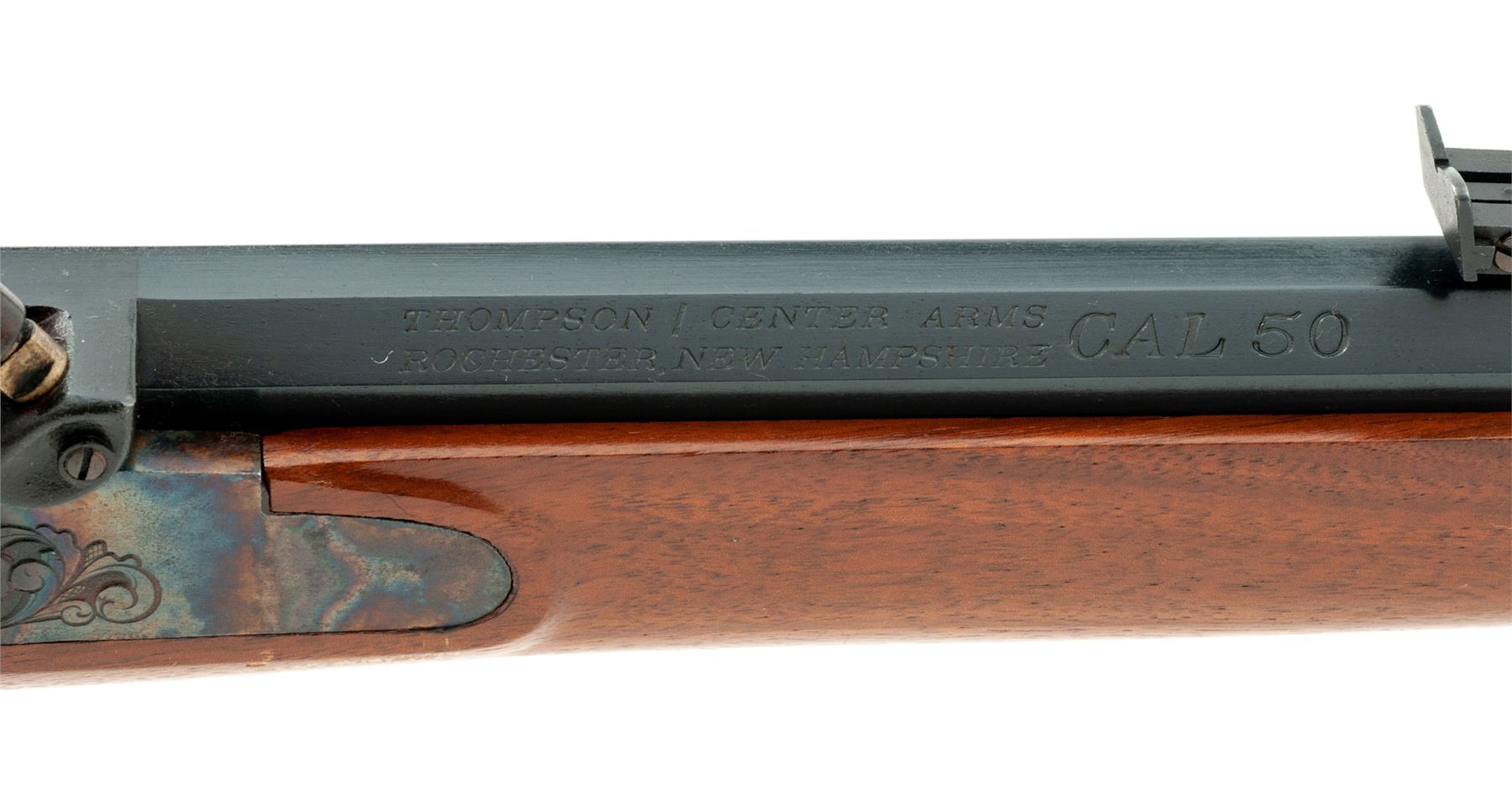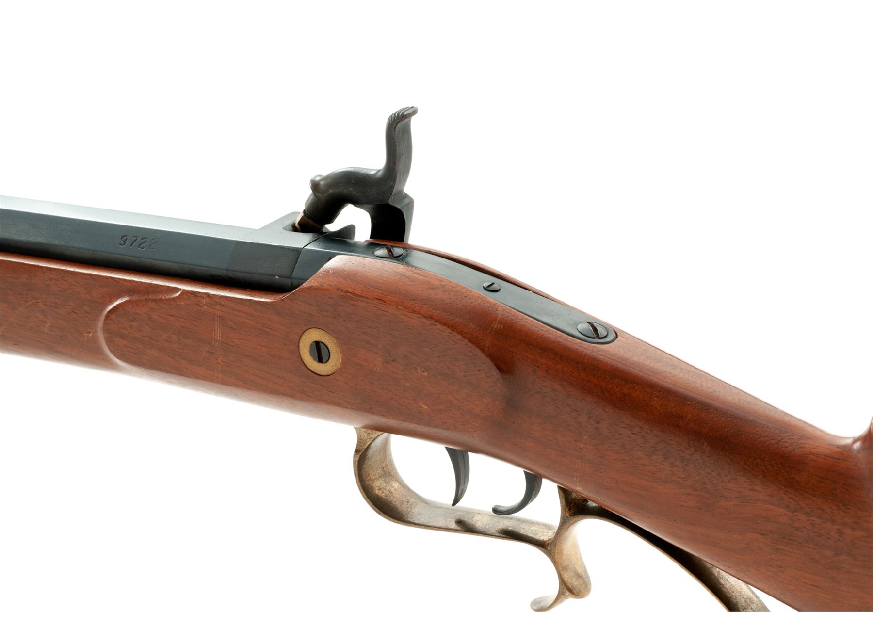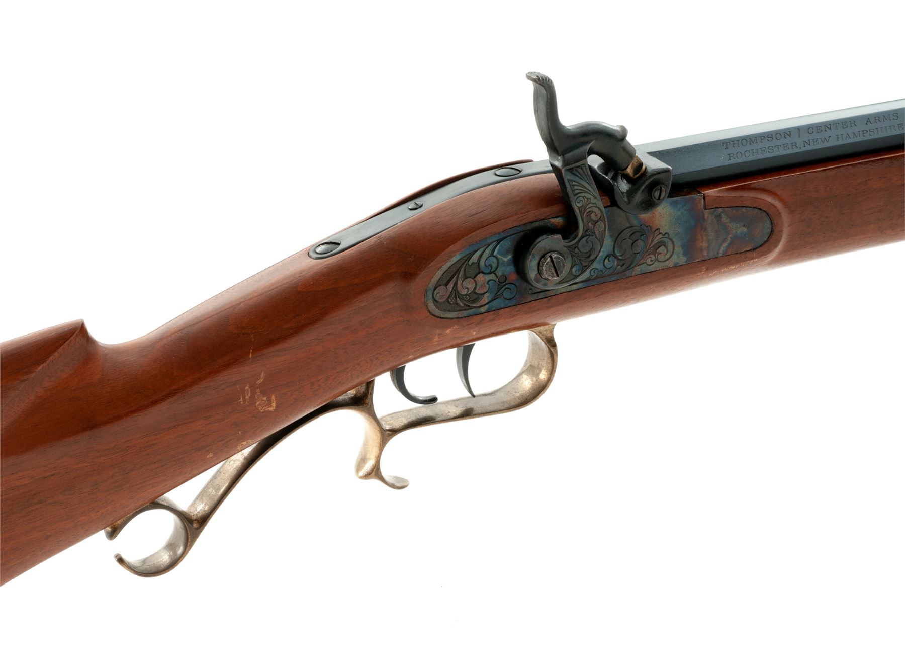 Thompson Center Arms Hawken Type Percussion Muzzleloading Black Powder Rifle, #9722, .50 cal., 28'' barrel, blue finish, case colored lock, one-piece wood stock with brass patch box and hardware, dovetailed blade front sight with bead and notched rear sight adjustable for both windage and elevation, double-set trigger, with ramrod. Metal surfaces rate as excellent with approx. 98%+ original blue and case colors; brass shows moderate toning. Stock with scattered mostly small dings and scratches, with a larger scratch to the left side of the buttstock. Set triggers function properly and the action is smooth. Bore is bright with excellent rifling. Est.: $150-$250. (No FFL Required)