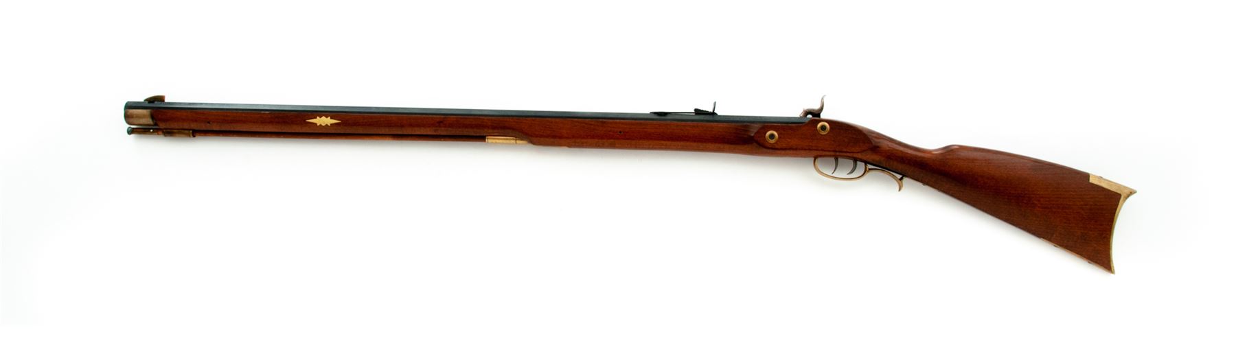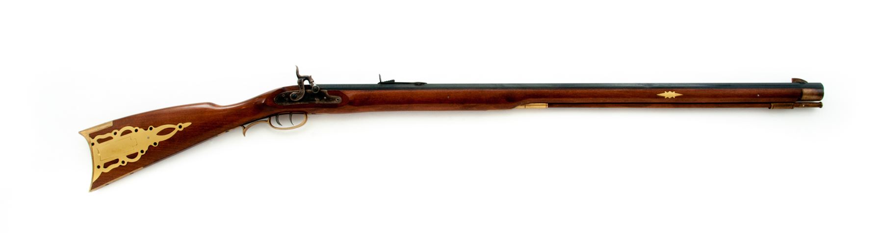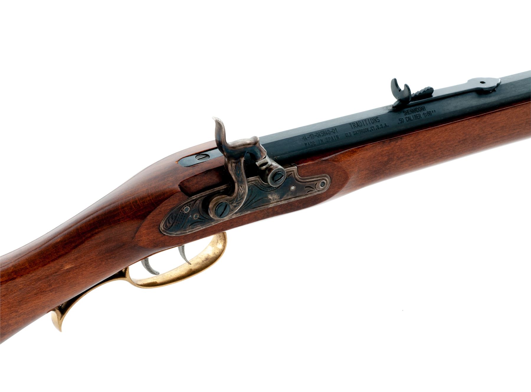 Reproduction ''Shenandoah'' Fullstock Plains Style Percussion Rifle, by Traditions, #14-13-045840-01, .50 cal., 33-1/2'' blued octagonal barrel with a dovetailed long brass-blade front and adjustable open rear sights is marked on right angled flat ahead of breech with the serial number, ''Traditions'' and ''Shenandoah'' over ''Made in Spain Old Saybrook, CT U.S.A. .50 Caliber 1:88'''' in two lines, with a ''Black Powder or Pyrodex Only'' cautionary message on left. Engraved flush-mounted case hardened lockplate and matching hammer; double set triggers; brass furniture including lock screw escutcheons, triggerguard with rear finger-rest, crescent buttplate with long lower tang, fancy pierced patchbox with hinged cover over trap for patches and spare parts, two ramrod thimbles, star escutcheons on either side of forestock, nosecap, and brass-tipped hardwood ramrod; varnished walnut ''Roman Nose'' fullstock. Condition is as new, probably unfired, the barrel retaining all of its original deep black-blue, the brass with a light patina. Stock with all of its original smooth varnish finish and only 2 or 3 very minor handling marks. Action is smooth and crisp; bore appears new showing blue inside and sharp rifling. Est.: $200-$400. (No FFL Required)
