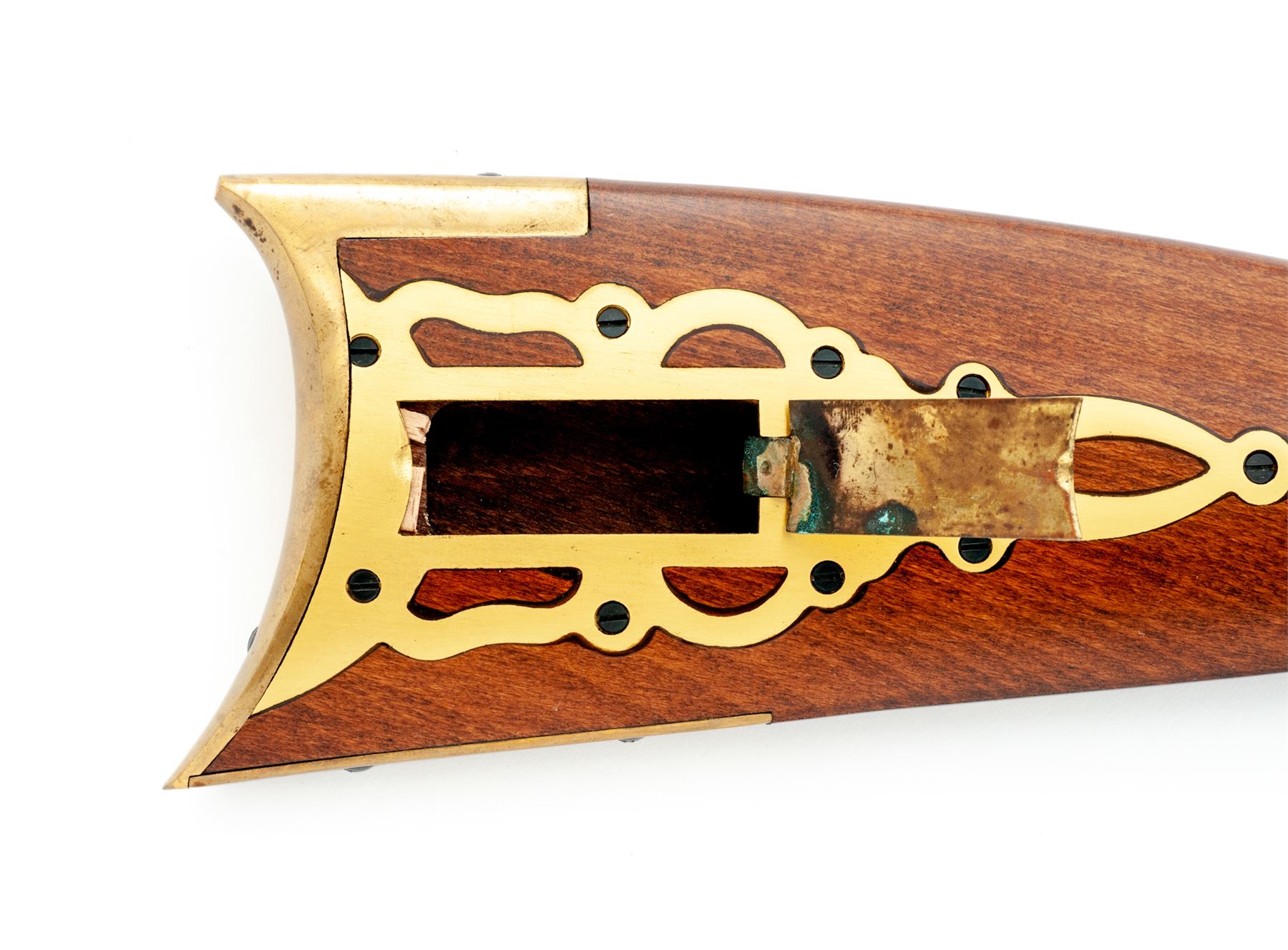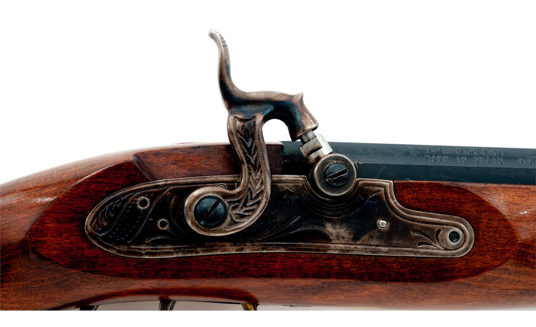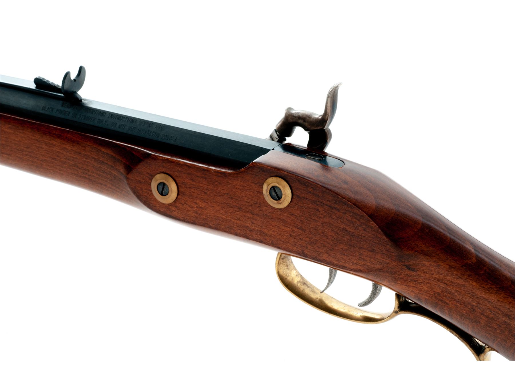 Reproduction ''Shenandoah'' Fullstock Plains Style Percussion Rifle, by Traditions, #14-13-045840-01, .50 cal., 33-1/2'' blued octagonal barrel with a dovetailed long brass-blade front and adjustable open rear sights is marked on right angled flat ahead of breech with the serial number, ''Traditions'' and ''Shenandoah'' over ''Made in Spain Old Saybrook, CT U.S.A. .50 Caliber 1:88'''' in two lines, with a ''Black Powder or Pyrodex Only'' cautionary message on left. Engraved flush-mounted case hardened lockplate and matching hammer; double set triggers; brass furniture including lock screw escutcheons, triggerguard with rear finger-rest, crescent buttplate with long lower tang, fancy pierced patchbox with hinged cover over trap for patches and spare parts, two ramrod thimbles, star escutcheons on either side of forestock, nosecap, and brass-tipped hardwood ramrod; varnished walnut ''Roman Nose'' fullstock. Condition is as new, probably unfired, the barrel retaining all of its original deep black-blue, the brass with a light patina. Stock with all of its original smooth varnish finish and only 2 or 3 very minor handling marks. Action is smooth and crisp; bore appears new showing blue inside and sharp rifling. Est.: $200-$400. (No FFL Required)