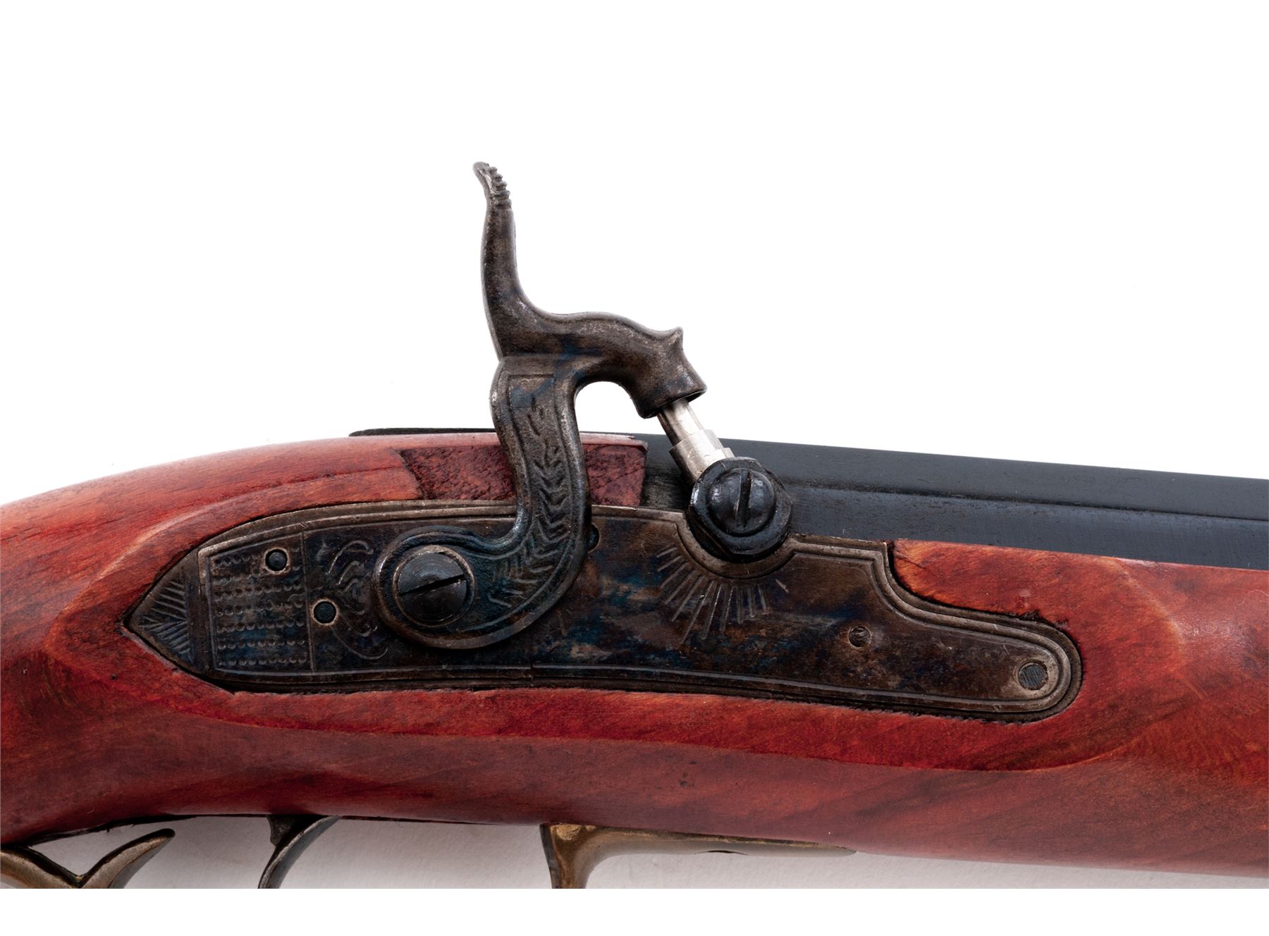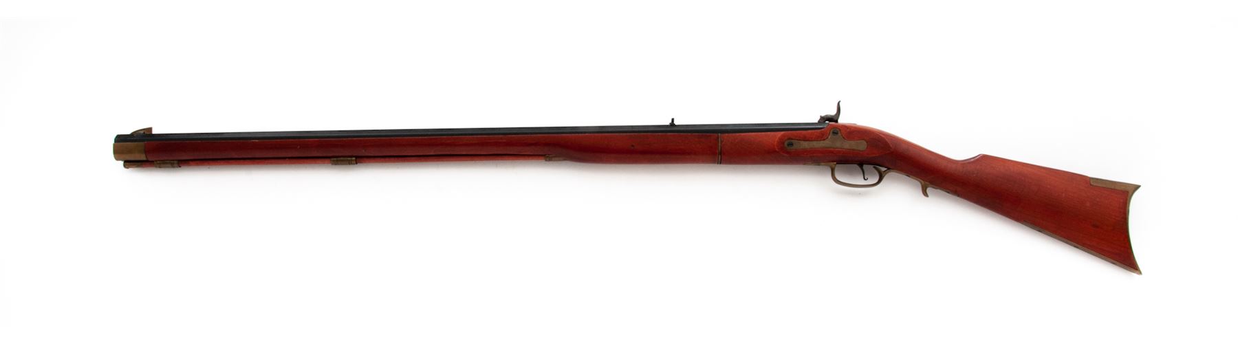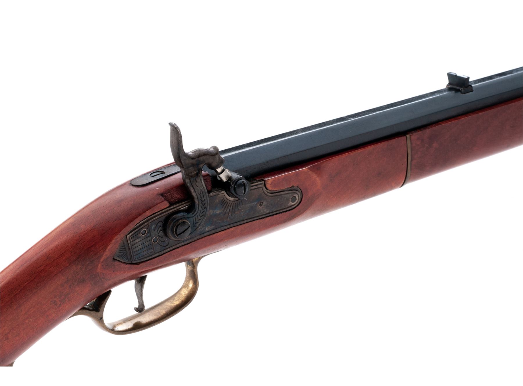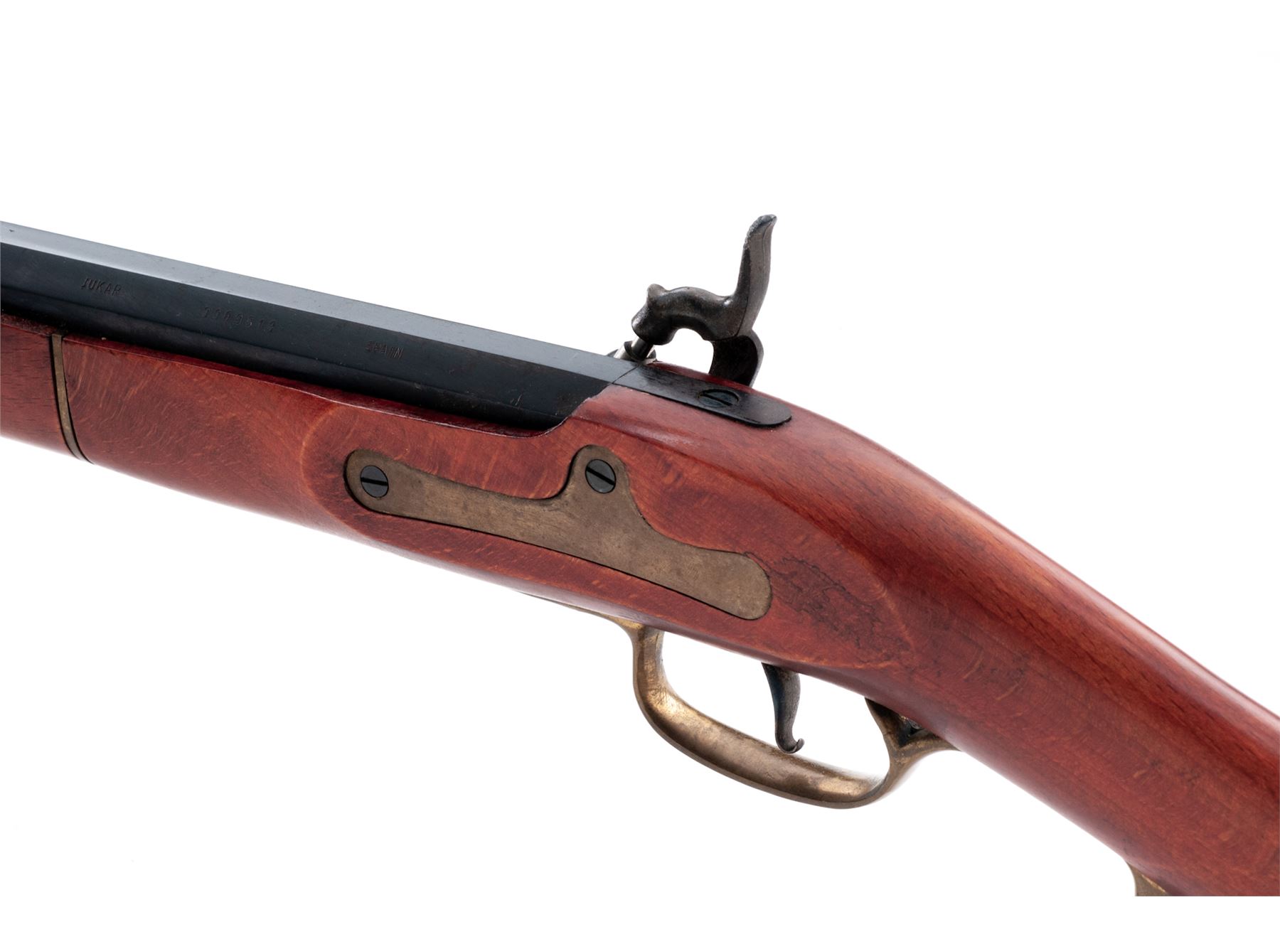 Modern Fullstock Plains Style Percussion Rifle, #0009613, 33.5'' blued octagonal barrel with dovetailed brass long-blade front and dovetailed open rear sight, marked on left angled flat ahead of breech ''Jukar'', the serial number and ''Spain'' in one line; engraved flush-mounted case hardened lockplate, matching hammer, and trigger with early-style curled tail; brass furniture including serpentine sideplate, triggerguard with finger rest at rear, crescent buttplate with long lower tang, a 1/8'' fillet where the two stock halves are joined, three ramrod thimbles, nosecap, and brass-tipped hardwood ramrod; varnish walnut fullstock. Condition is excellent, probably unfired, the barrel retaining approx. 98% original deep blued finish, the lockplate and hammer with vivid case colors. Stocks have all of their original reddish varnish finish with perhaps one or two very minor handling marks. Action is smooth and stout; bore is clean and bright showing sharp rifling. Est.: $250-$400. (No FFL Required)