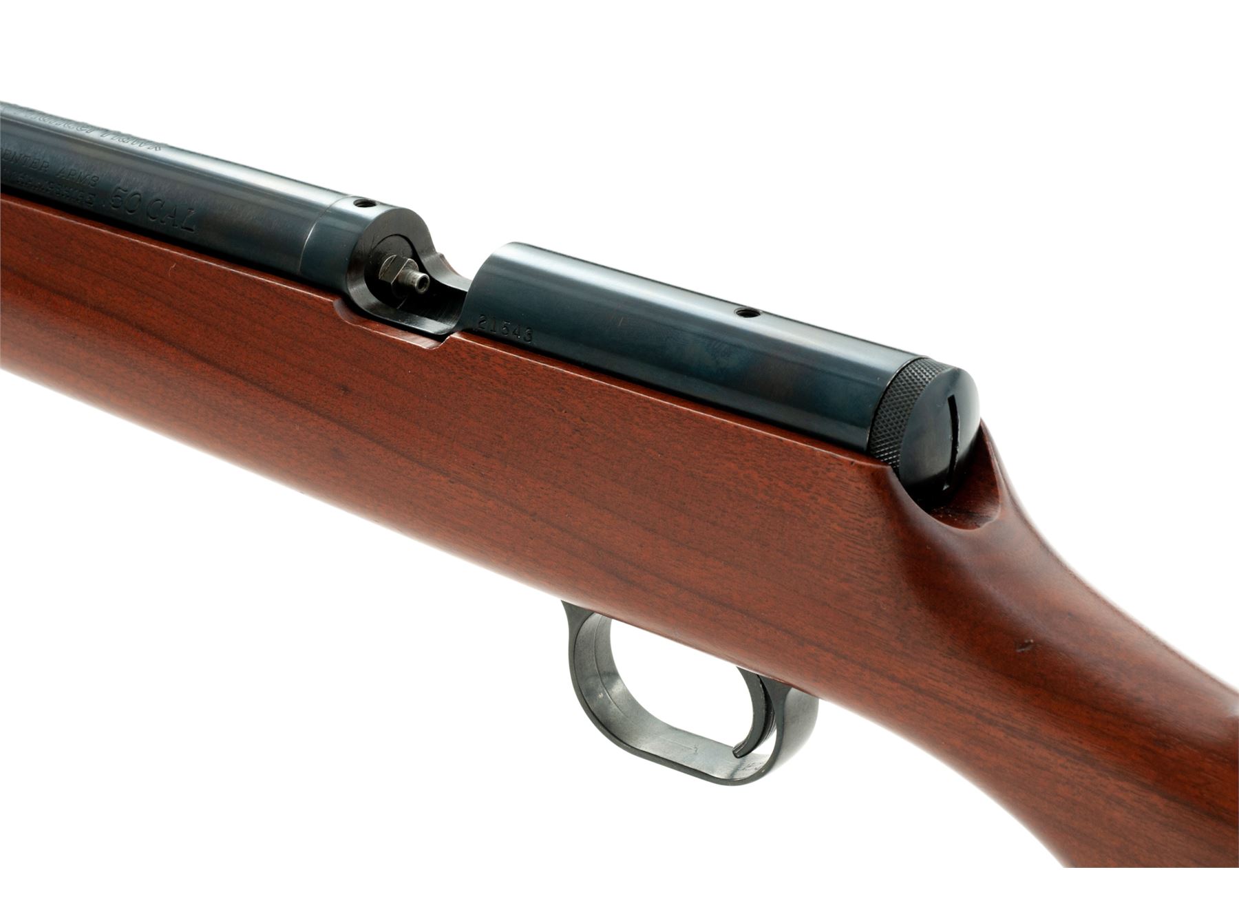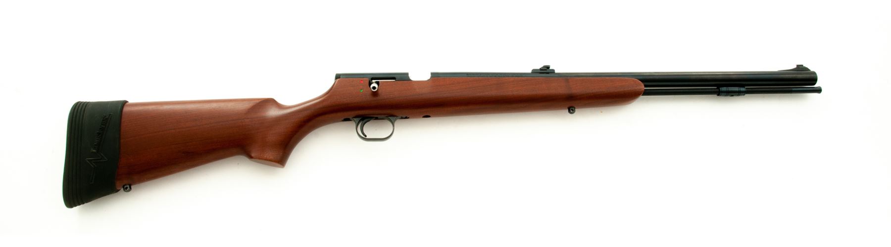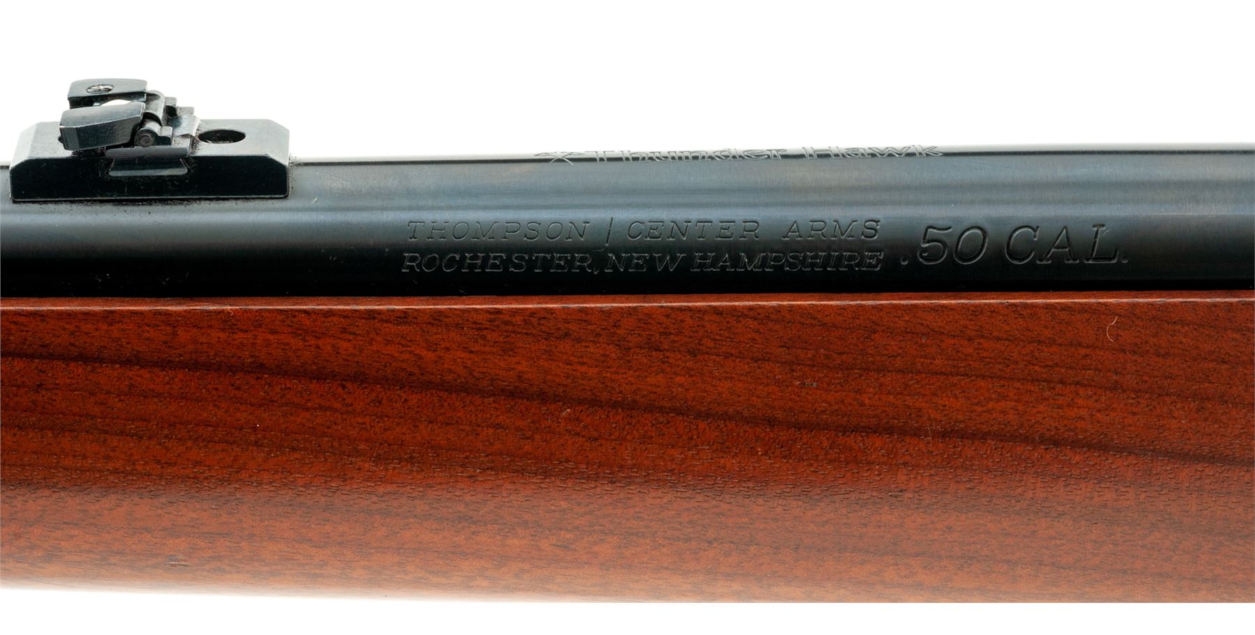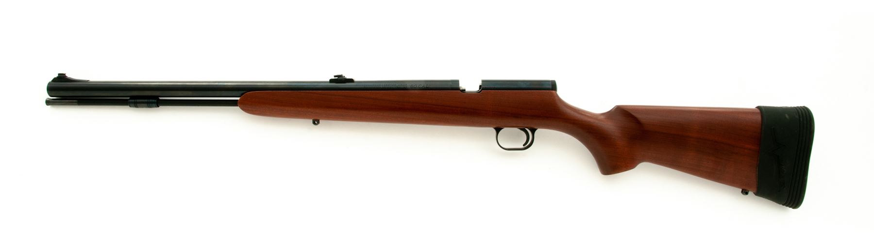 Thompson Center Arms Thunder Hawk In-Line Black Powder Muzzleloading Rifle, #21543, .50 cal., 21'' barrel, blue finish, one-piece pistol-grip walnut stock, with original black rubber TC recoil pad, and slipover Limb Saver pad, sling swivel studs, brass bead front sight dovetailed into a ramped base, folding rear sight, with ramrod. Condition is excellent with approx. 99%+ remaining factory finishes showing only a few minor handling marks to the wood and metal. Factory lettering is crisp. Excellent smooth action and mirror bright bore. Stock does not show any noticeable discoloration from the slip-on recoil pad. Est.: $150-$250. (No FFL Required)