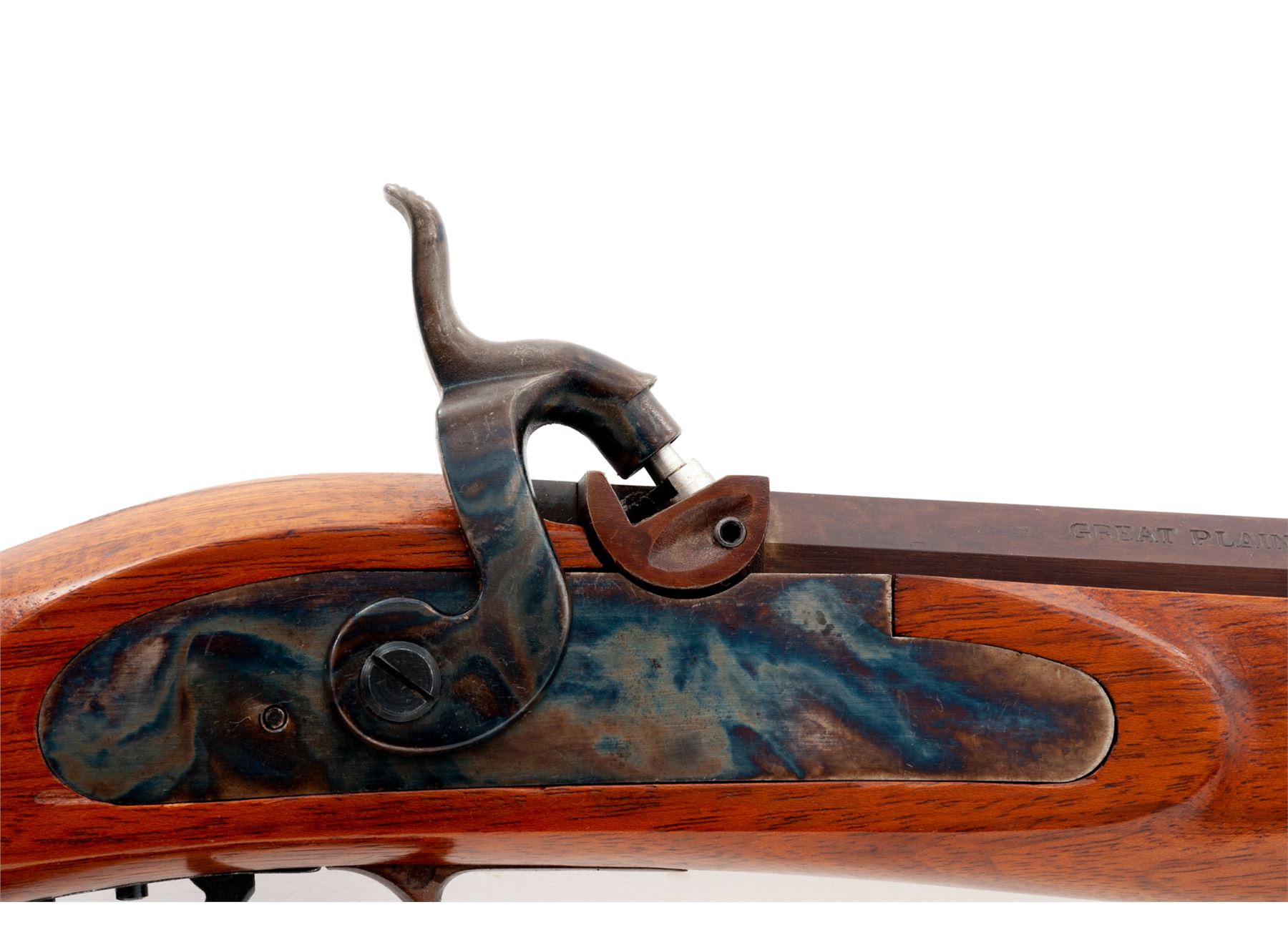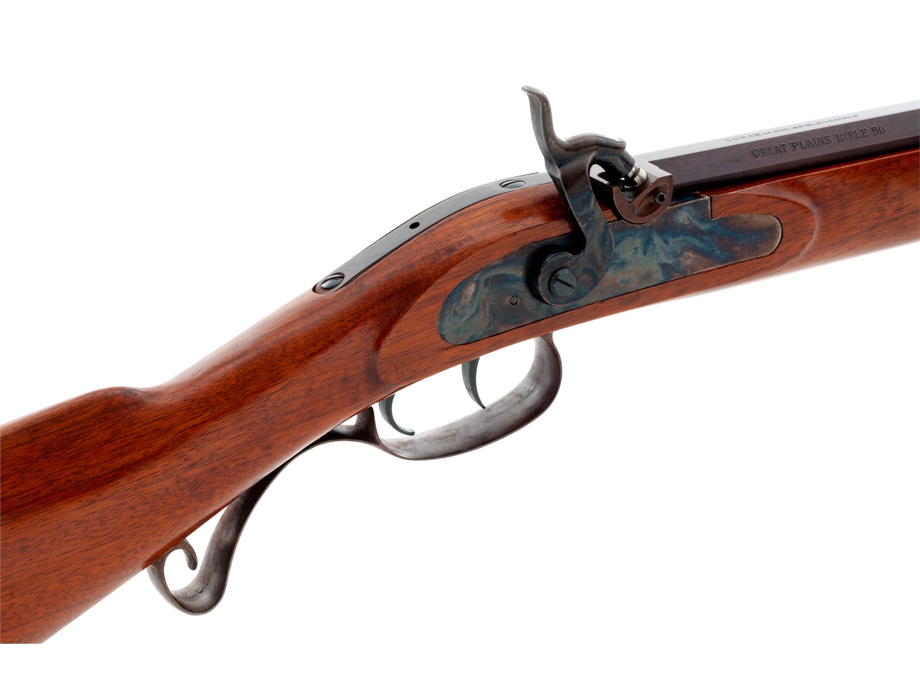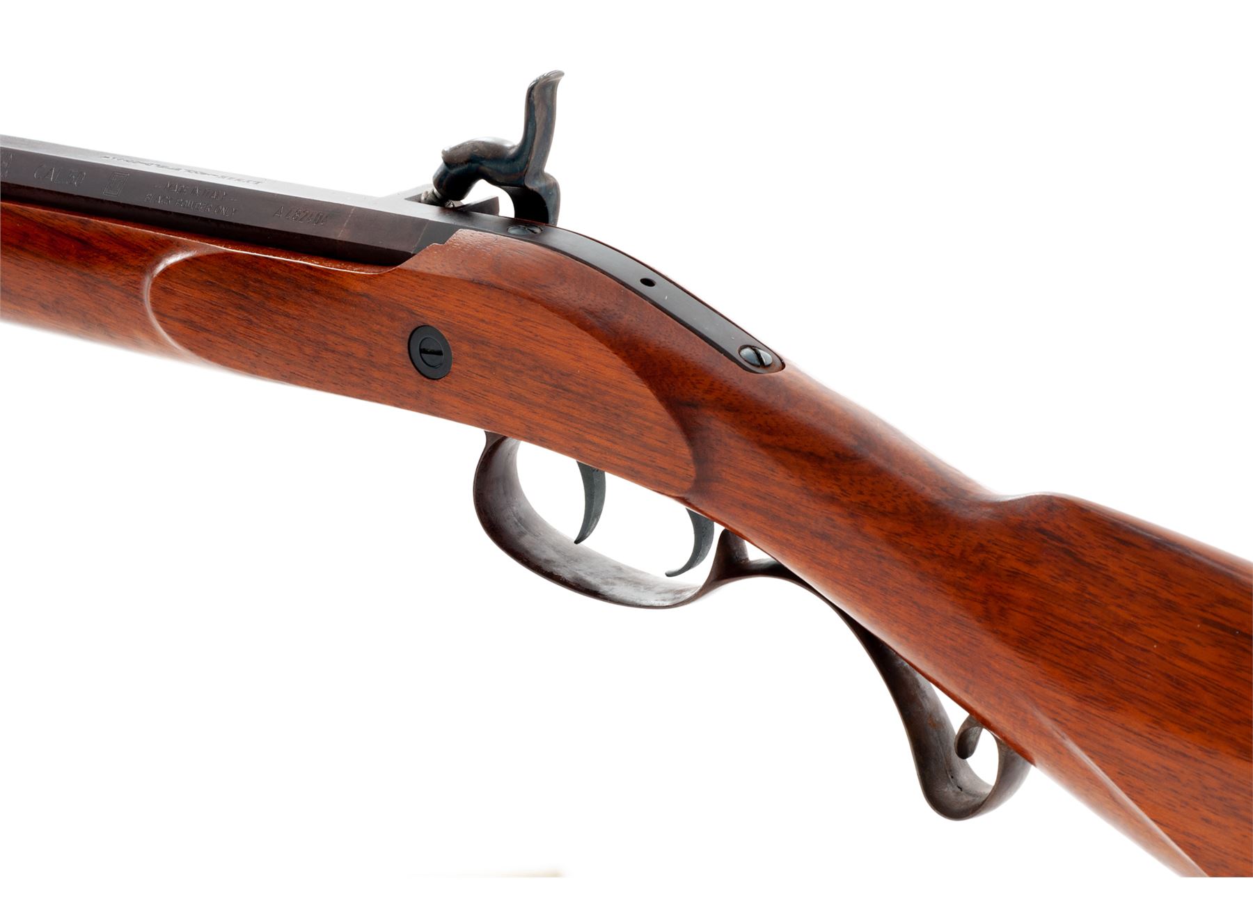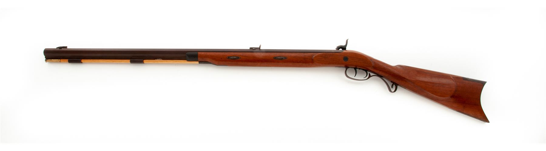 Modern Halfstock Plains Style Percussion Rifle, by Lyman, #A482404, .50 cal., 33'' browned octagonal barrel with a dovetailed long blade front and adjustable open rear sights. Undecorated flush-mounted case hardened lockplate and matching hammer; double set triggers; browned steel furniture including scrolled triggerguard, crescent buttplate with long lower tang, two barrel wedges with oval escutcheons, three ramrod thimbles, nosecap; brass-tipped hardwood ramrod; varnished walnut halfstock with carved cheekpiece on left side. Condition is as new, probably unfired, the barrel retaining all of its original deep browned finish, as do the balance of the steel parts, the lockplate and hammer with vivid case colors. Stock with all of its original smooth varnish finish, nice coloration and perhaps 1 or 2 very minor handling marks. Action is smooth and crisp; bore is clean and bright showing sharp rifling. Est.: $250-$400. (No FFL Required)