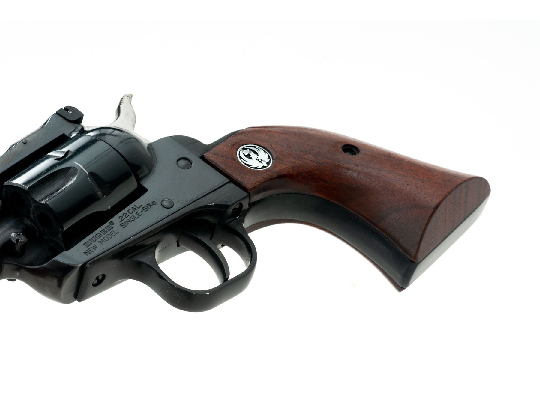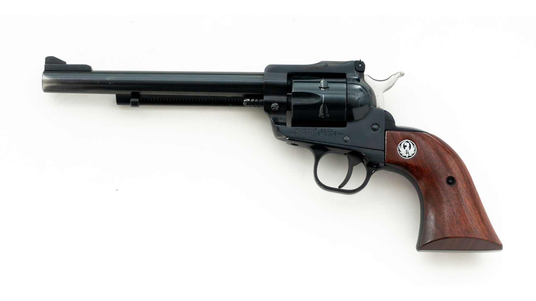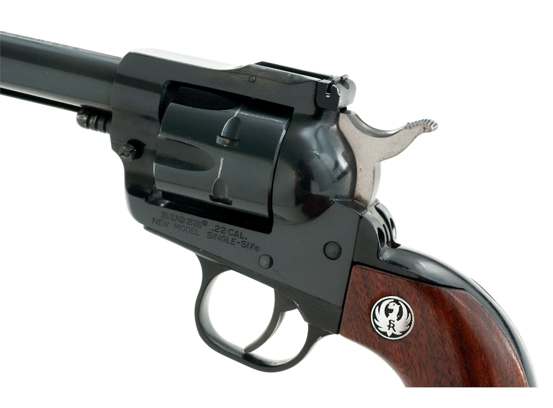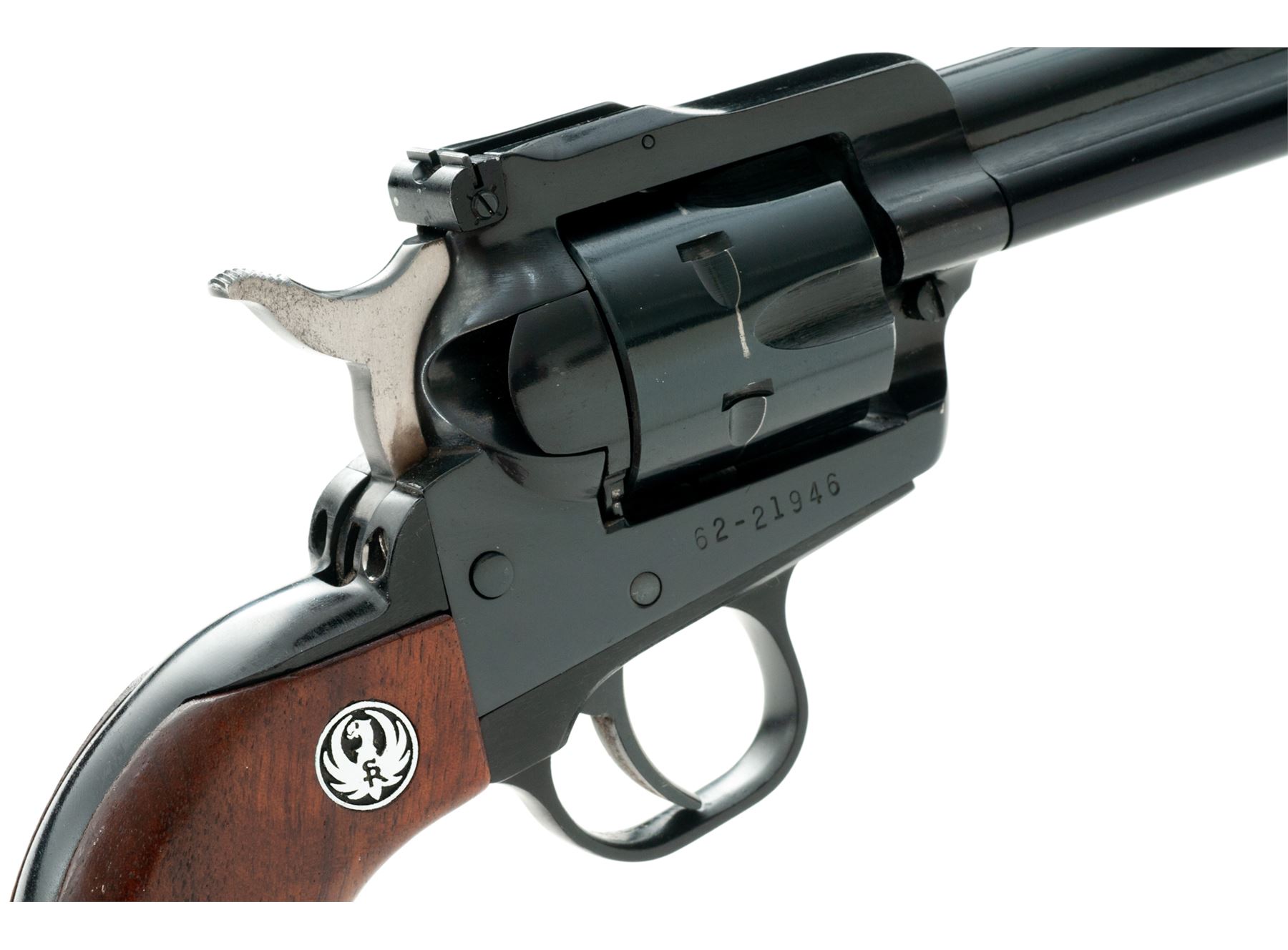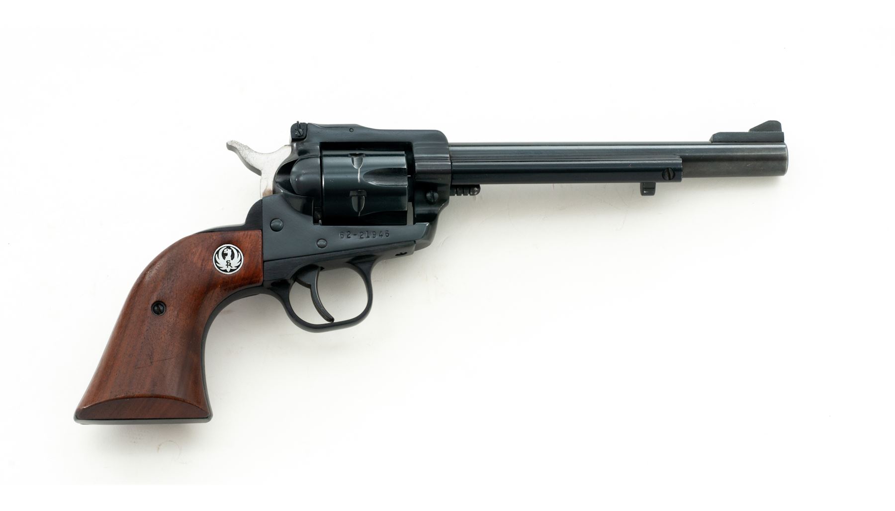 Ruger New Model Super Single-Six Single Action Revolver, #62-21946, .22 LR cal., 6.5'' barrel, blue finish, smooth walnut grips with Ruger ''silver eagle'' medallions, ramped blade front sight and fully adjustable rear sight. Cylinder numbers are a little hard to read but it appears to be numbered to the gun. Condition overall is very good as partially refinished, with approx. 96% finish remaining on metal surfaces. Barrel finish is original with light wear at the muzzle; triggerguard has been repainted black; frame looks like it was refinished, left side with a few small spots of very fine pitting that have been blued over. Factory lettering is clear and defined. Grips show moderate small handling marks. Crisp action, cylinder with a moderate index line; bright bore rates near excellent. An early ''New Model'' Single-Six mfg'd in 1973. Est.: $150-$300. (Modern/PPT)