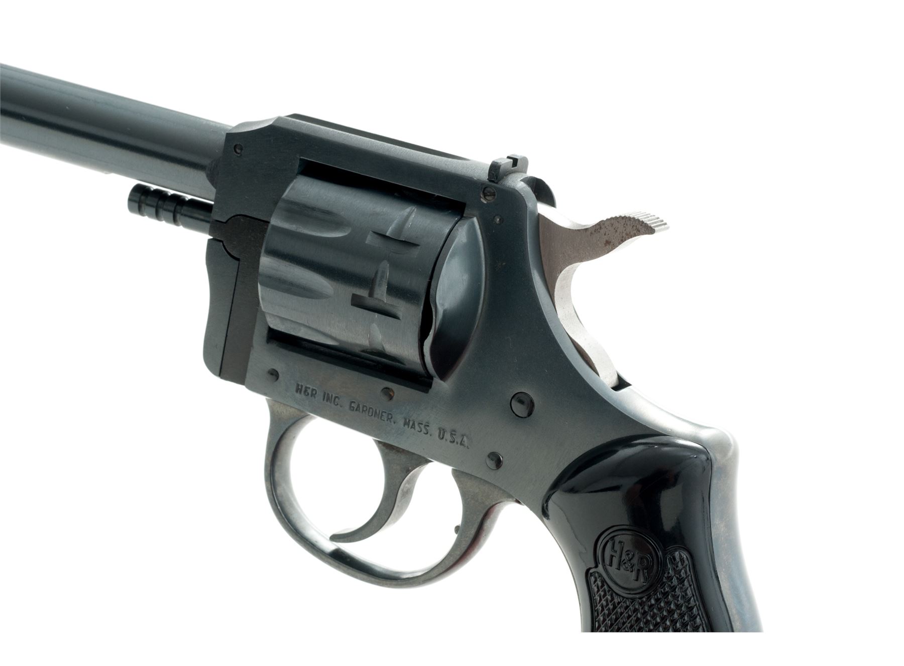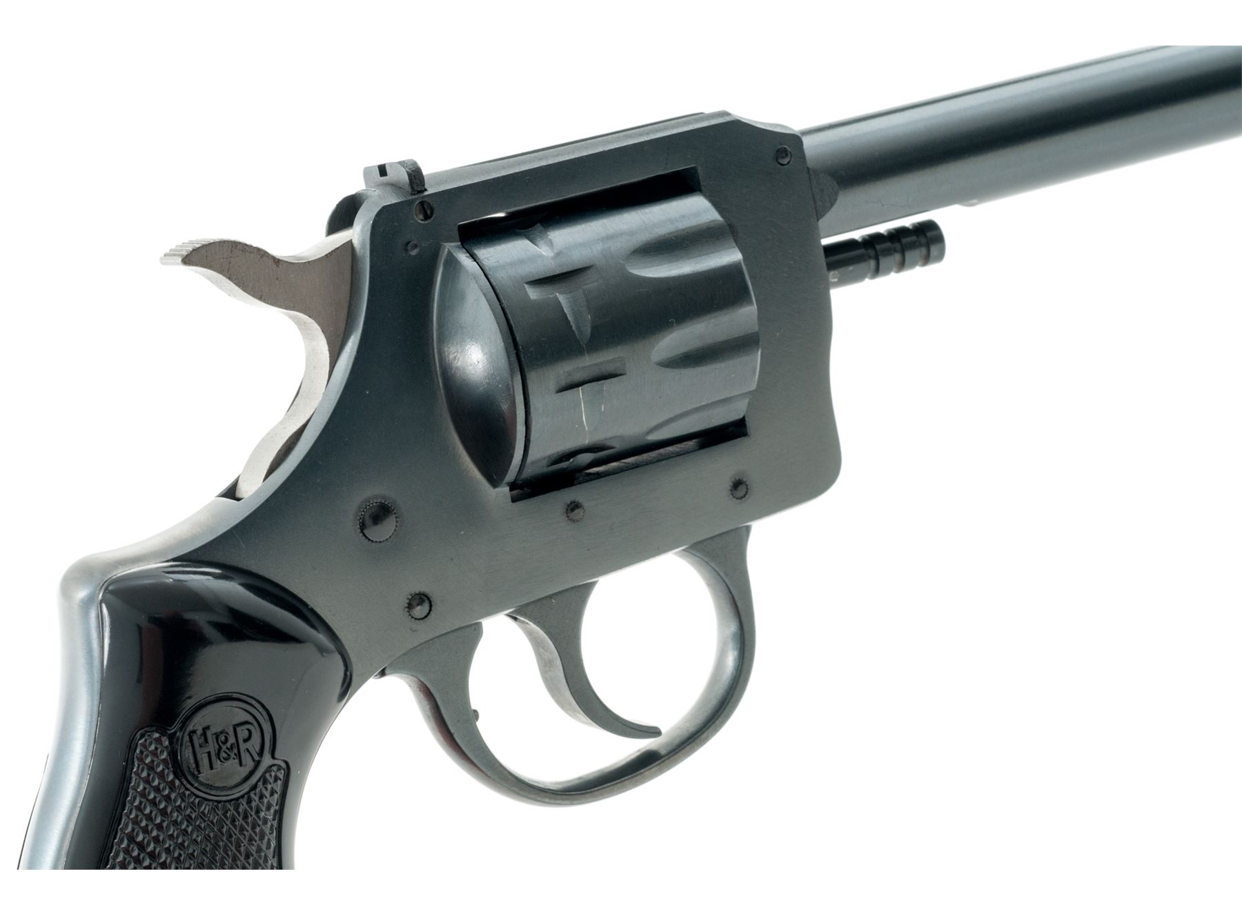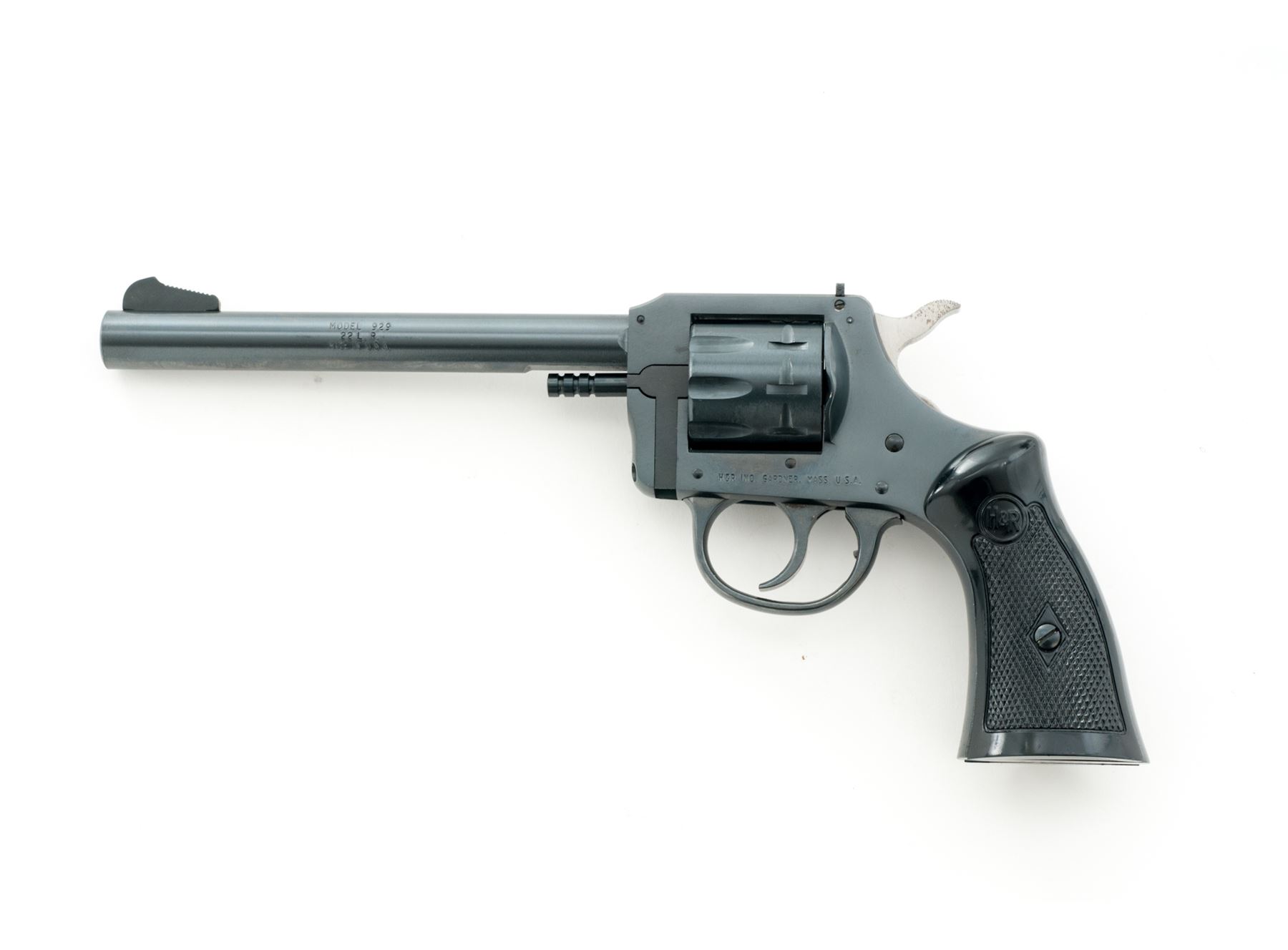 Harrington & Richardson Model 929 ''Sidekick'' Second Model Double Action Revolver, #AT098296, .22 LR cal., 9-shot, 6'' barrel, blue finish, checkered black plastic H&R grips, serrated blade front sight and square notched rear sight. Overall condition is excellent with approx. 98%+ original blue finish. Metal shows only normal light handling marks; cylinder with a very light index line. Grips with a few normal light handling marks, checkering is clean, both with no chips or cracks. Hammer with some tiny specks of darker spotting. Excellent crisp action and bright bore. Est.: $150-$250. (Modern/PPT)