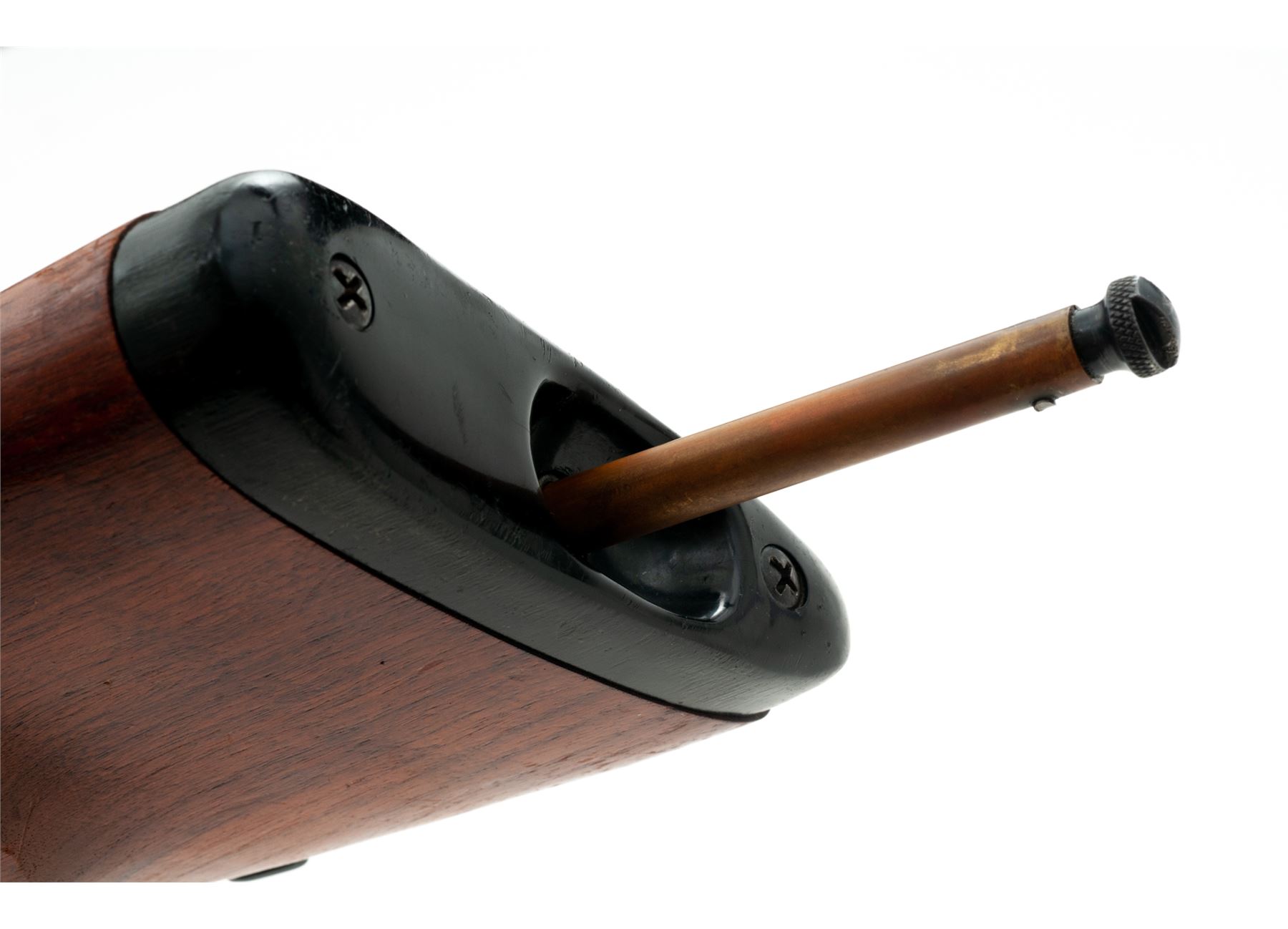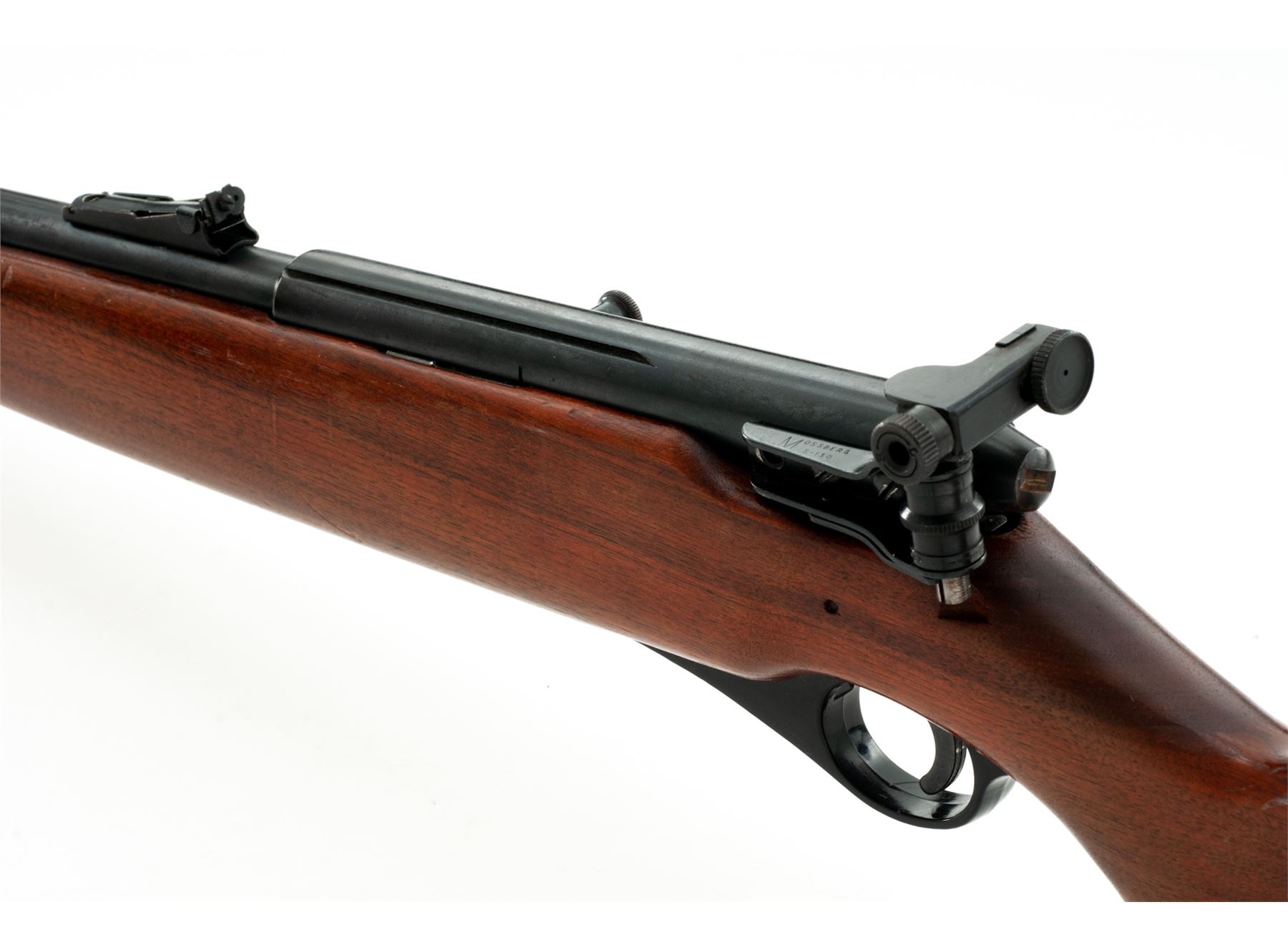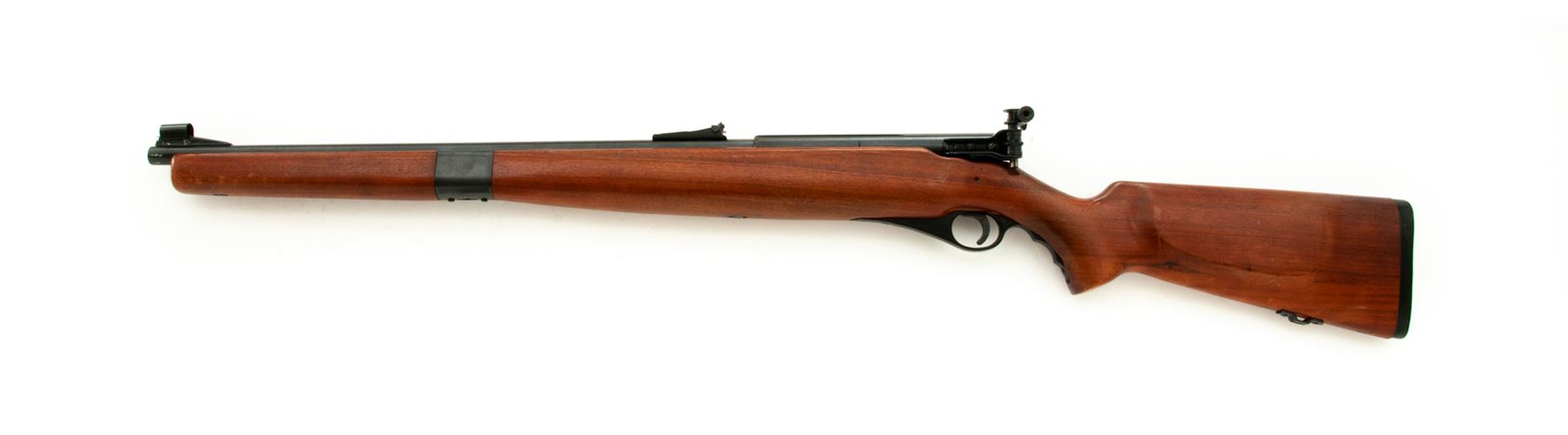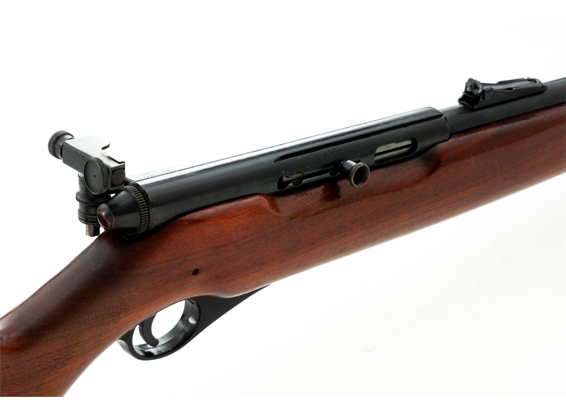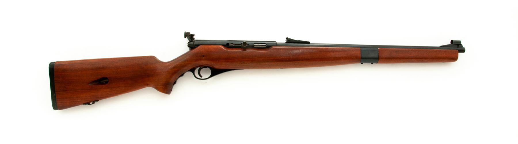 Mossberg Model 151M-B Semi-Automatic Rifle, NVSN, .22 LR cal., 20'' barrel, blue finish, mahogany stock, standard front and rear sight, as well as a Mossberg S-130 peep sight. Condition is fine. Blue surfaces retain approx. 96% finish. Stock with just light to moderate scuffs and scratches in cheekpiece area. Bore is fine. Est.: $150-$300. (C&R)