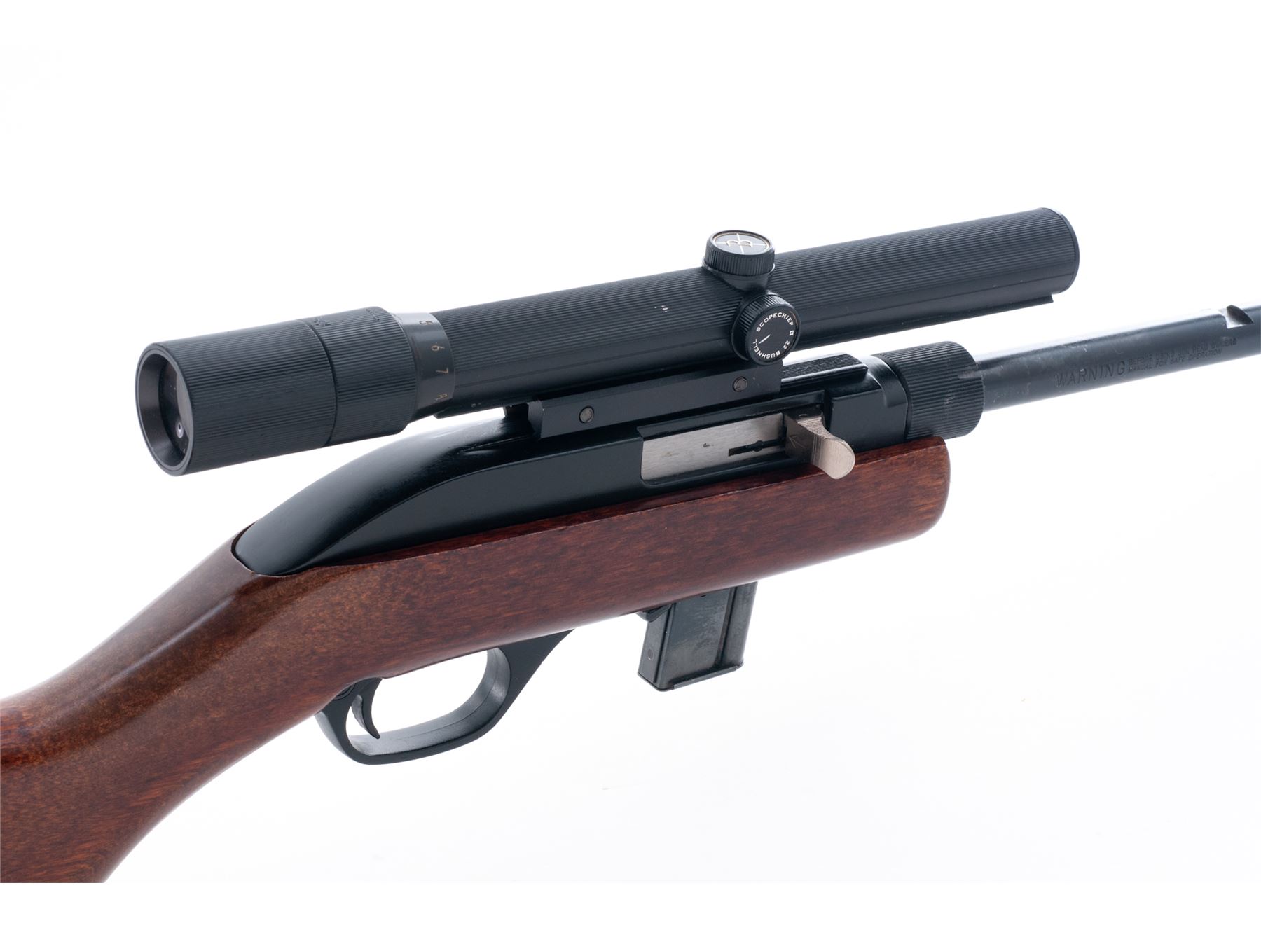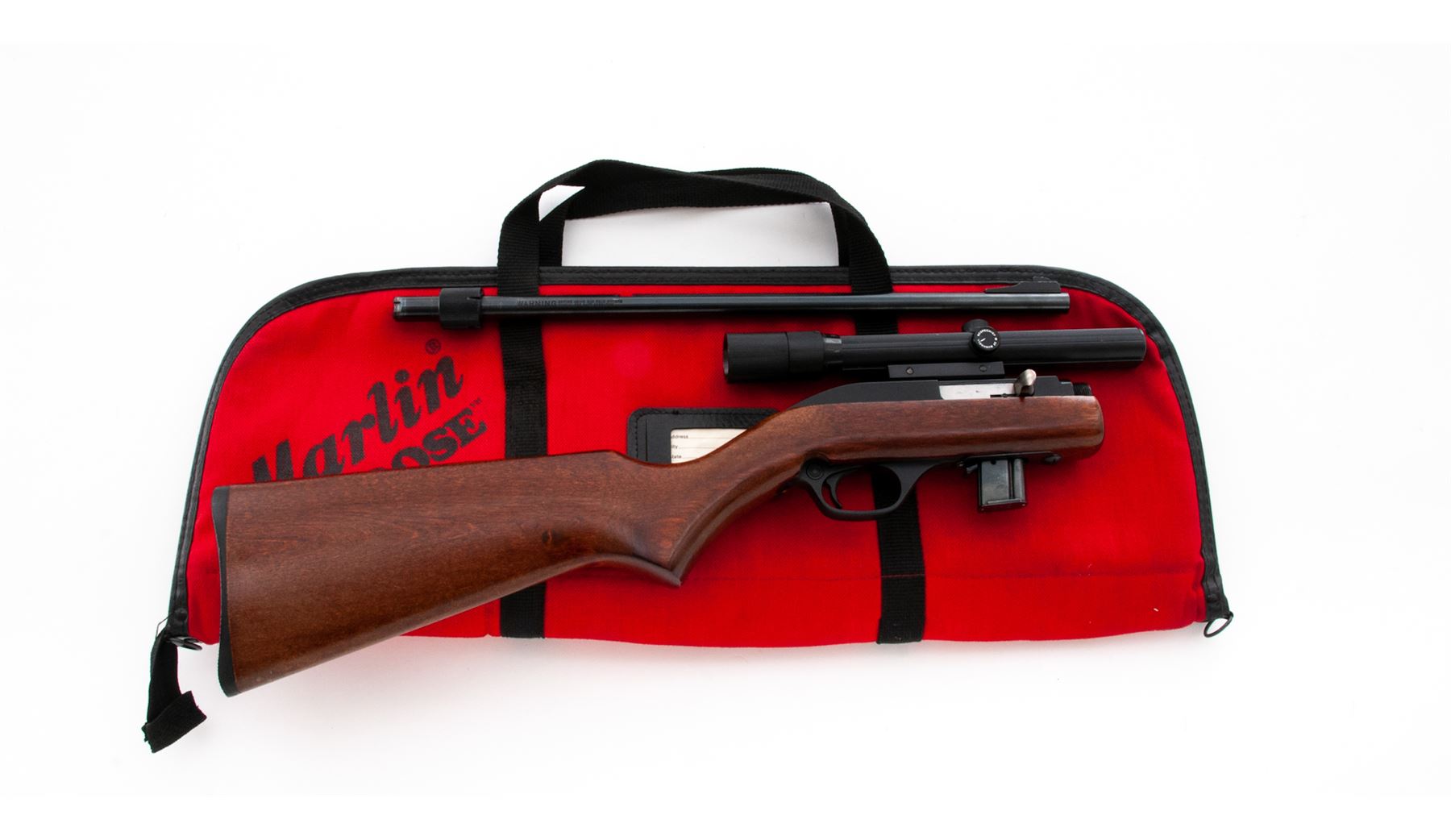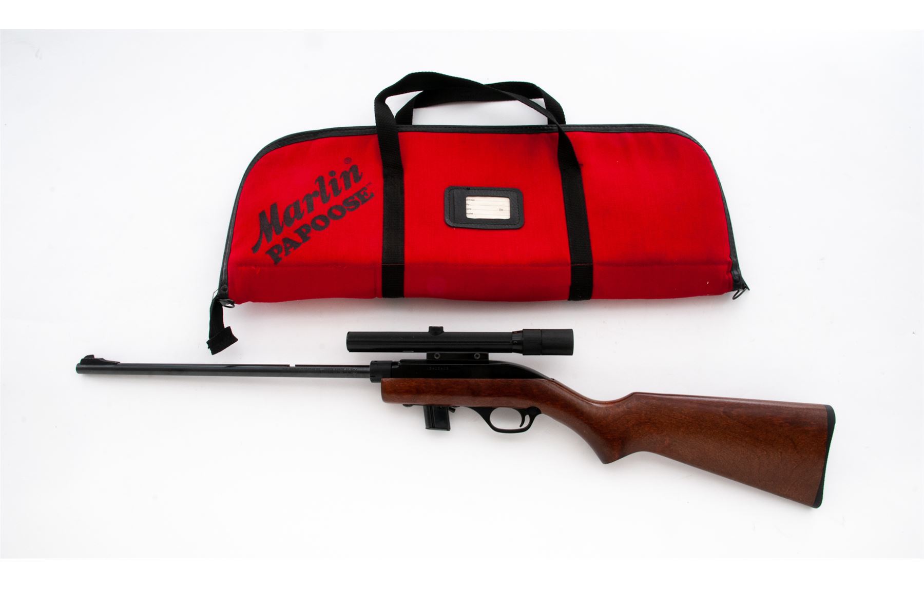 Marlin Model 70P ''Papoose'' Takedown Semi-Automatic Rifle, #13412408, .22 LR cal., 16.25'' micro-groove barrel, blue/black finish, pistol-grip wood stock, checkered black plastic buttplate, fixed blade front sight, rear sight has been removed and the factory grooved receiver is topped with a Bushnell 3-8x Scopechief scope with fine crosshair reticle. Included is one original 7-round magazine, one clear plastic Marlin 15-round magazine, and original red nylon carrying case and owner's manual. Approx. 95% original finish remains and rifle rates as very good+ overall; barrel with light surface scuffs and scratches near the takedown ring and rear sight dovetail. Stock with a few light handling marks at the pistol grip and small impressions along the bottom edge of the buttstock nearest the buttplate. Action is smooth with an excellent bore. Scope exterior with light handling marks, optics are bright and clear. Est.: $150-$250. (Modern) (High-cap mag not available to Calif. residents.)
