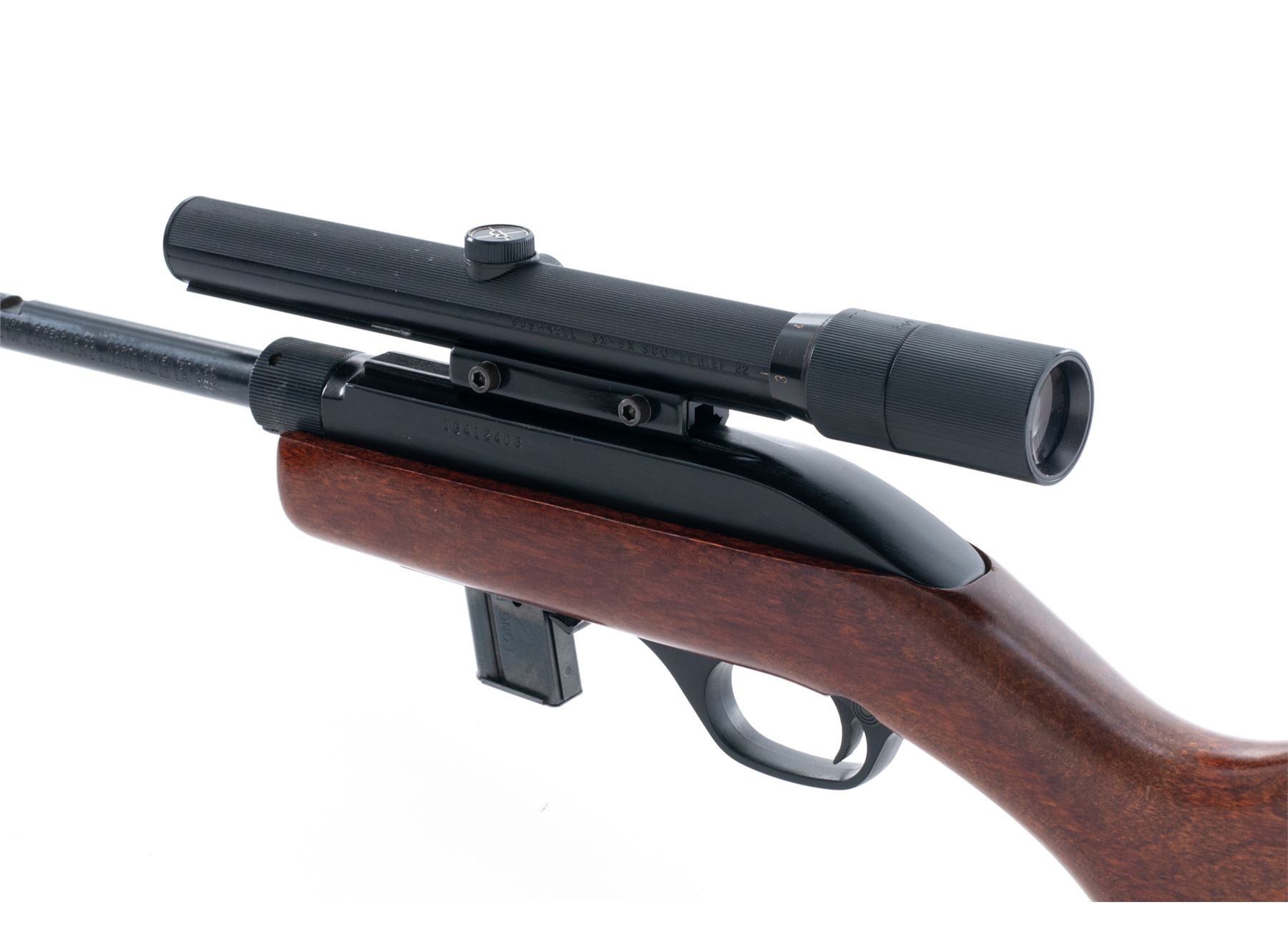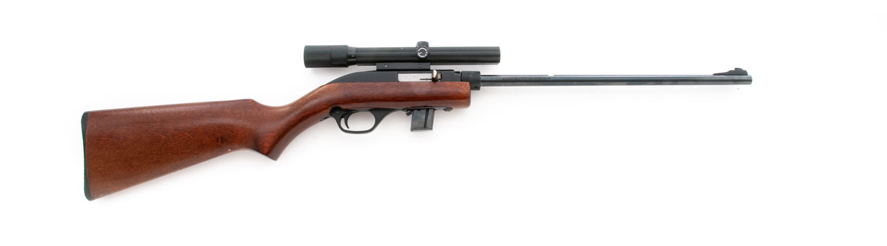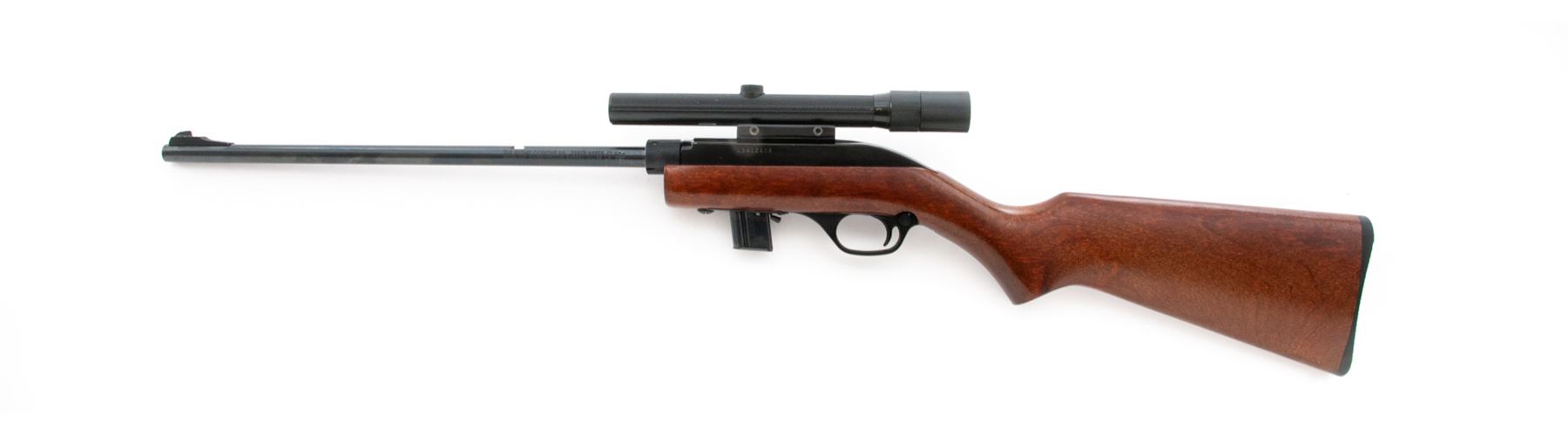 Marlin Model 70P ''Papoose'' Takedown Semi-Automatic Rifle, #13412408, .22 LR cal., 16.25'' micro-groove barrel, blue/black finish, pistol-grip wood stock, checkered black plastic buttplate, fixed blade front sight, rear sight has been removed and the factory grooved receiver is topped with a Bushnell 3-8x Scopechief scope with fine crosshair reticle. Included is one original 7-round magazine, one clear plastic Marlin 15-round magazine, and original red nylon carrying case and owner's manual. Approx. 95% original finish remains and rifle rates as very good+ overall; barrel with light surface scuffs and scratches near the takedown ring and rear sight dovetail. Stock with a few light handling marks at the pistol grip and small impressions along the bottom edge of the buttstock nearest the buttplate. Action is smooth with an excellent bore. Scope exterior with light handling marks, optics are bright and clear. Est.: $150-$250. (Modern) (High-cap mag not available to Calif. residents.)