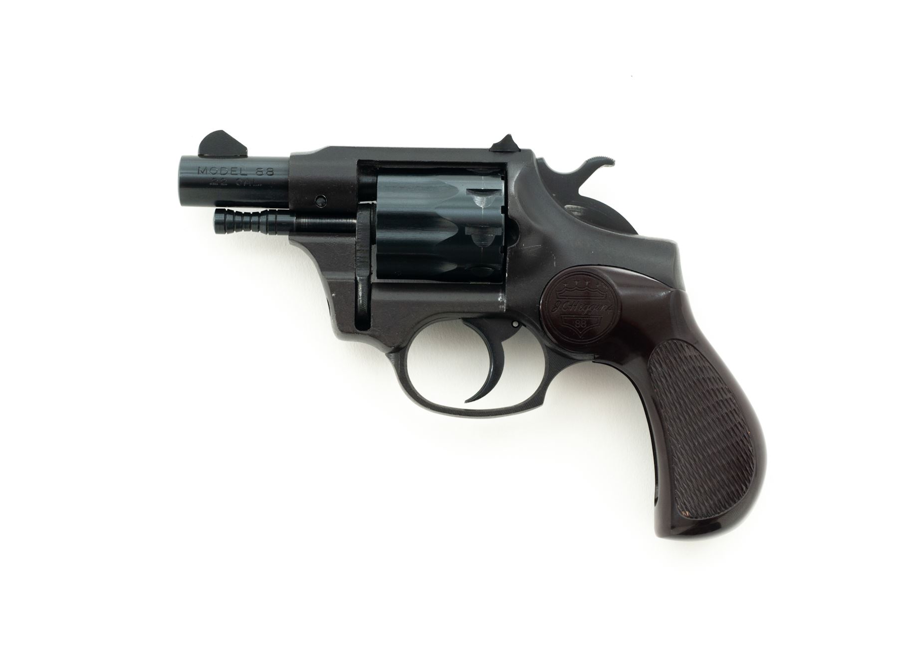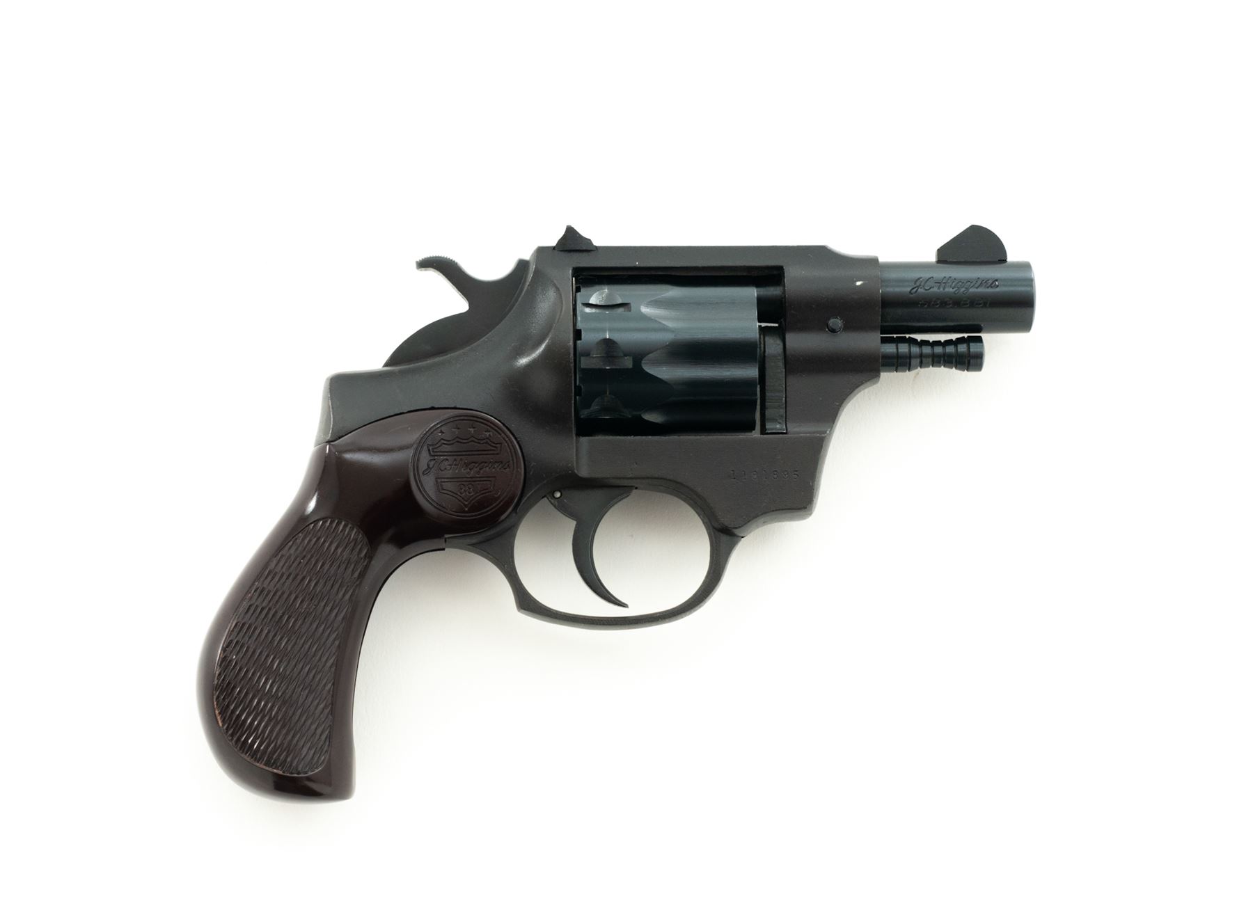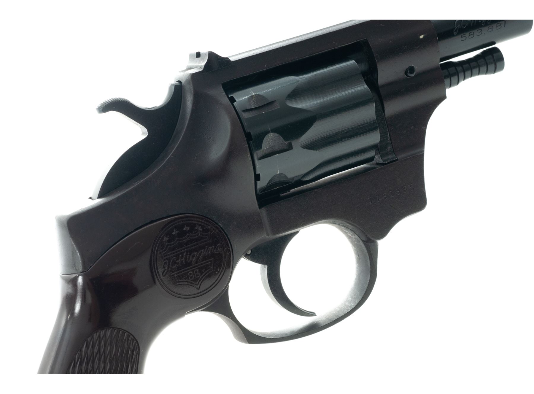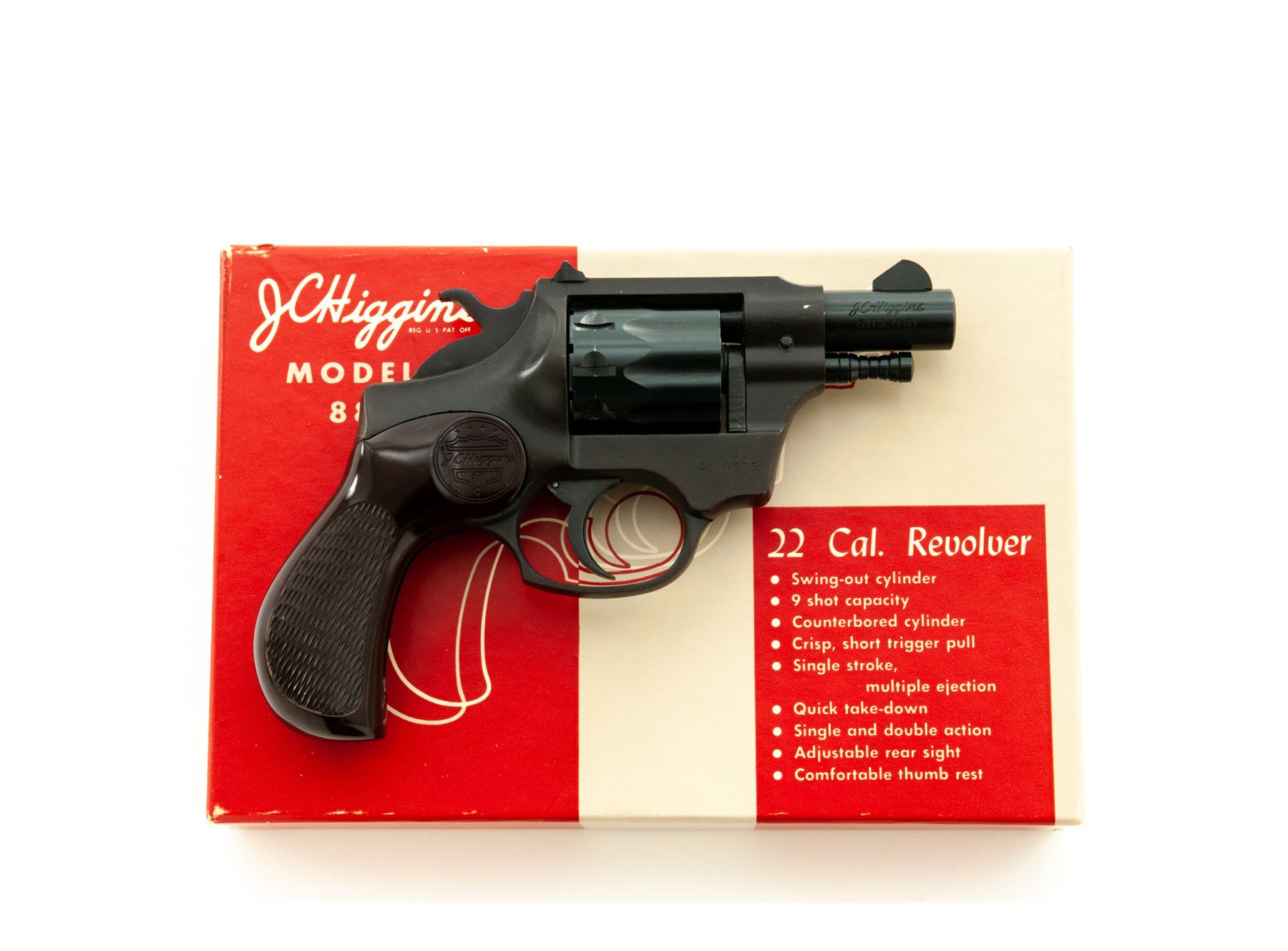 Boxed J.C. Higgins Model 88 Double Action Revolver, #1181895, .22 cal., 9-shot cylinder, matte blue frame, blued steel barrel and cylinder, original checkered brown plastic J.C. Higgins grips, with standard sights. In a very neat retro-looking original two-piece box that is numbered to the gun. Included is the original owner's manual with vintage graphic. Revolver appears to have been stored in the box, taken out and shot only a few times. Metal with a few light scratches and small handling marks, cylinder with a very light index line. Revolver, box, and manual are in extraordinary condition for this type of firearm. Est.: $150-$250. (C&R/PPT)