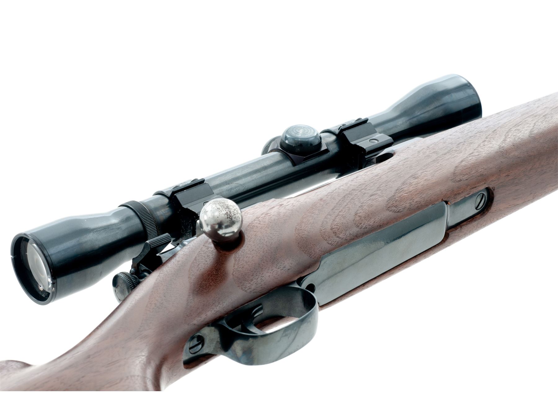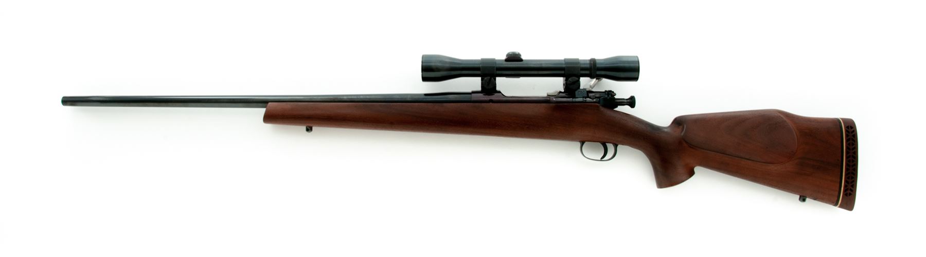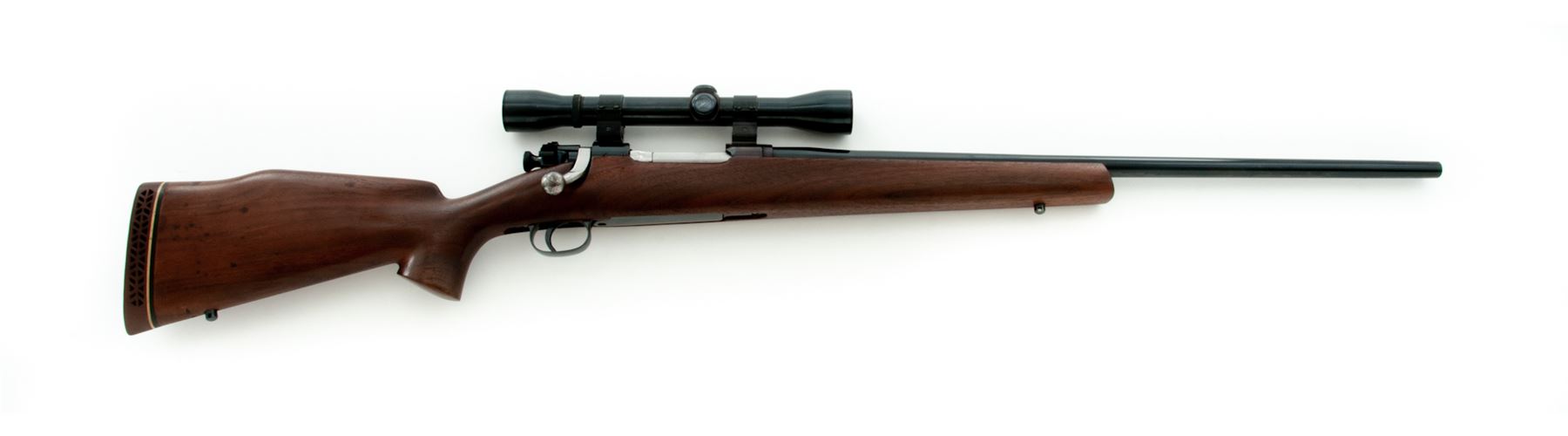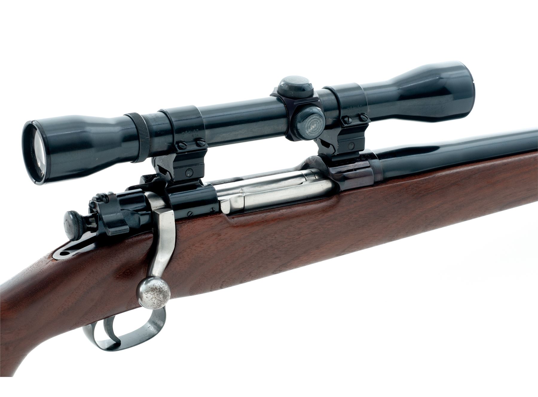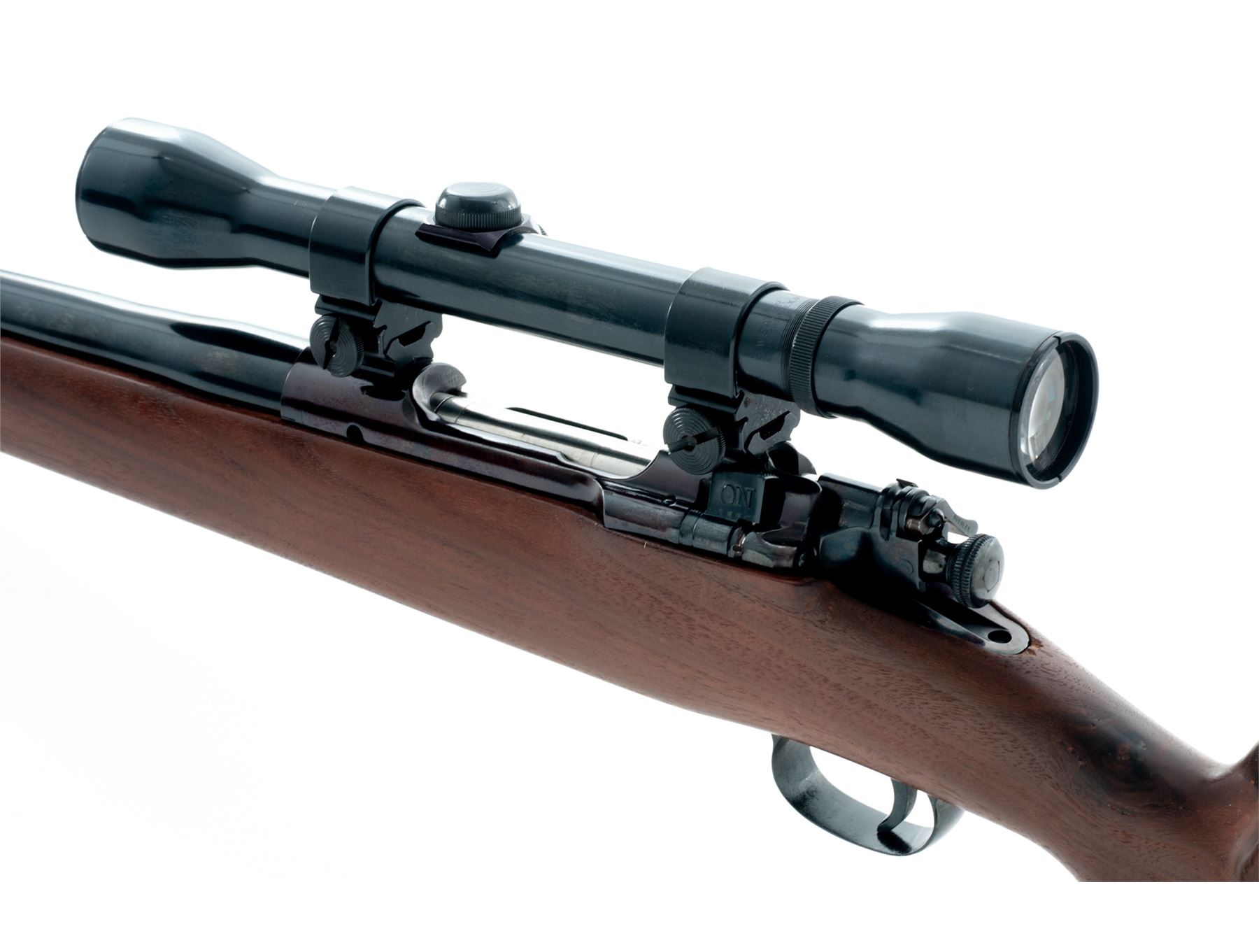 Sporterized Remington Model 1903 Bolt Action Rifle, with Weaver scope, #3291440, .30-06 cal., 24'' barrel, blue finish, no sights, and topped with a Weaver K4 scope and Weaver 1'' rings; scope with a fine crosshair reticle. Bolt body and extractor have been polished bright. Rifle has also been fit with a one-piece walnut Sporter stock with a Monte Carlo cheekpiece, pistol grip, sling swivel studs, and vented brown rubber Mershon recoil pad. Condition is very good overall as modified from its original military configuration. Approx. 97% reblued finish remains; majority of the receiver has toned to a plum color; receiver ring with the original military markings; barrel is almost completely blank with the exception of a few illegible numbers at the top middle. Stock shows very few small handling marks and with a nice even color, finish has thinned a little near the rear swivel stud. Action is smooth; bore with a few very minor peppered spots and is otherwise nice and clean with excellent rifling. Scope exterior rates very good showing normal light wear and ring marks, optics are clear. Est.: $200-$300. (Modern)