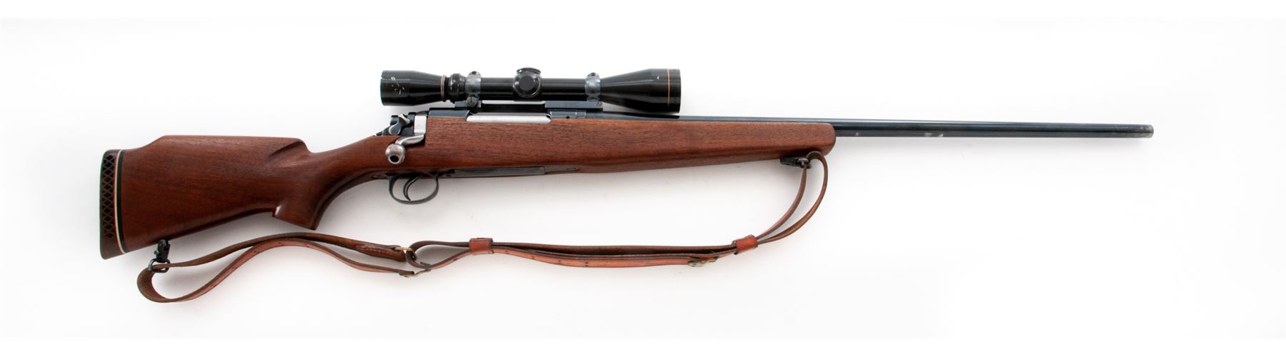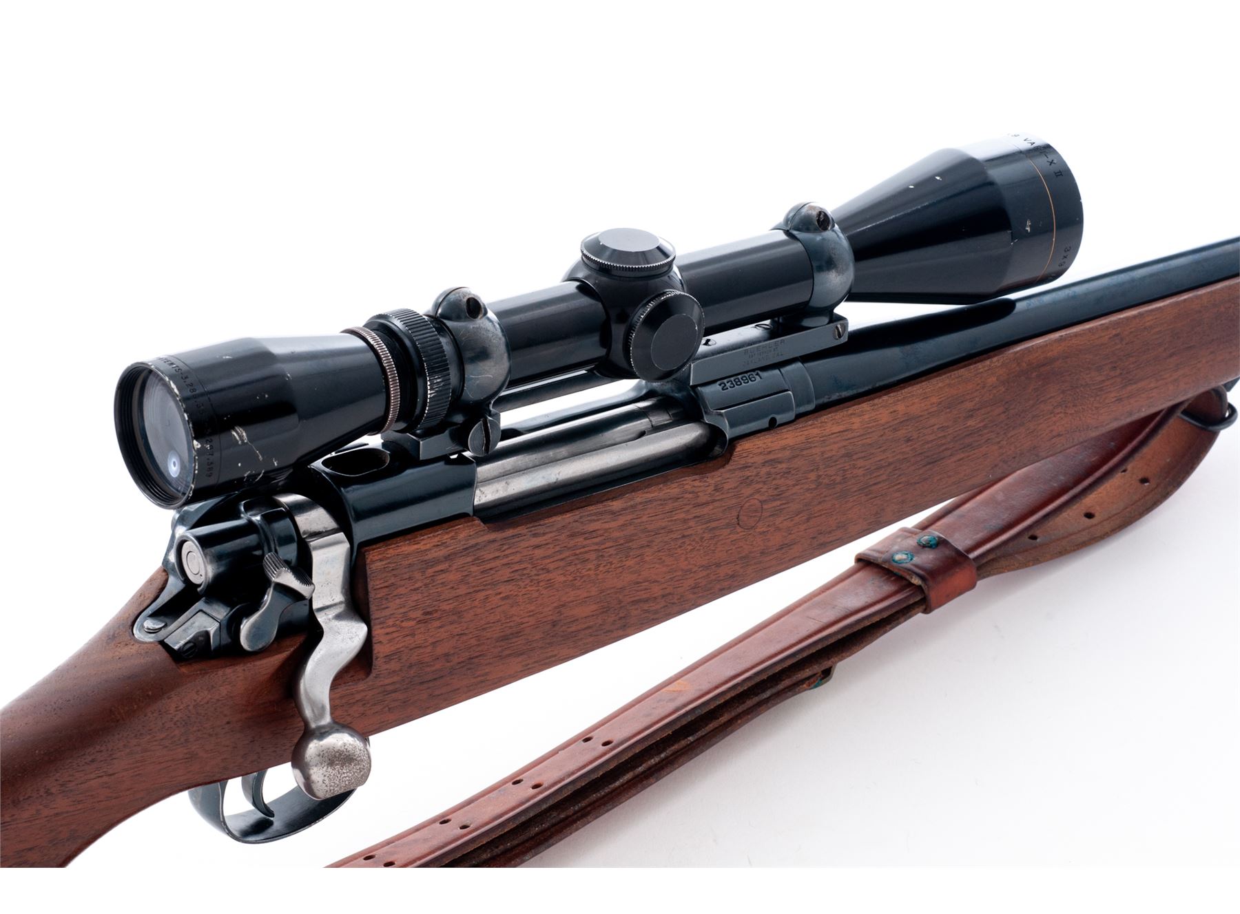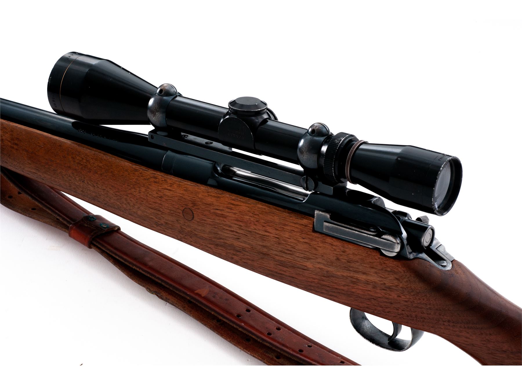 Sporterized P-17 Bolt Action Rifle, by Eddystone, #238961, .308 Norma cal., 26'' barrel, blue finish, pistol-grip cheekpiece walnut stock, with rubber butt pad and commercial Hunter leather sling. Topped with an early Leupold Vari-X II 3-9x scope. Condition is fine as refinished, retaining approx. 94% blue. Bolt, extractor and follower have been polished. Stock is well accomplished, although butt is somewhat short. Good action, bright bore, clear scope optics. Est.: $250-$450. (Modern)
