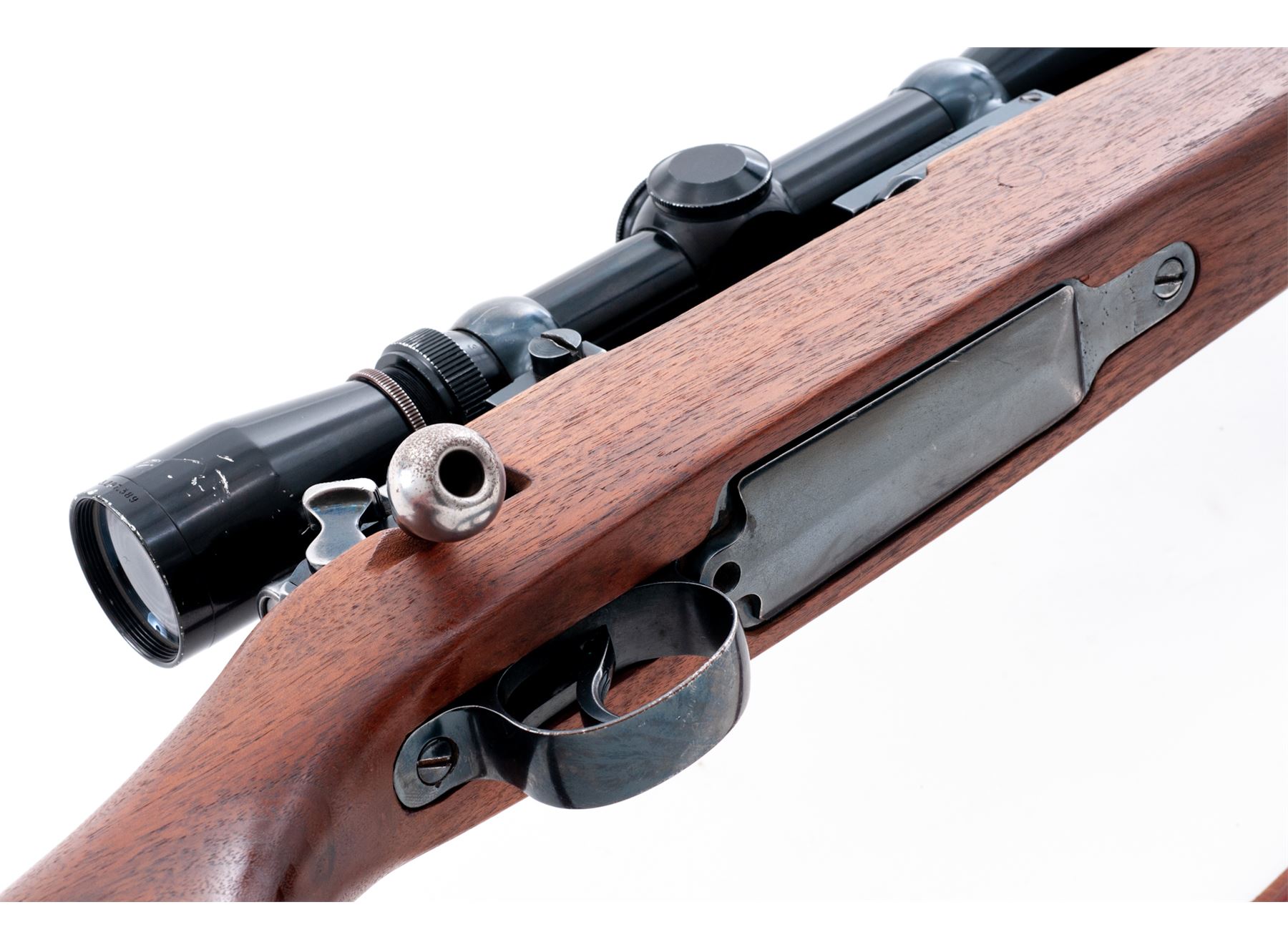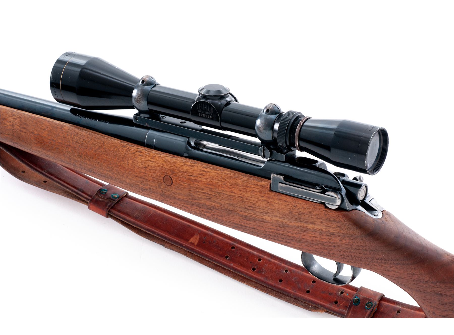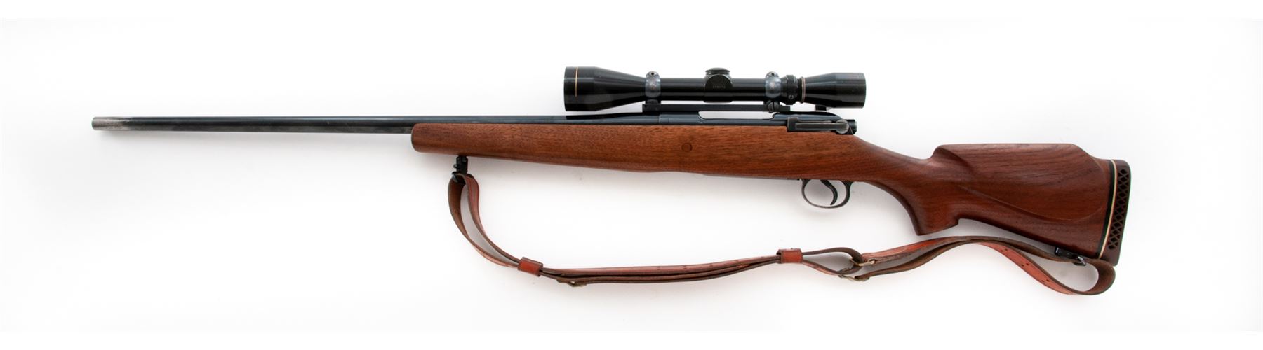 Sporterized P-17 Bolt Action Rifle, by Eddystone, #238961, .308 Norma cal., 26'' barrel, blue finish, pistol-grip cheekpiece walnut stock, with rubber butt pad and commercial Hunter leather sling. Topped with an early Leupold Vari-X II 3-9x scope. Condition is fine as refinished, retaining approx. 94% blue. Bolt, extractor and follower have been polished. Stock is well accomplished, although butt is somewhat short. Good action, bright bore, clear scope optics. Est.: $250-$450. (Modern)