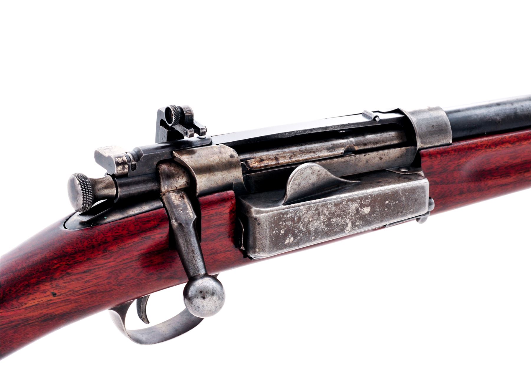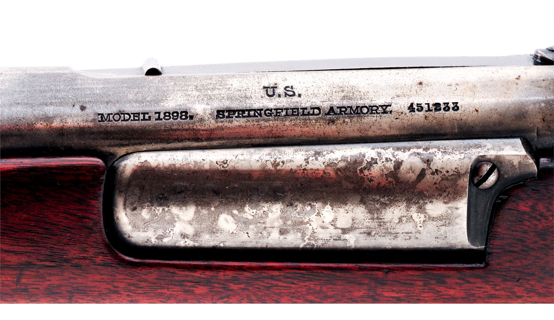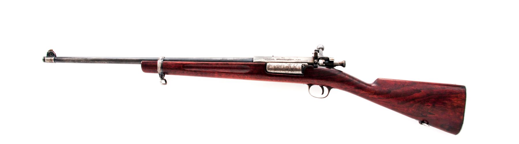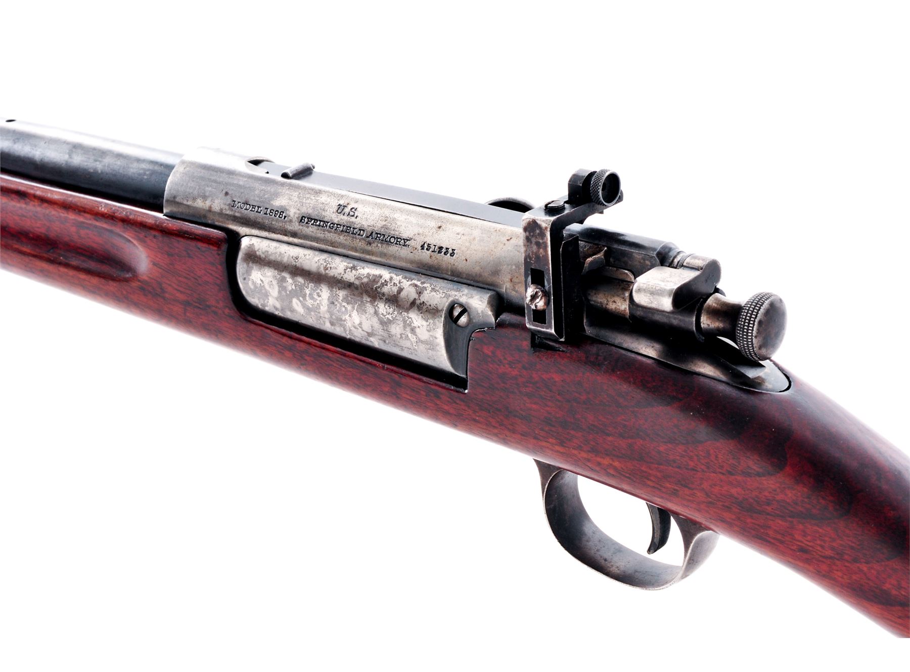 Sporterized U.S. Model 1898 Krag Bolt Action Rifle, #451233, .30-40 Krag cal., 22'' barrel, blued finish, walnut stock, blade front sight, rear military sight removed, replaced with adjustable aperture rear sight. Marked on left side of receiver ''U.S. MODEL 1898. SPRINGFIELD ARMORY''. May 1903 production. Rifle has been sporterized by shortening barrel and stock and removing rear sight and handguard. Condition overall is very good with less than 50% of the reblued finish remaining on metal surfaces, the balance thinning and scattered. Stock has a crack at the buttplate, otherwise very good with most of the refinished gloss varnish remaining on the wood. Action and magazine operate smoothly. Bore is very good with good rifling. Est.: $300-$450. (Modern)
