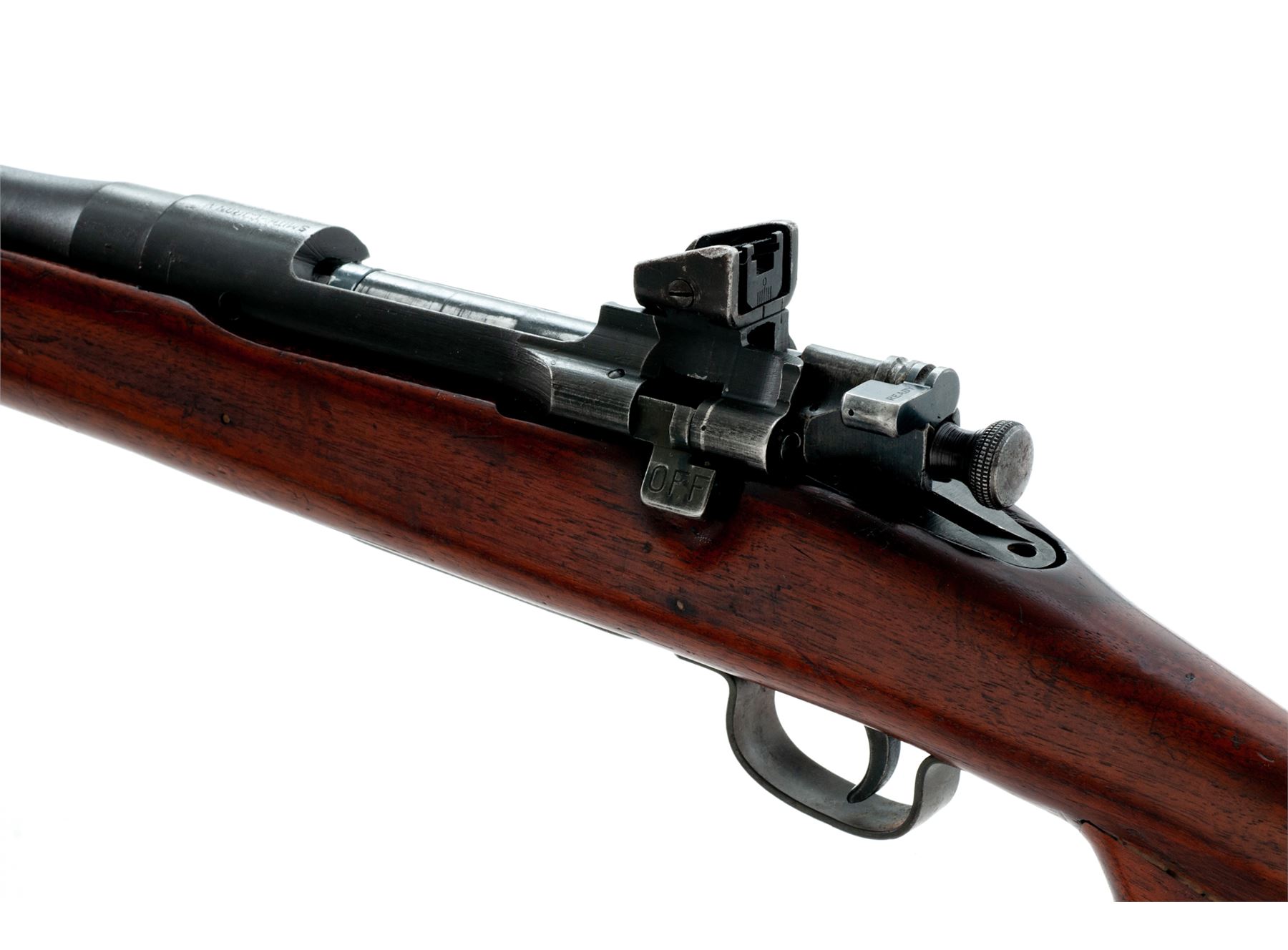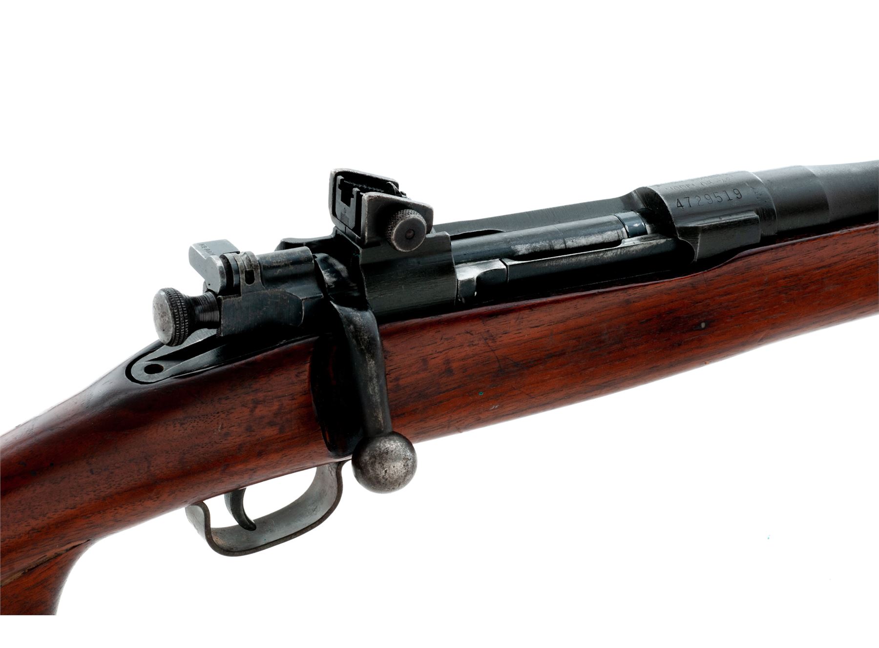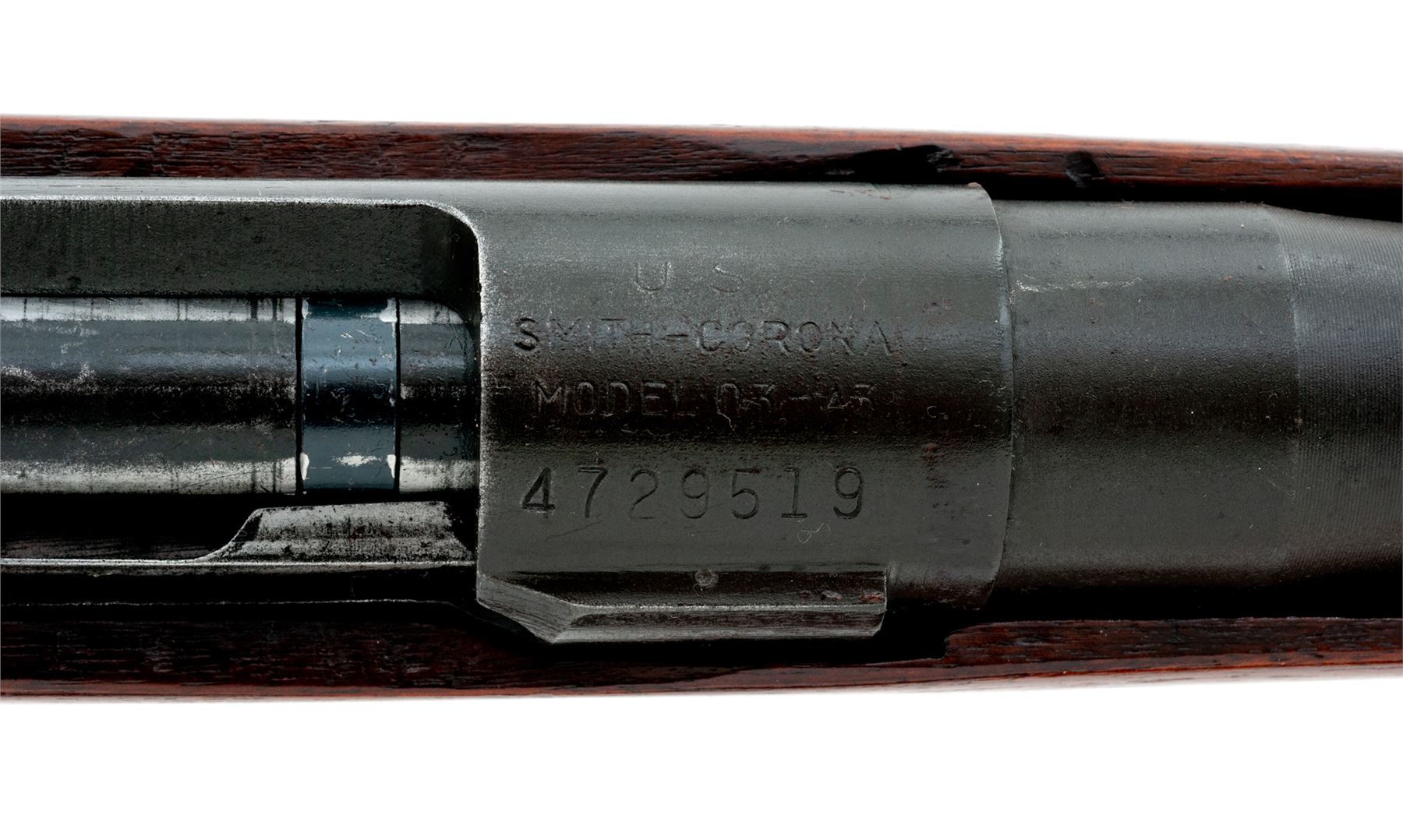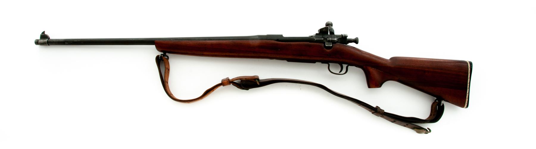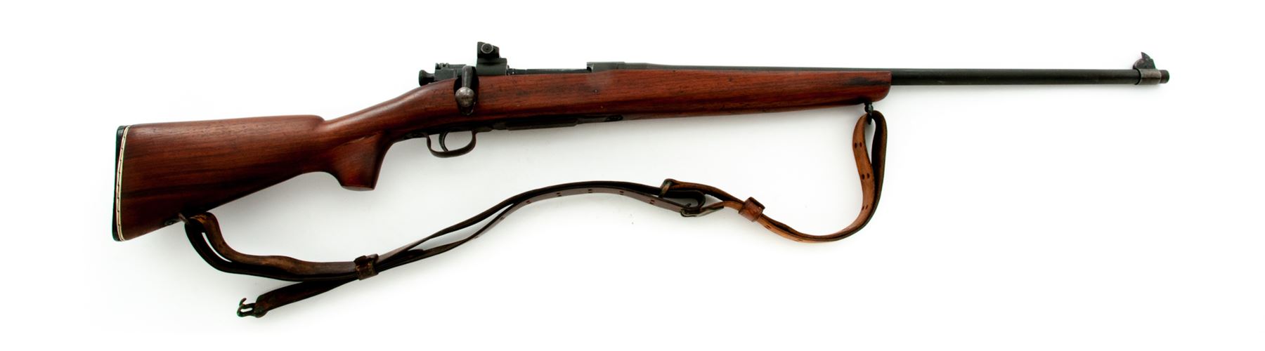 Sporterized Smith-Corona Model 03-A3 Bolt Action Rifle, #4729519, .30-06 cal., 24'' barrel, parkerized finish, shortened and modified GI stock, with original GI sights and U.S. M1907 leather sling. Condition is fine as modified. Bolt, barrel, frame and triggerguard retain approx. 94% of their original finish; metal has not been cut. Stock has been Sporter cut halfway down the barrel, with the cutoff portion having been made into a pistol grip and epoxied to the wrist area. Good action, bright bore. Est.: $250-$450. (Modern)