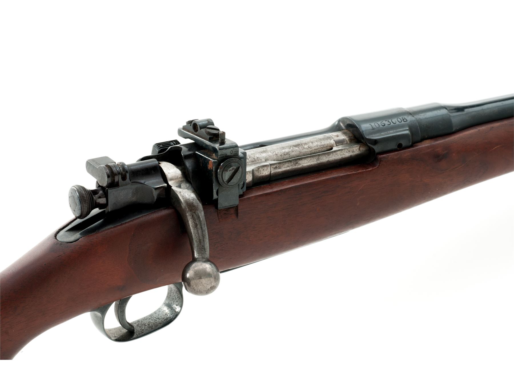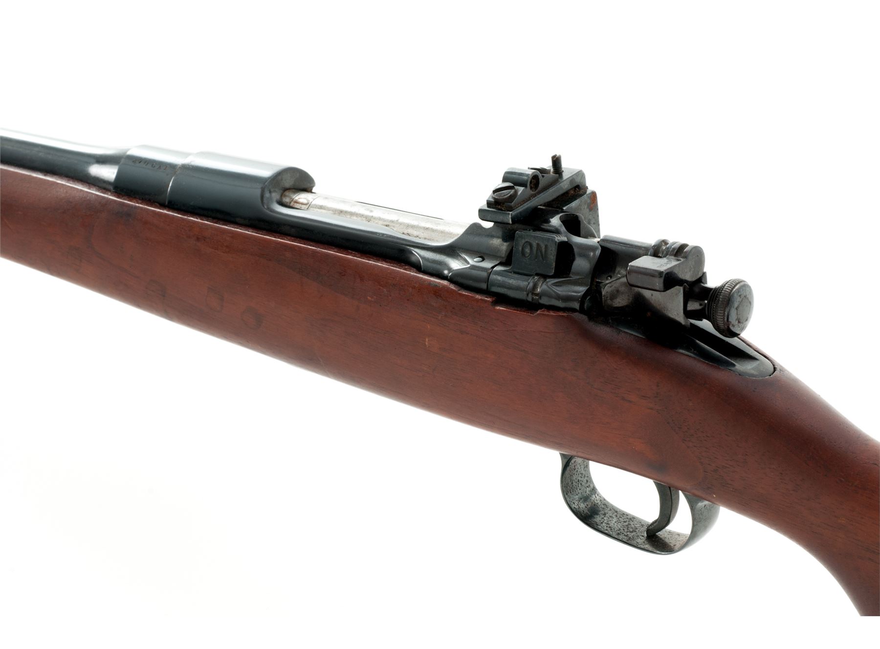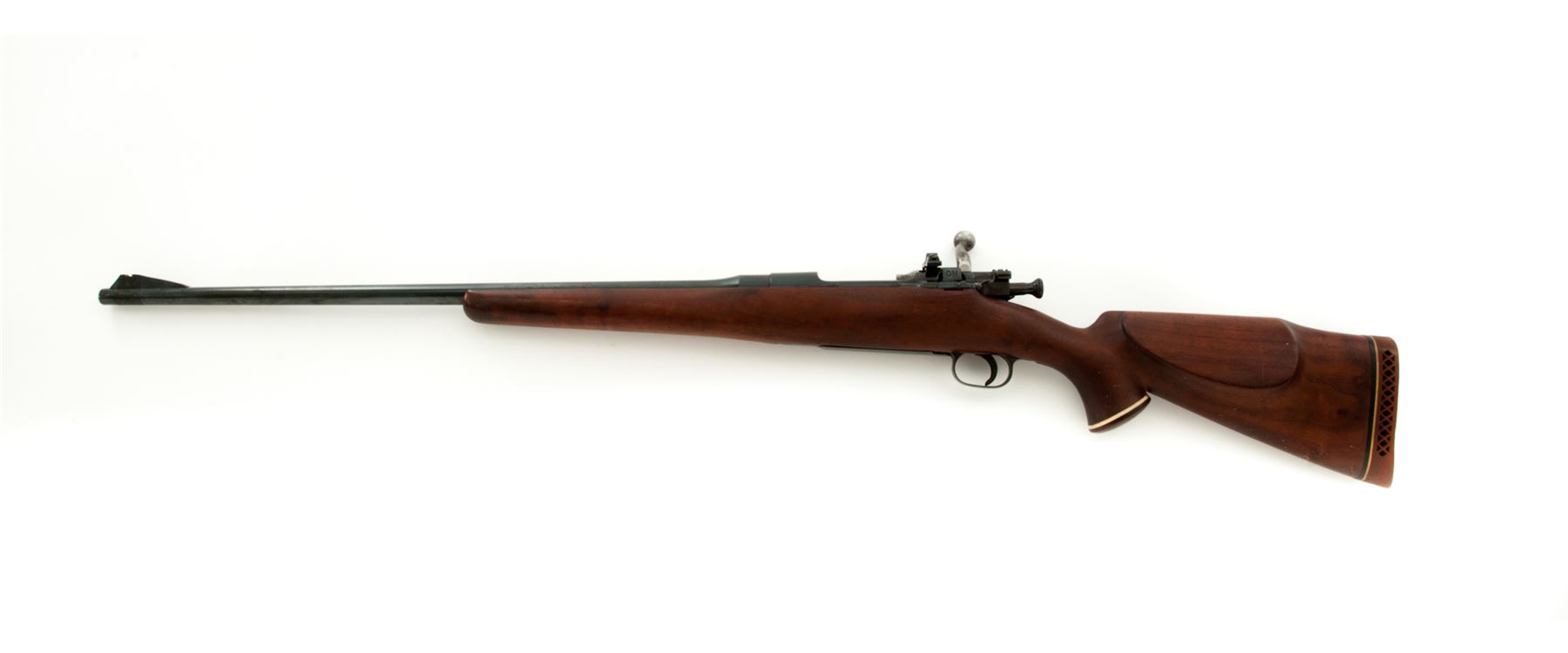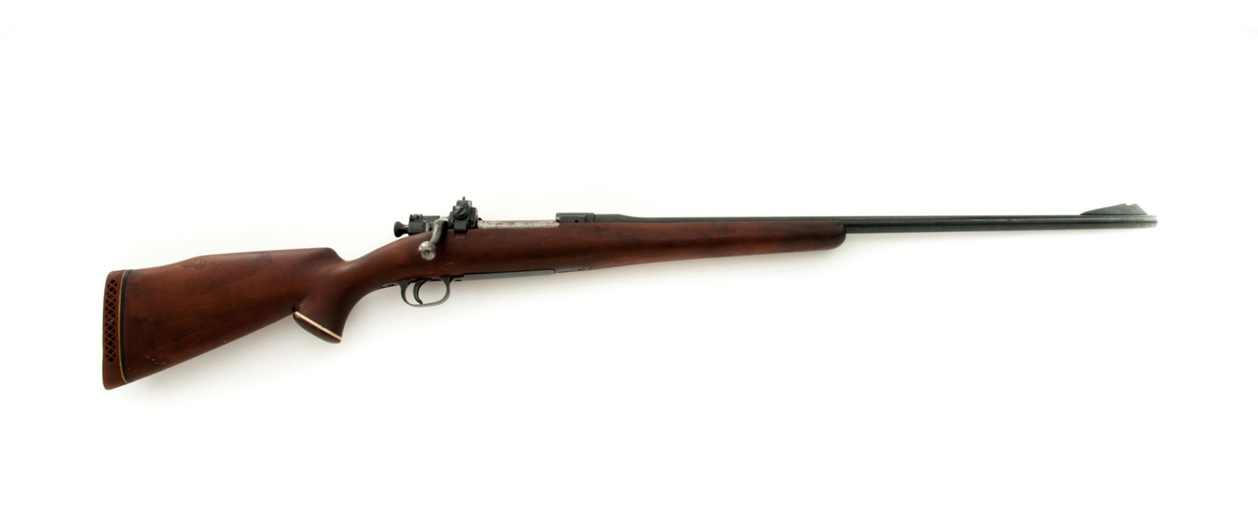Sporterized Winchester Model 1903-A3 Bolt Action Rifle, #1063008, .270 Win cal., 23.75'' barrel, blued finish, Monte Carlo sporting stock with recoil pad, ramp front sight (missing blade) and adjustable aperture rear sight. Military markings removed,''270 cal'' stamped on barrel. Rifle has been sporterized by removing all U.S.G.I. parts except receiver and bolt (which has had the handle turned back) and refinished. Condition overall is very good as sporterized with approx. 95% reblued finish remaining on the metal with scattered areas of light rust. Stock is very good with fading and light handling marks. Action is smooth; bore is bright showing a couple of small dark areas that may clean and good rifling. Est.: $150-$300. (Modern)