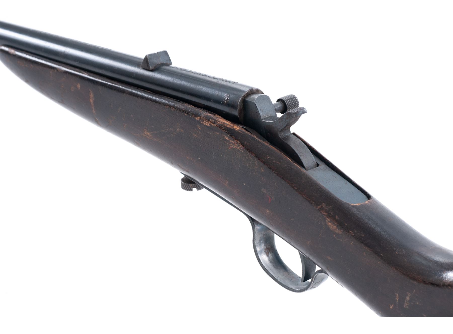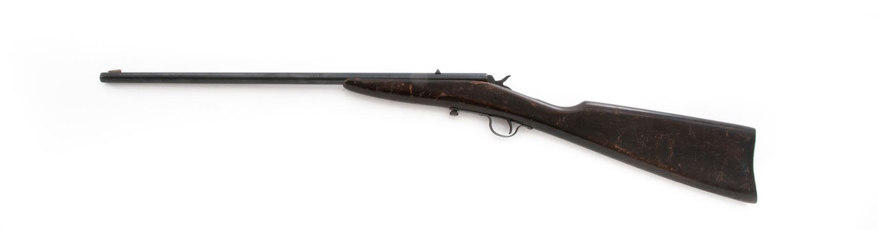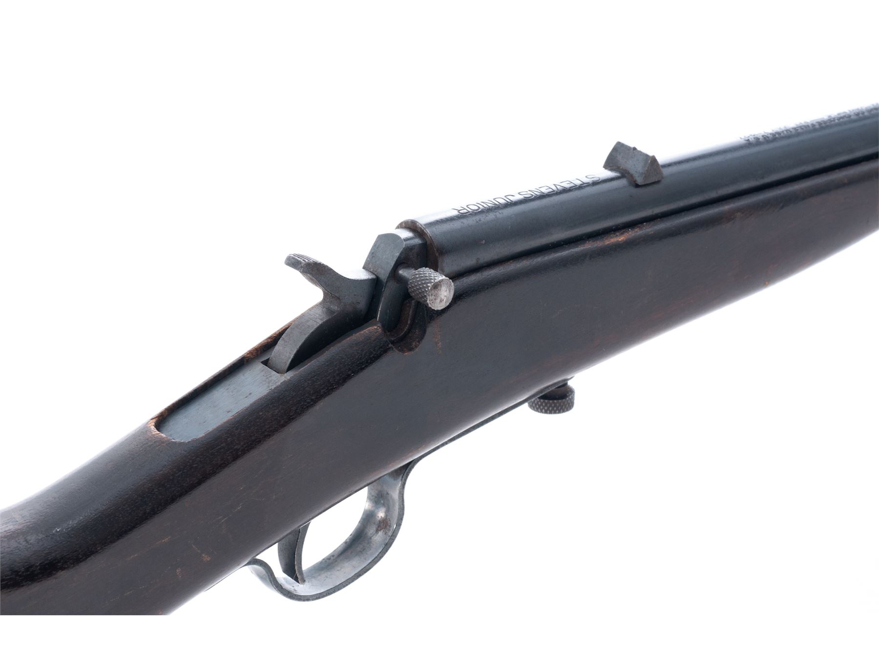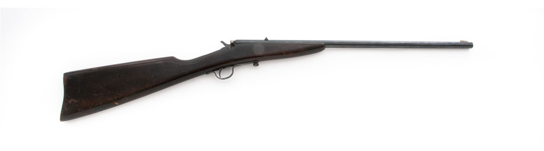 Stevens Junior No. 11 Boys' Falling Block Cartridge Rifle, NVSN, .22 cal., blued 20'' round barrel with German silver blade front and dovetailed notched rear sights, blued hammer, trigger and sheet steel triggerguard; dark varnished hardwood halfstock made without buttplate. Mfg'd 1924-31. Condition is good to very good retaining approx. 90% original blue finish to barrel, and triggerguard with scattered beginning erosion. Stock shows numerous use scars and scratches but is sound and retains much varnish. Action is tight and crisp; bore is clean with defined rifling. Est.: $100-$150. (C&R)