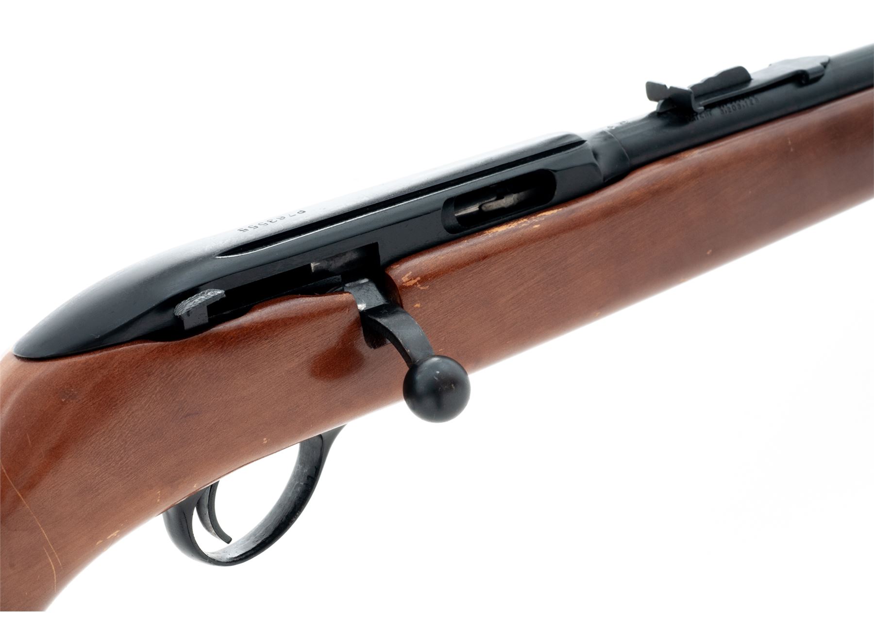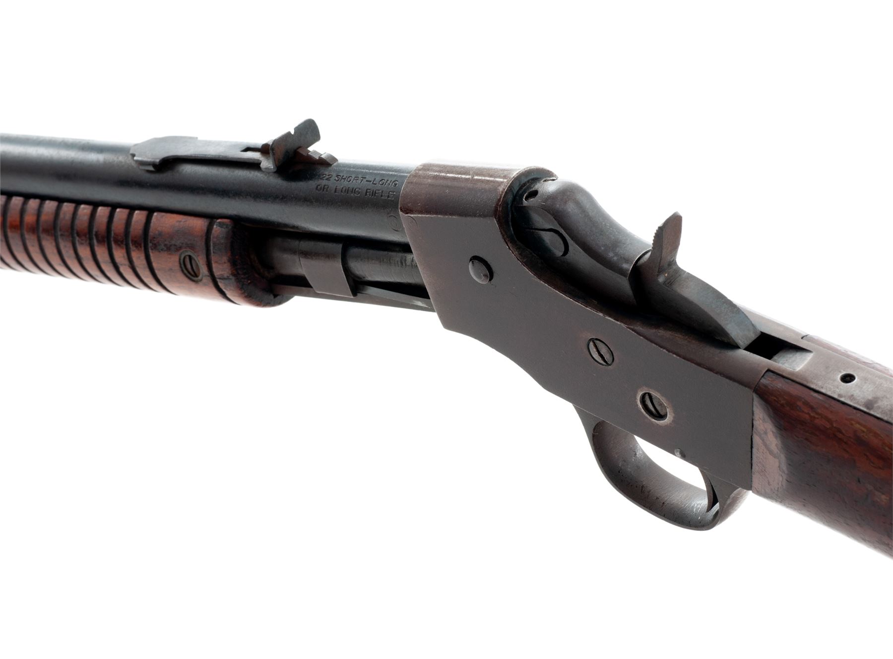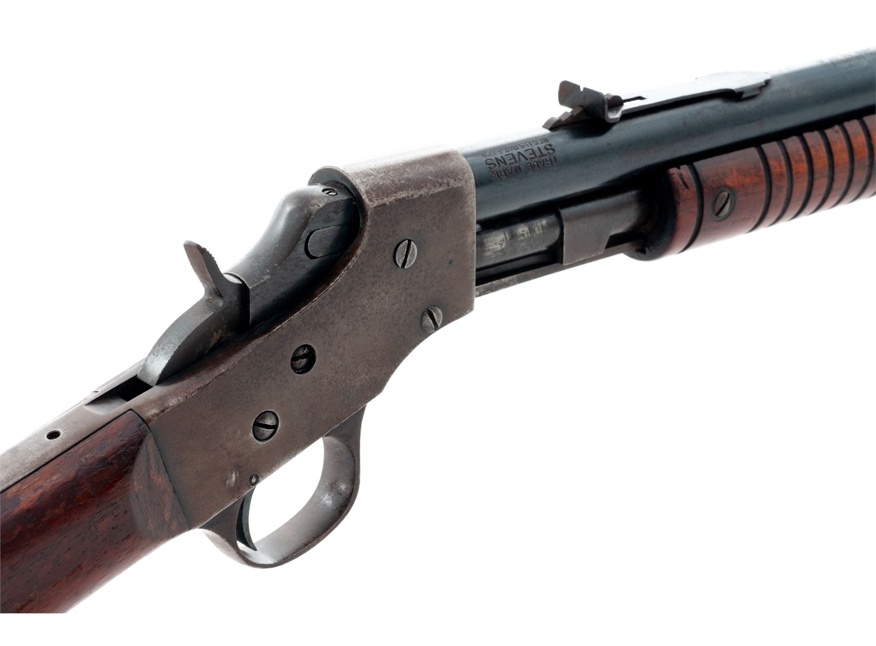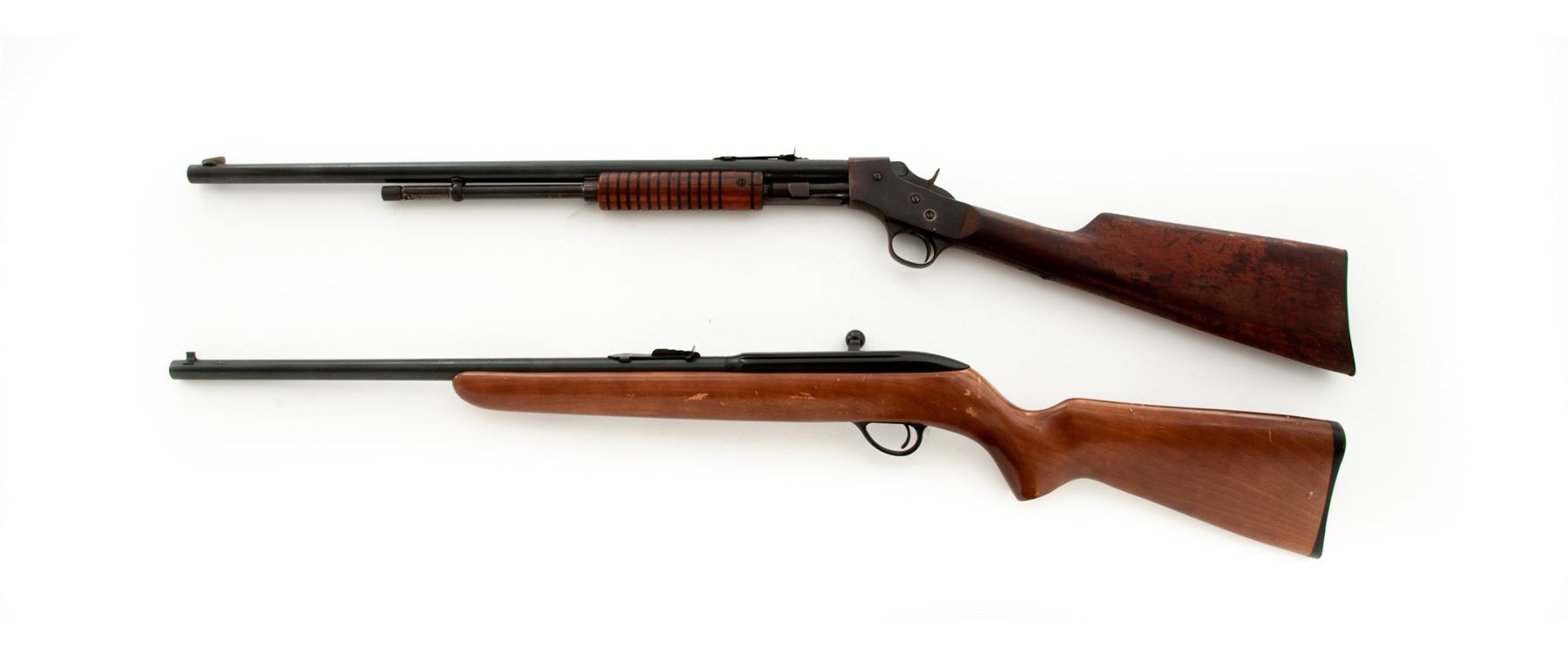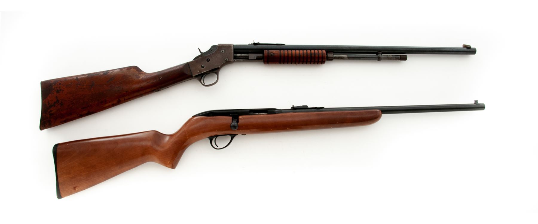 Lot of Two (2) Stevens Small Caliber Rifles: (1) Model 73Y Single-Shot Bolt Action Breechloader, #P763555, .22 S-L-LR RF cal., 18'' round barrel with integral front bead blade and adjustable rear sights; steel receiver with right-side cartridge loading port, sliding bolt and safety lever; varnished hardwood pistol-grip halfstock with grooved black plastic buttplate. Condition is fine, the metal surfaces retaining most of their blued/blackened finishes and the stock being solid with scrapes and scratches mainly to the left side varnish. Action functions well; bore is brilliant with sharp rifling. (2) Pump Action Repeating Breechloader, #EQO, .22 S-L-LR RF cal., 22'' round barrel with dovetailed German silver blade front and adjustable rear sights; steel receiver with sliding breechblock and hammer; varnished hardwood finger-groove slide and straight buttstock with a plain steel buttplate. Condition is very good, the barrel retaining approx. 90% blue, the case hardened receiver and triggerguard having mostly browned out. Stocks are solid with scrapes and scratches in the varnish from field use. Action functions well; bore is clean with sharp rifling. Est.: $200-$400/Lot. (Modern/C&R)