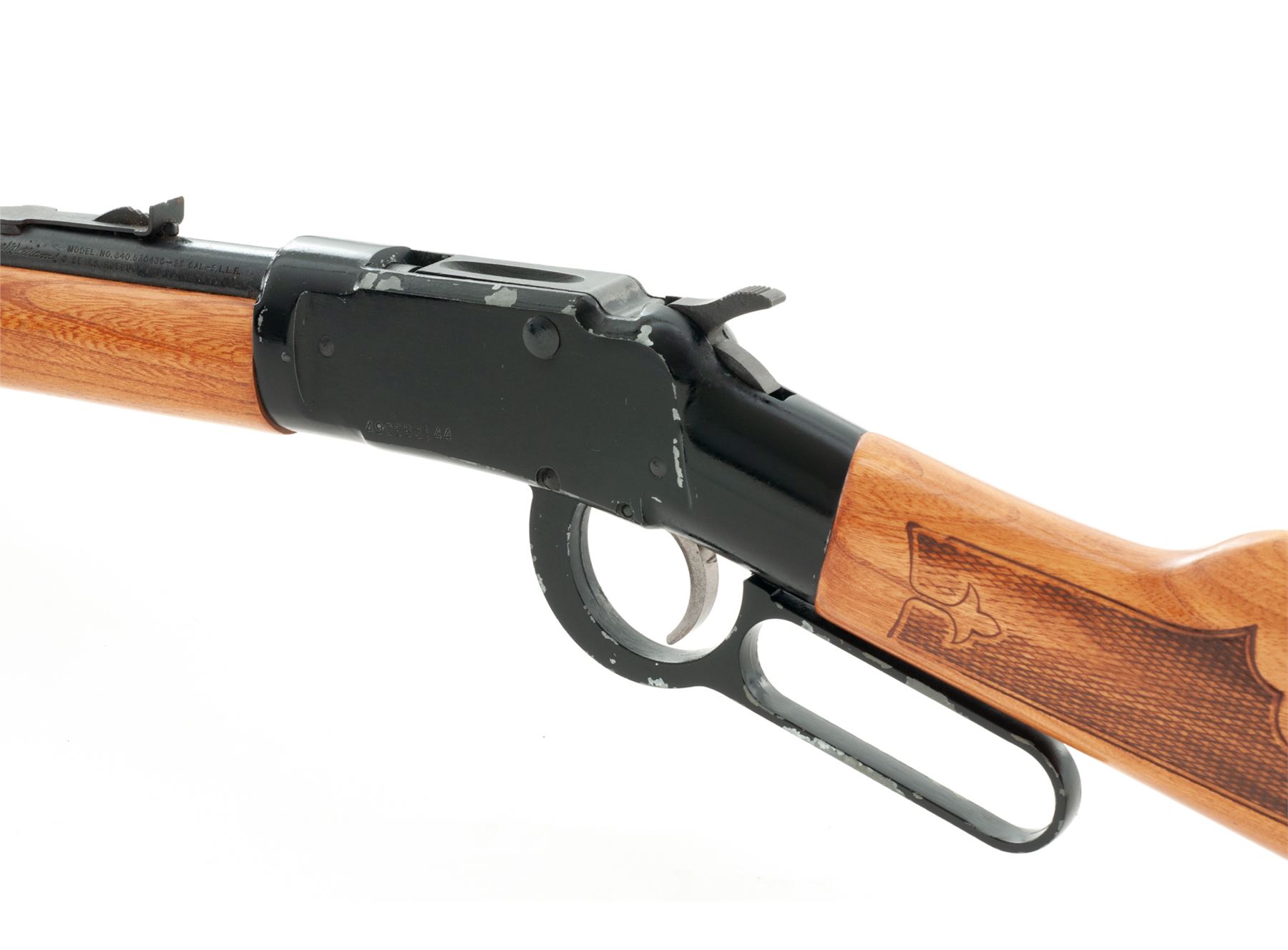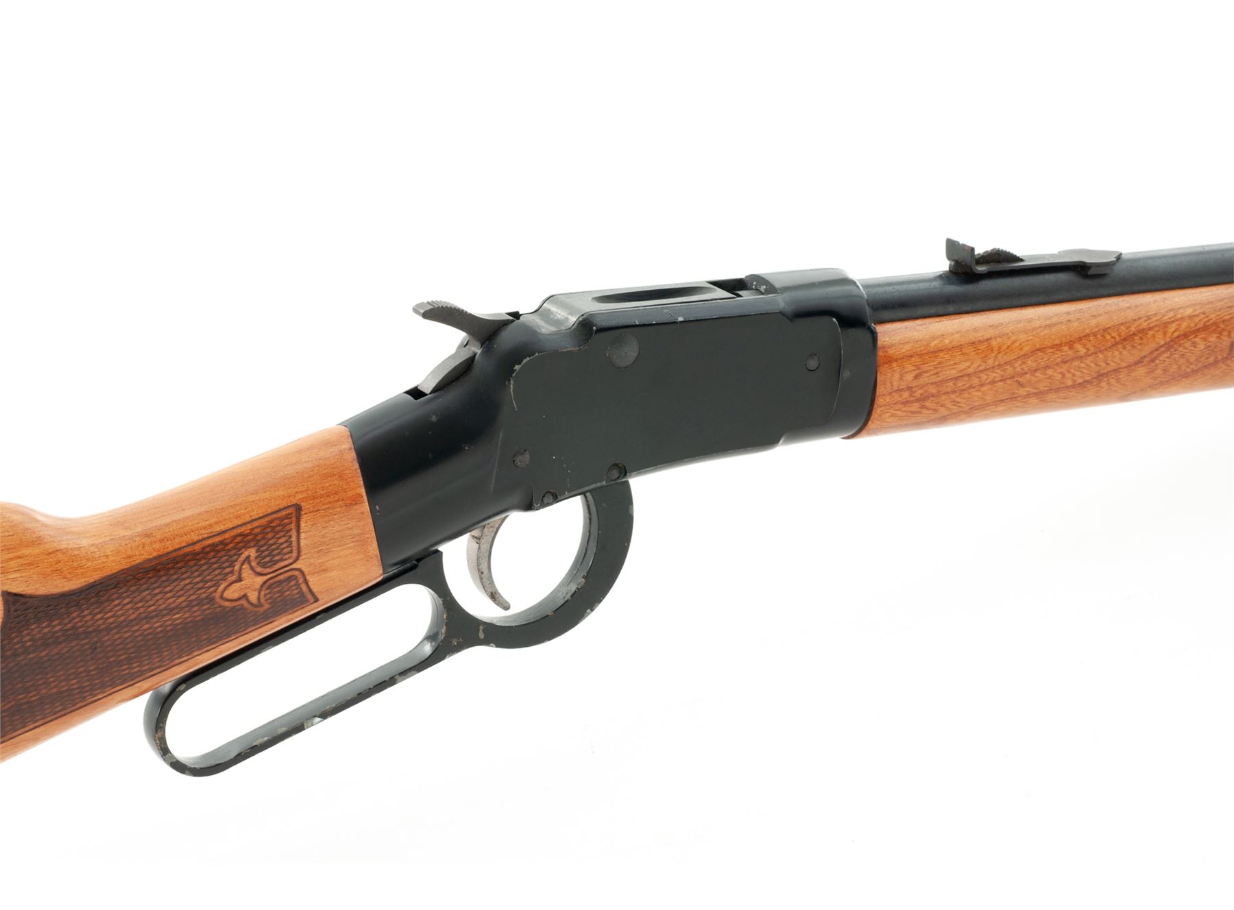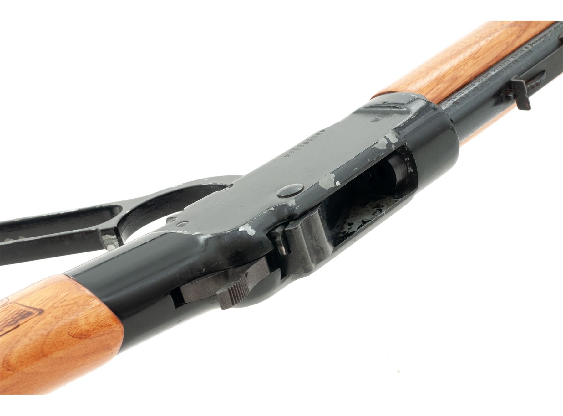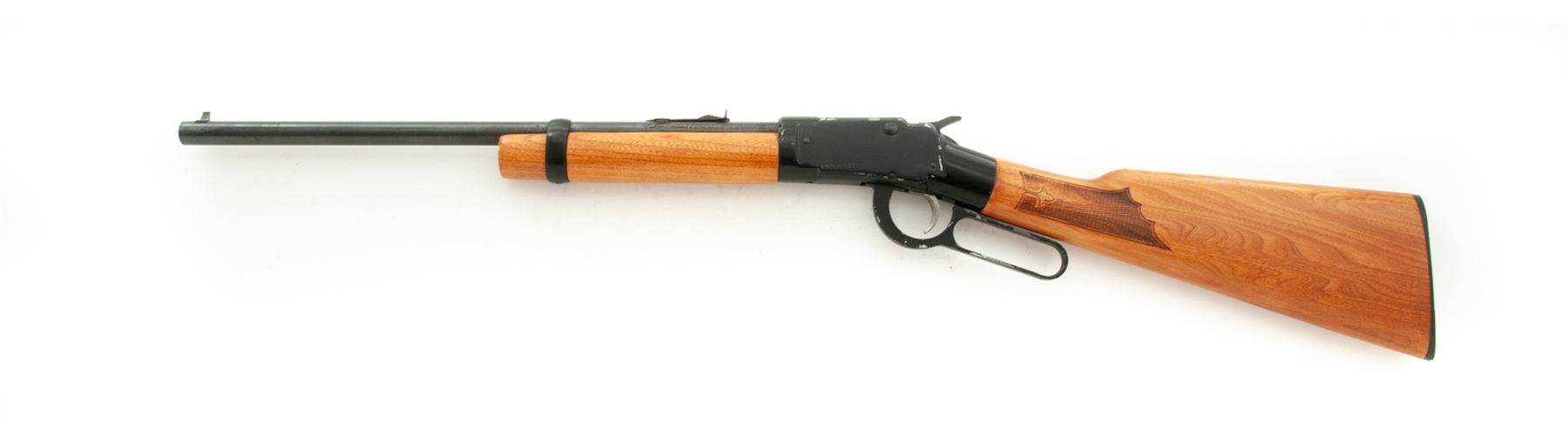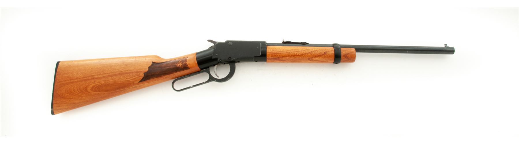 Sears & Roebuck ''Ted Williams'' Model No. 340.530430 Lever Action Single-Shot Carbine, #490582144, .22 S-L-LR RF cal., blued 18'' round barrel with dovetailed bead-blade front and adjustable open rear sights marked with the model and caliber designations and maker's name and address on left side; steel receiver and loop operating lever with black-painted finish; oil-stained hardwood forend held by a single barrel band and straight buttstock having pressed fleur-de-lis checkering at wrist and a grooved black plastic buttplate. Condition is fine, the barrel retaining approx. 95% original blue, the rear sight with light rust patina that should easily clean, the receiver and lever with scrapes and paint loss. Stocks are smooth and solid with lightly-pressed checkering and a pleasing light color, the buttplate with discoloration/handling marks. Action functions (lever opens breech; hammer must be manually pulled to cock); bore is brilliant with sharp rifling. Est.: $100-$200. (Modern)