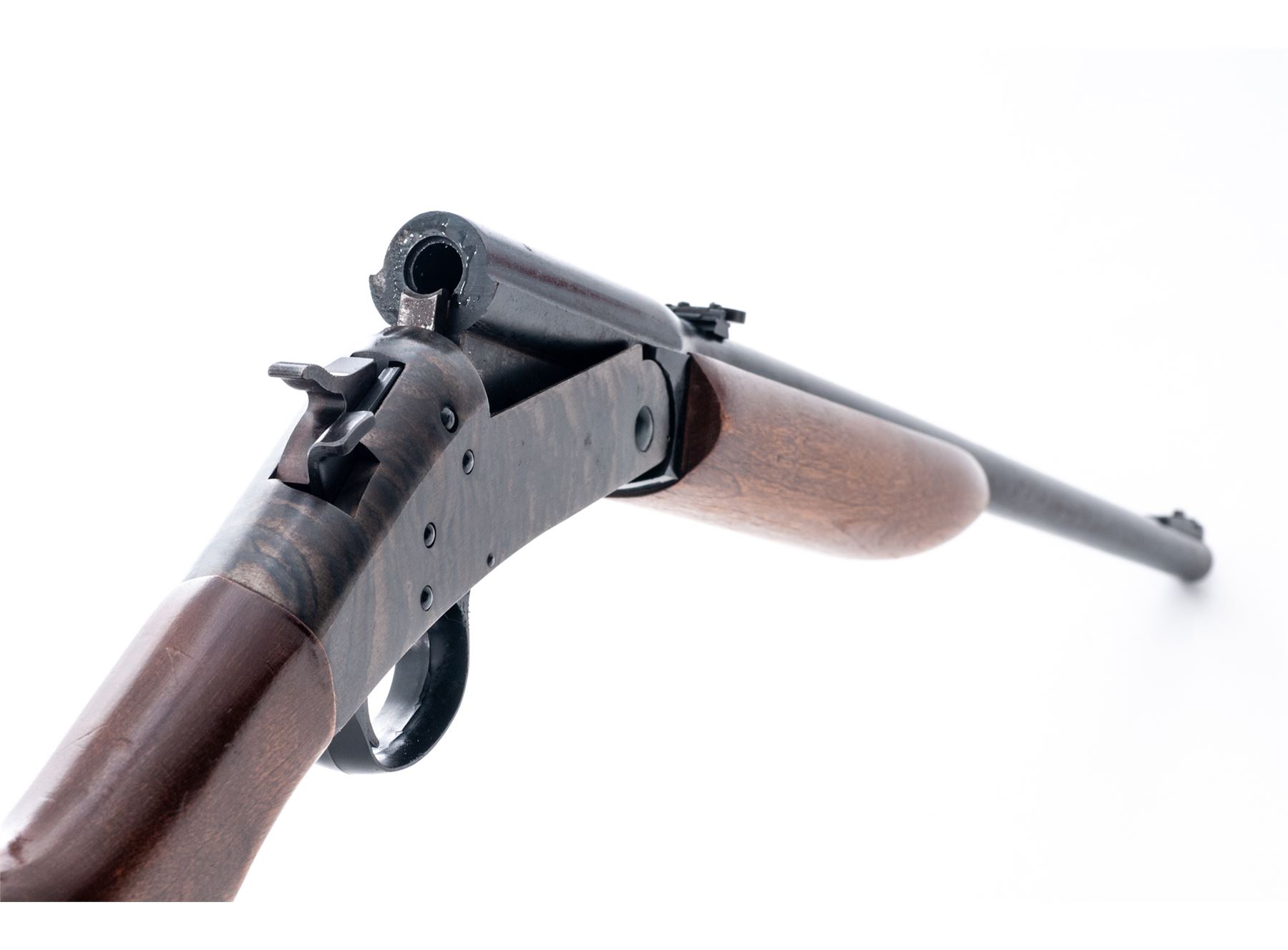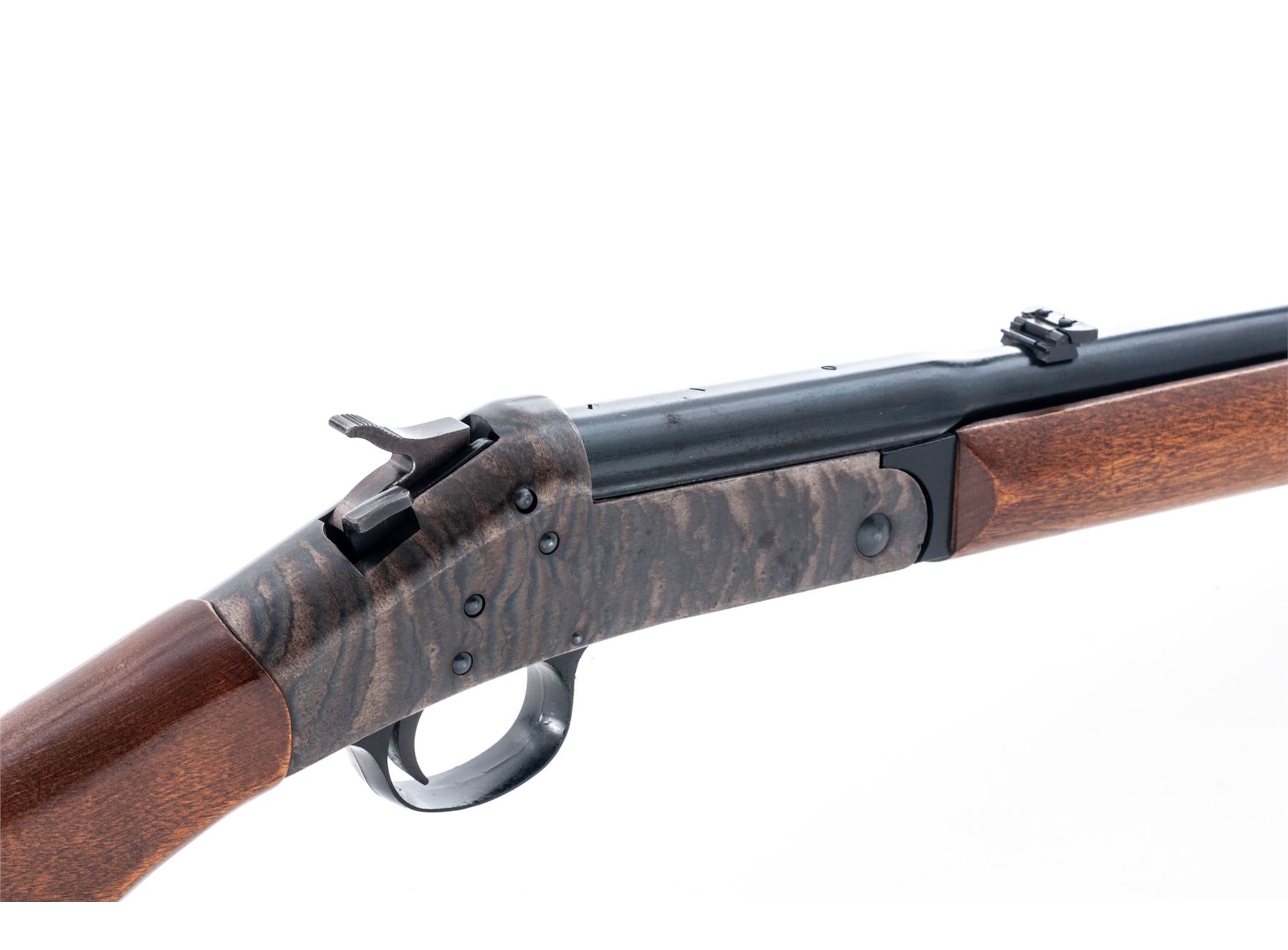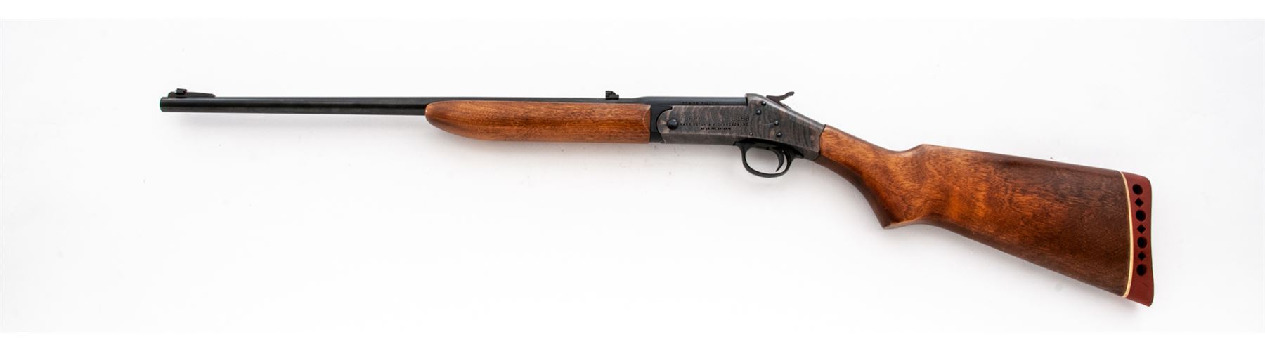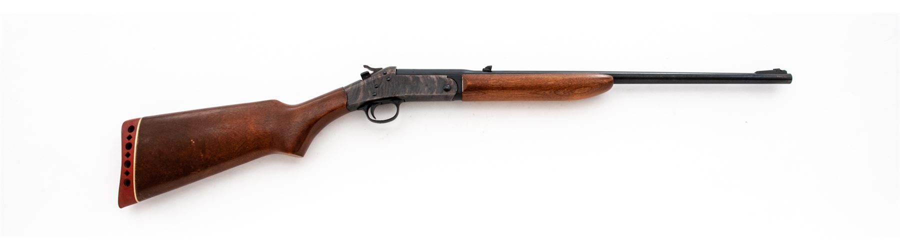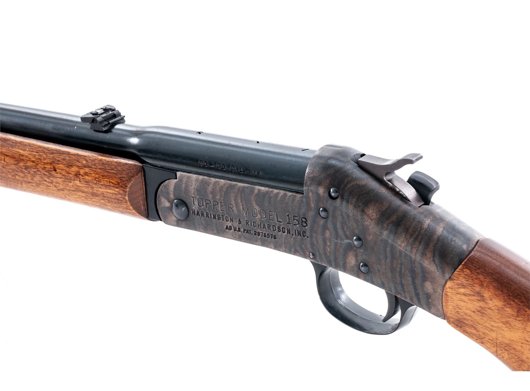 Harrington & Richardson ''Topper'' Model 158 Single Shot Tip-Up Rifle, NVSN, 30-30 Win. CF cal., blued 22'' round barrel, with dovetailed ramp-blade front and dovetailed small leaf rear sights marked ''.30-.30 Cal. Win.'' at breech; case hardened receiver, oil-stained hardwood forestock and buttstock with rubber buttpad. Condition is excellent retaining virtually all the original barrel blue and fiery case hardened colors. Stocks fit ''proud'' and are solid and smooth with scattered light handling marks. Action is smooth and sure; bore is brilliant. Est.: $150-$250. (C&R)