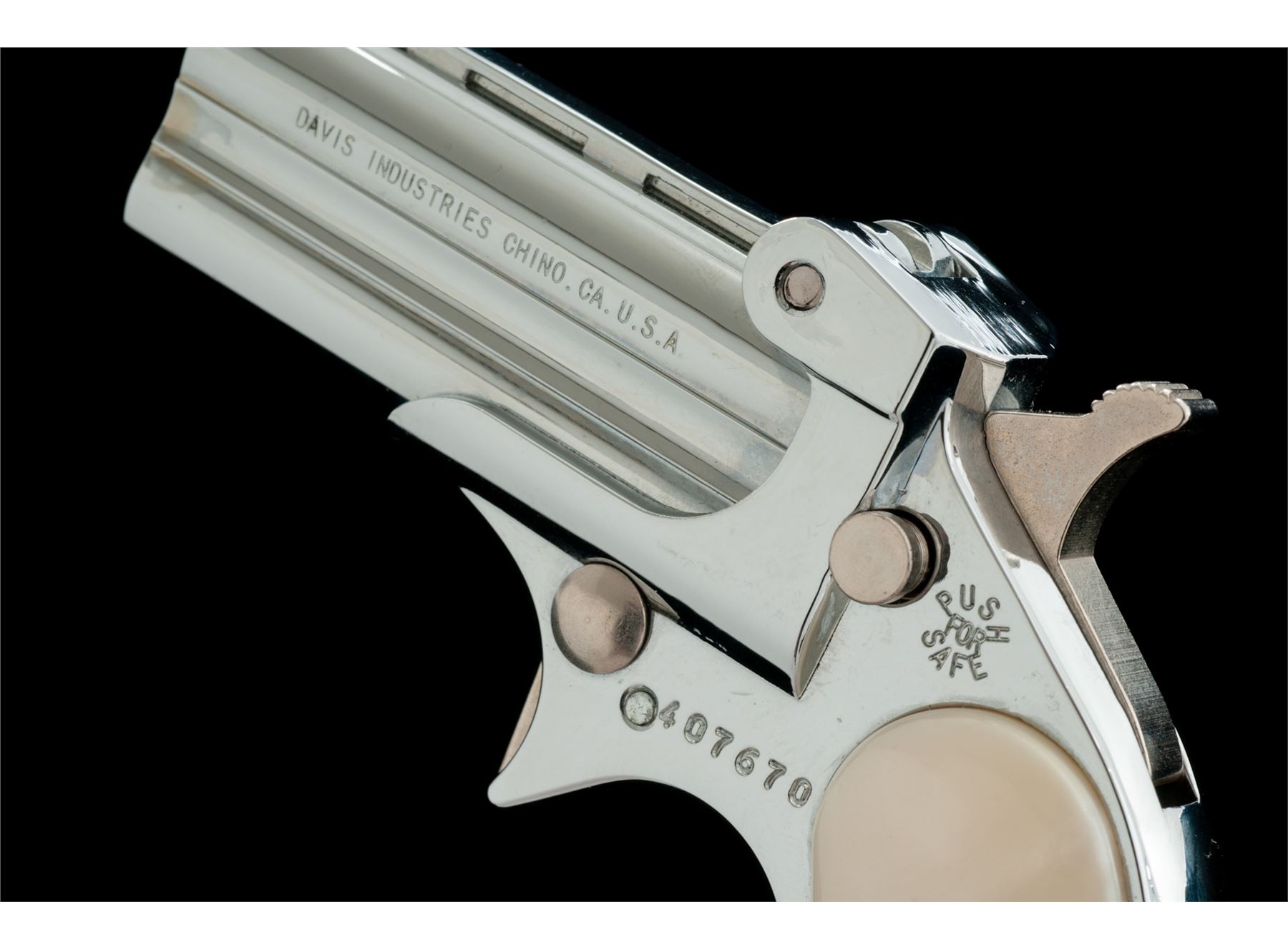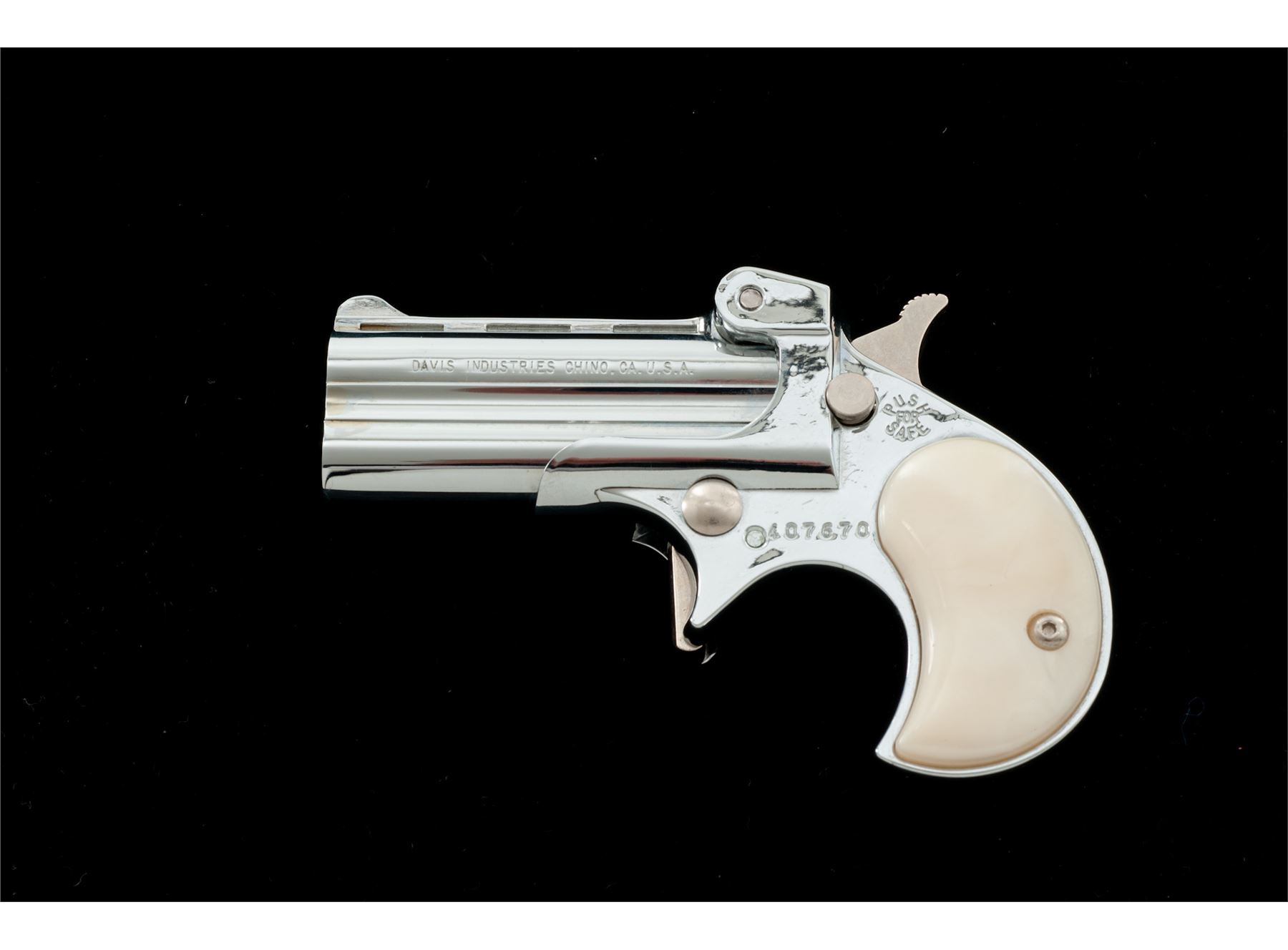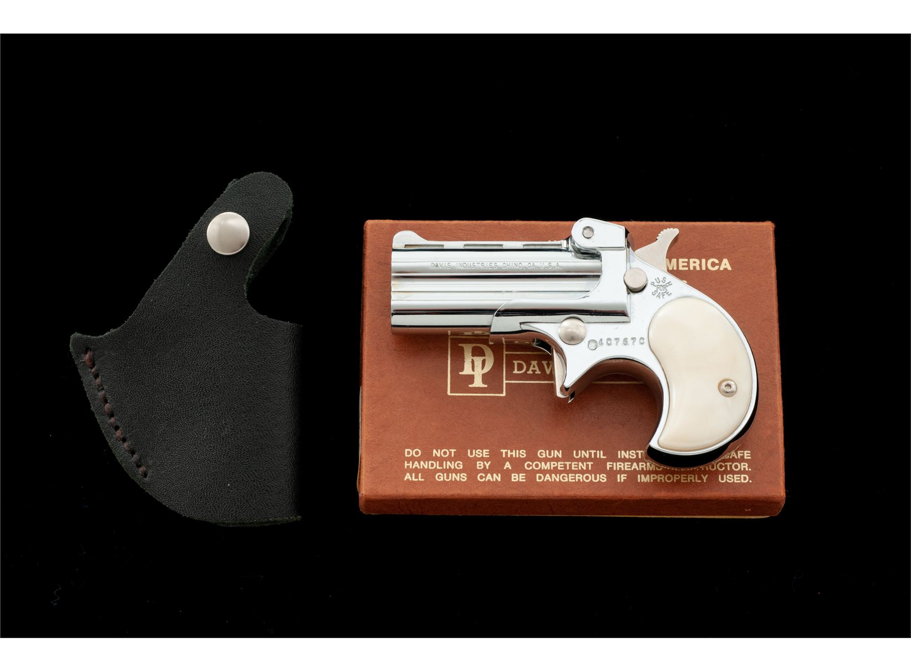Davis Industries Model D-25 Derringer, #407670, .25 Auto cal., 2-3/8'' barrels, chrome finish, faux pearl grips, with the original box that is numbered to the gun, owner's manual, other misc. factory paperwork, and black leather holster. Condition is near excellent with approx. 98%+ original chrome finish remaining, front end of the barrels with a few small spots of flaking. Right grip with a few shallow handling marks. Excellent action and bores. Holster appears as new. Two-piece box is in extraordinarily good condition and shows only very minor storage wear. Est.: $100-$200. (Modern/PPT)