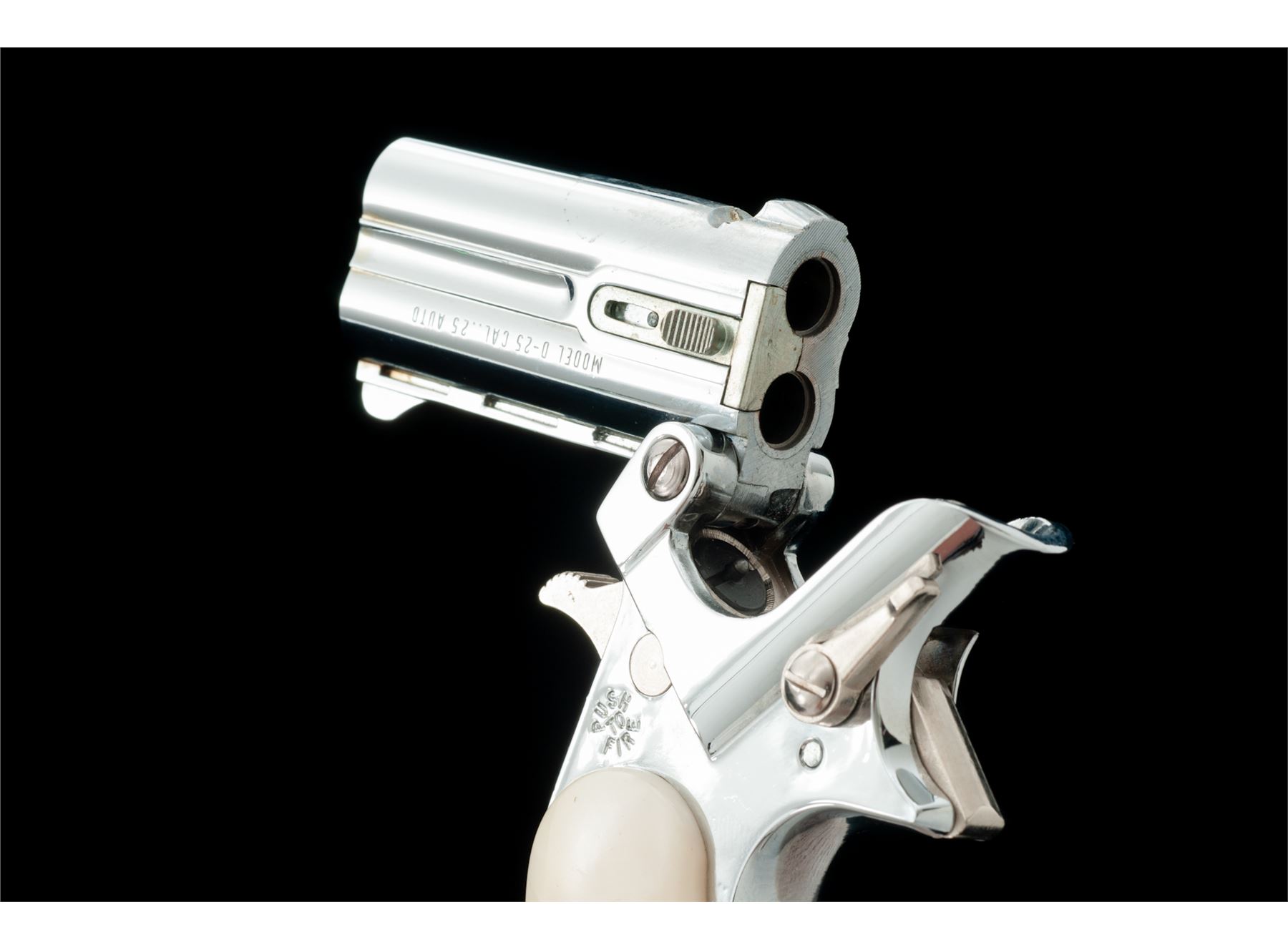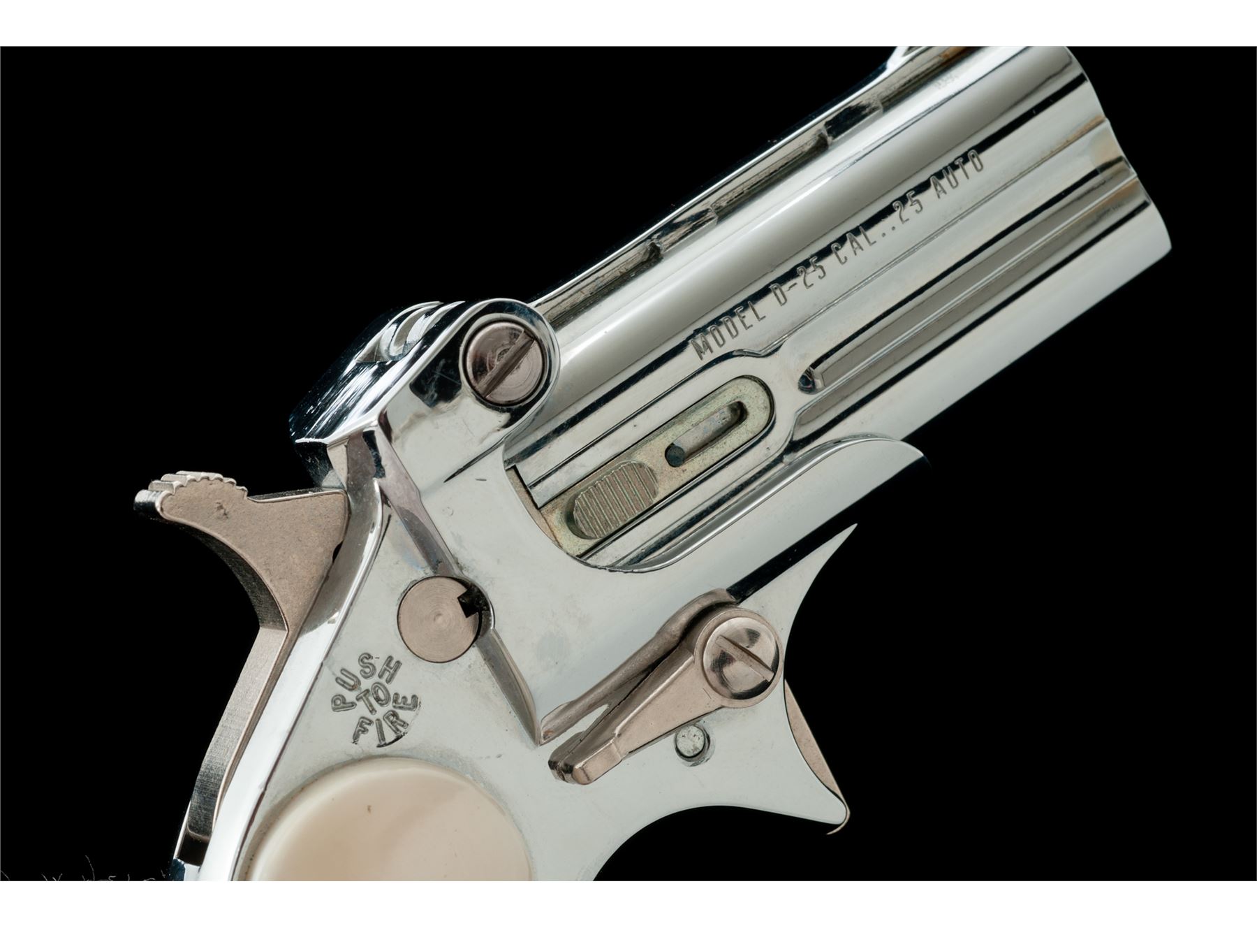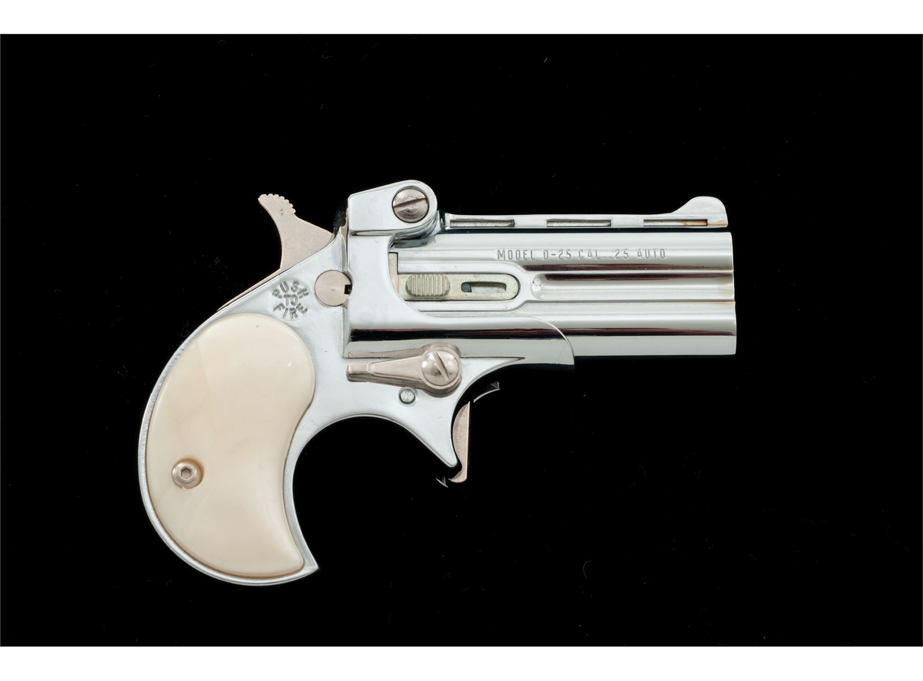 Davis Industries Model D-25 Derringer, #407670, .25 Auto cal., 2-3/8'' barrels, chrome finish, faux pearl grips, with the original box that is numbered to the gun, owner's manual, other misc. factory paperwork, and black leather holster. Condition is near excellent with approx. 98%+ original chrome finish remaining, front end of the barrels with a few small spots of flaking. Right grip with a few shallow handling marks. Excellent action and bores. Holster appears as new. Two-piece box is in extraordinarily good condition and shows only very minor storage wear. Est.: $100-$200. (Modern/PPT)