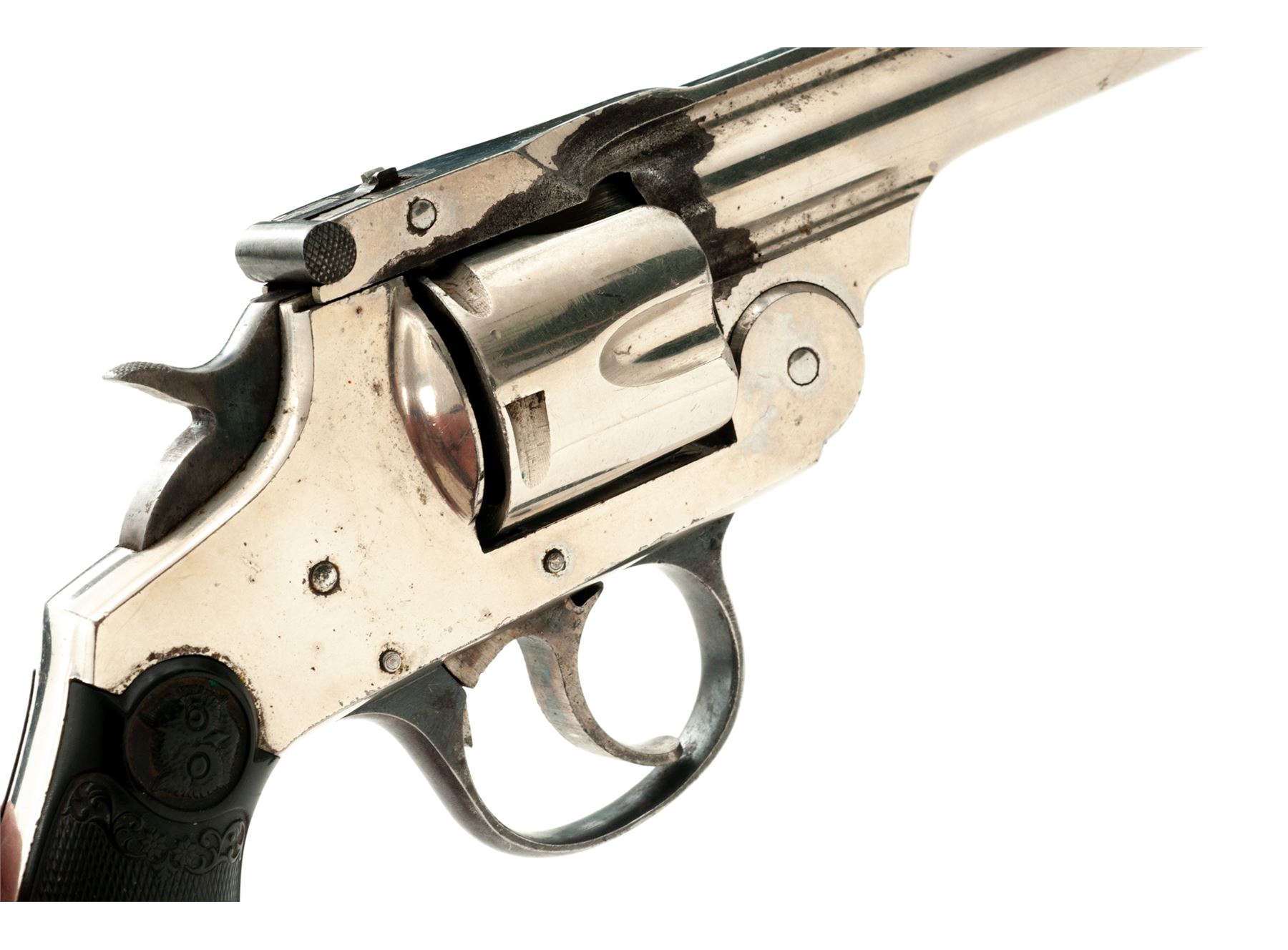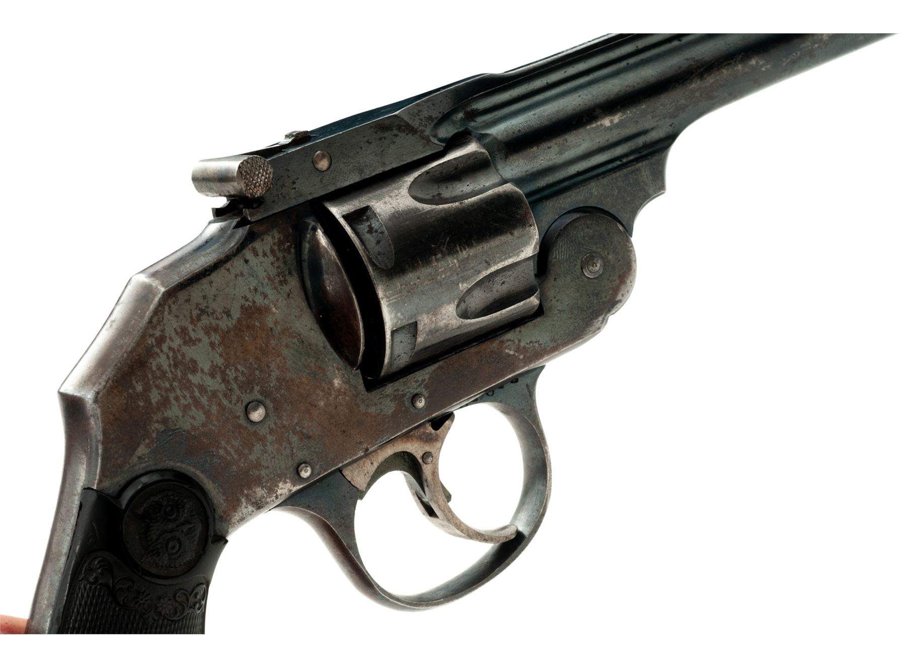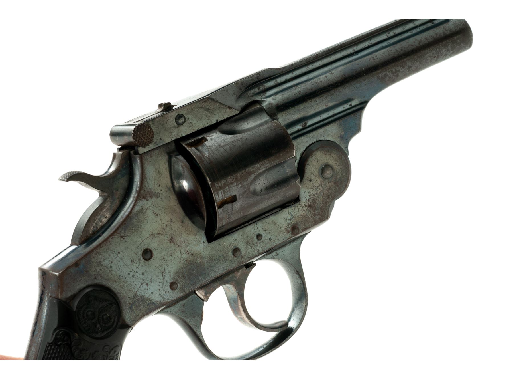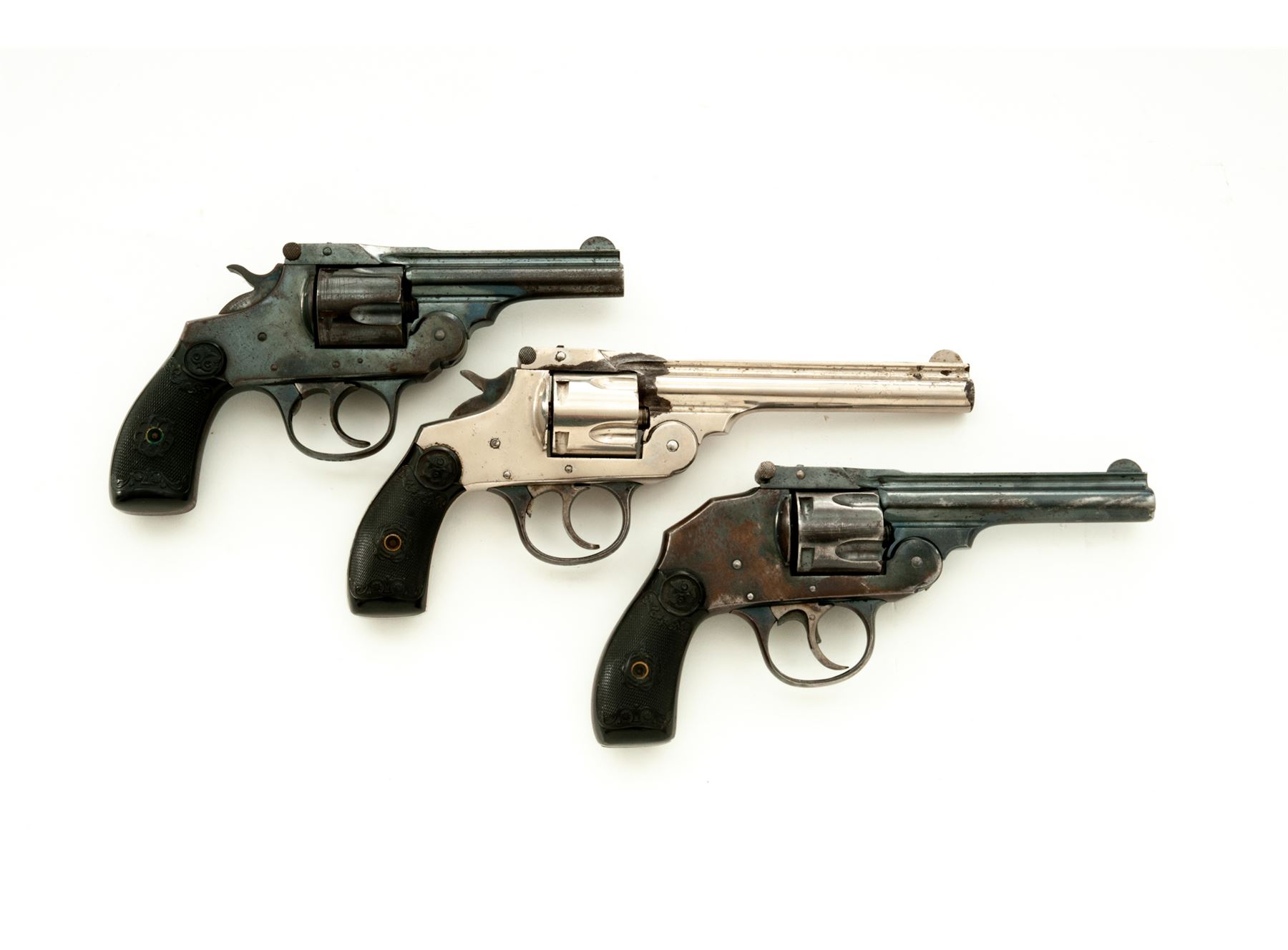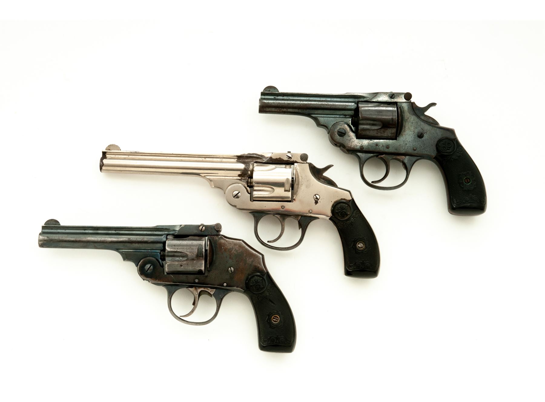 Lot of Three (3) 20th Century Iver Johnson Double Action Tip-Up Cartridge Revolvers: (1) #18224, .38 CF cal., 3.25'' round barrel, with integral blade front and tiny notched rear sight, 5-shot fluted cylinder with automatic cartridge ejector; frame with large S&W-style front barrel hinge and integral gripstraps, two-piece checkered black hard rubber grips with the encircled ''Owl's Head'' logo in relief at top and entwined ''IJ'' initials at center. Originally with full blued finish but for case hardened hammer and trigger. Condition is fine retaining 75%-80% deep original blue with minor nicks and scratches; grips show sharp checkering and ornate detailing. Action is crisp; bore is shiny with defined rifling. (2) Hammerless, NVSN, .38 CF cal., 4'' round barrel with integral blade front and tiny notched rear sights, 5-shot fluted cylinder with automatic cartridge ejector; frame with large S&W-style front barrel hinge and integral grip straps; two-piece checkered black hard rubber grips with the encircled ''Owl's Head'' logo in relief at top and an ornate border design. Originally with full blued finish but for case hardened trigger. Condition is fine retaining approx. 60% deep original blue, missing mainly at frame sides and backstrap and with minor nicks and scratches; mottled case colors to trigger. Grips show sharp checkering and detailing. Action is crisp; bore is shiny with defined rifling. (3) #25229, .38 CF cal., 5'' round barrel with integral blade front and tiny notched rear sight, 5-shot fluted cylinder with automatic cartridge ejector; frame with large S&W-style front barrel hinge and integral gripstraps; two-piece checkered black hard rubber grips with the encircled ''Owl's Head'' logo in relief at top and an ornate border design. Originally with full nickel-plated finish but for blued triggerguard and case hardened hammer and trigger. Condition is near excellent retaining approx. 85% original nickel, flaking at muzzle, right side barrel-rib line, and at barrel-topstrap juncture. Grips show sharp checkering and detailing. Action is crisp; bore is clean with defined rifling. Est.: $350-$550 /Lot. (C&R/PPT)