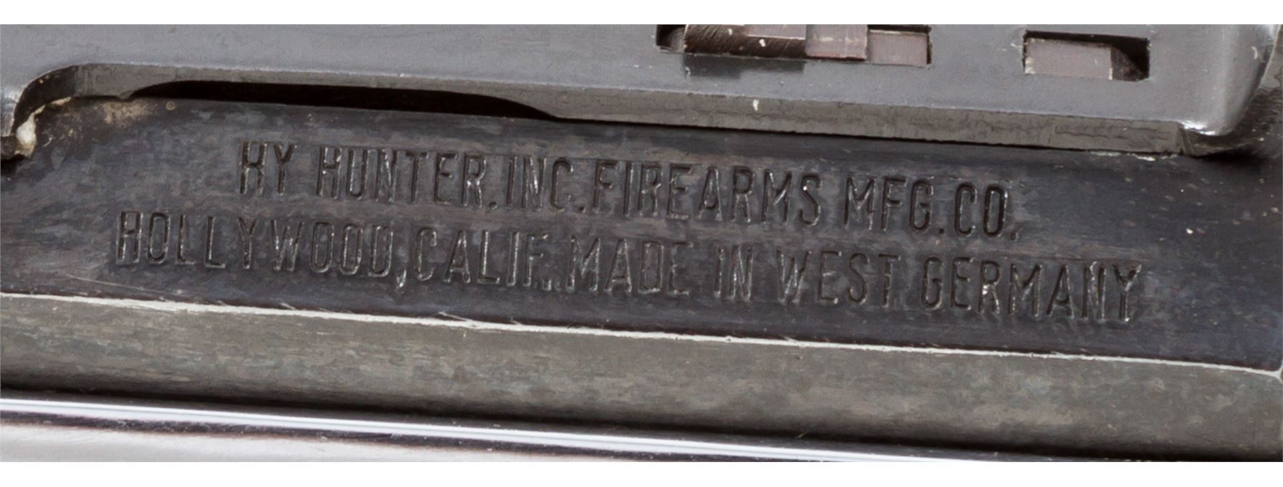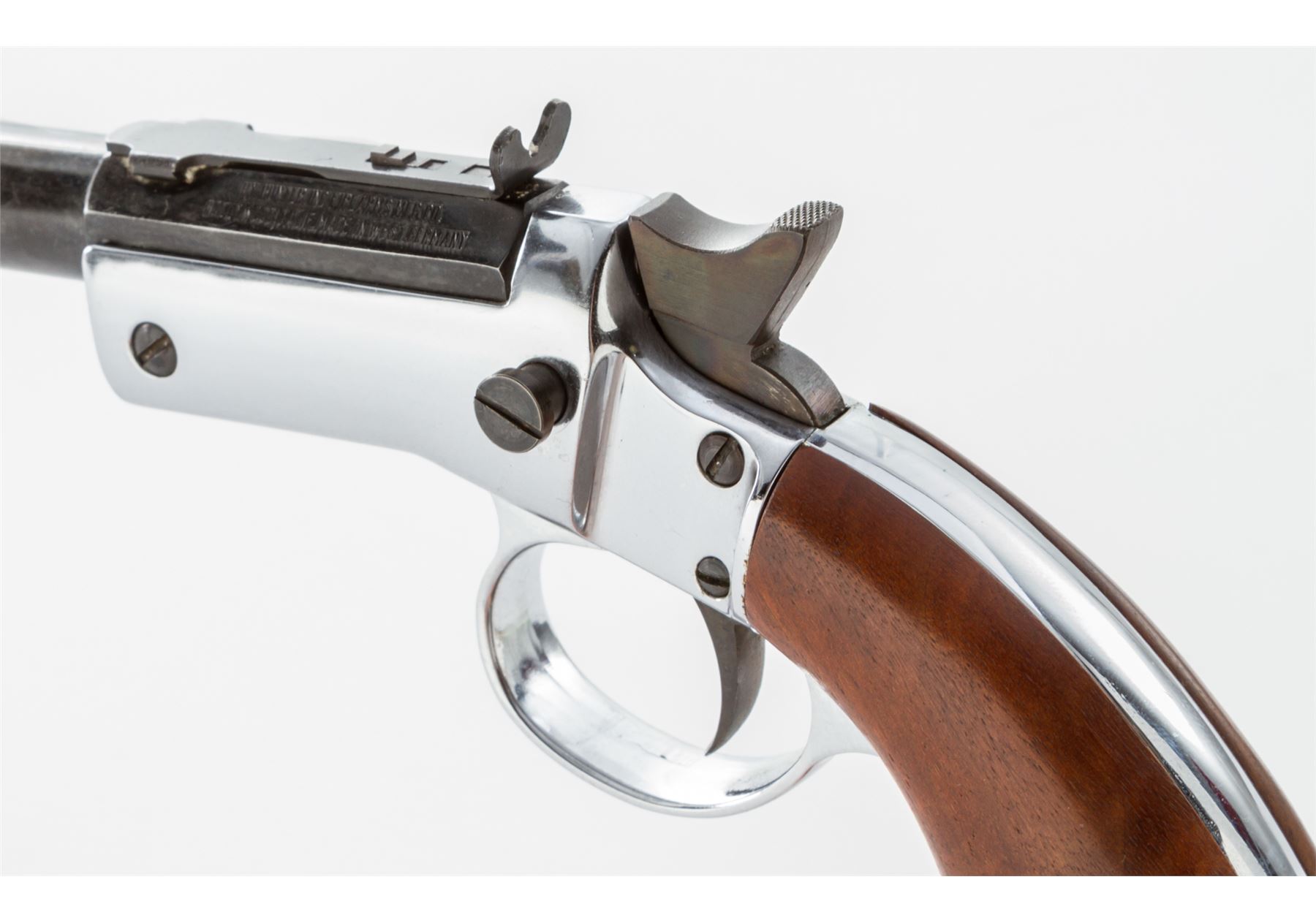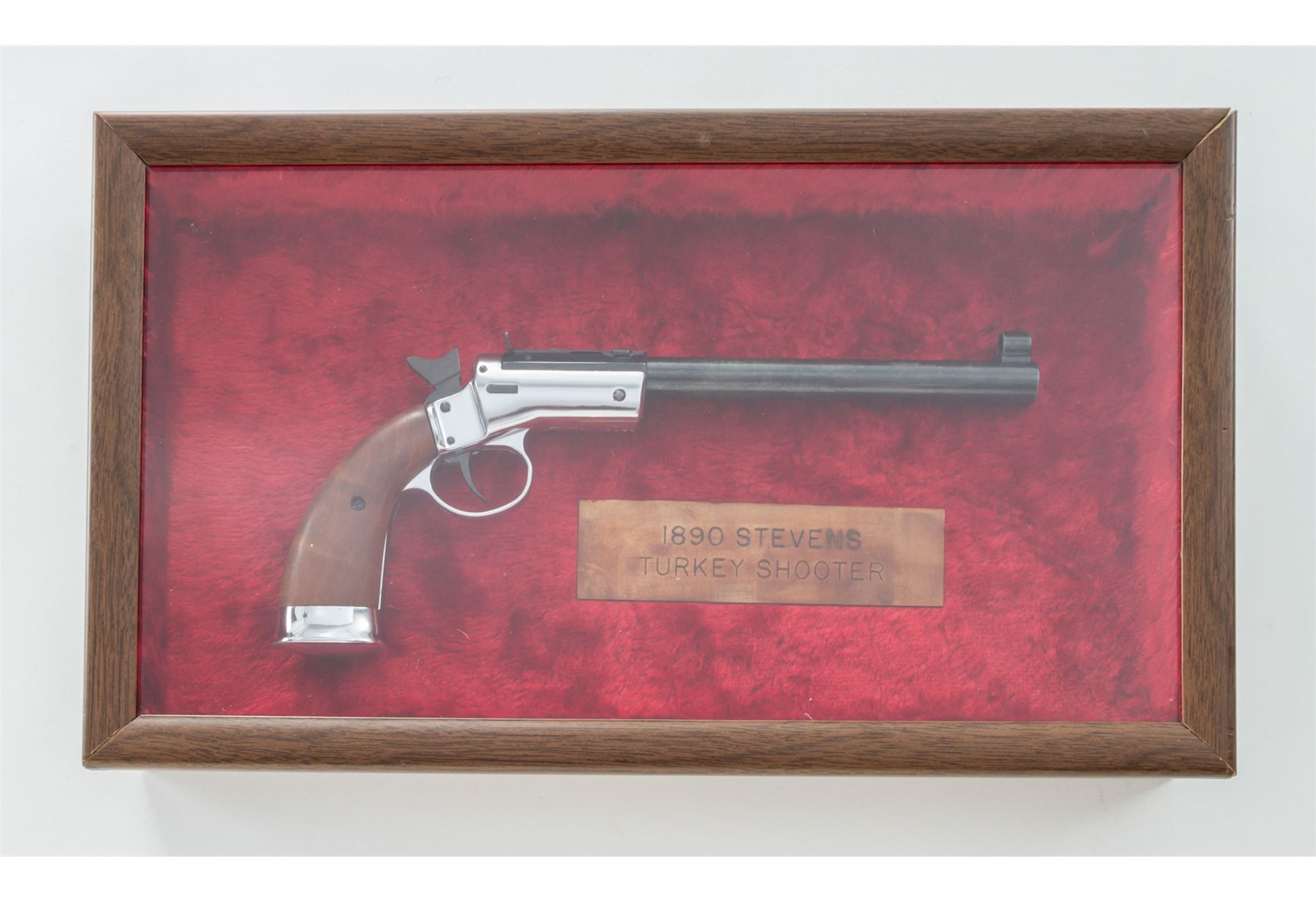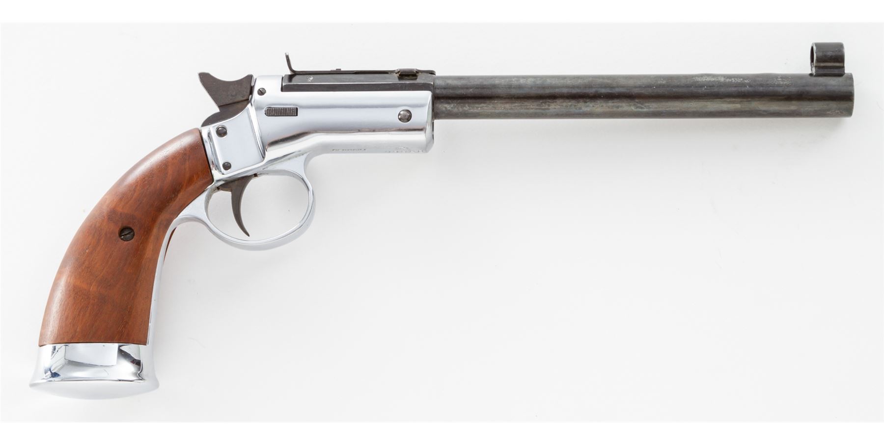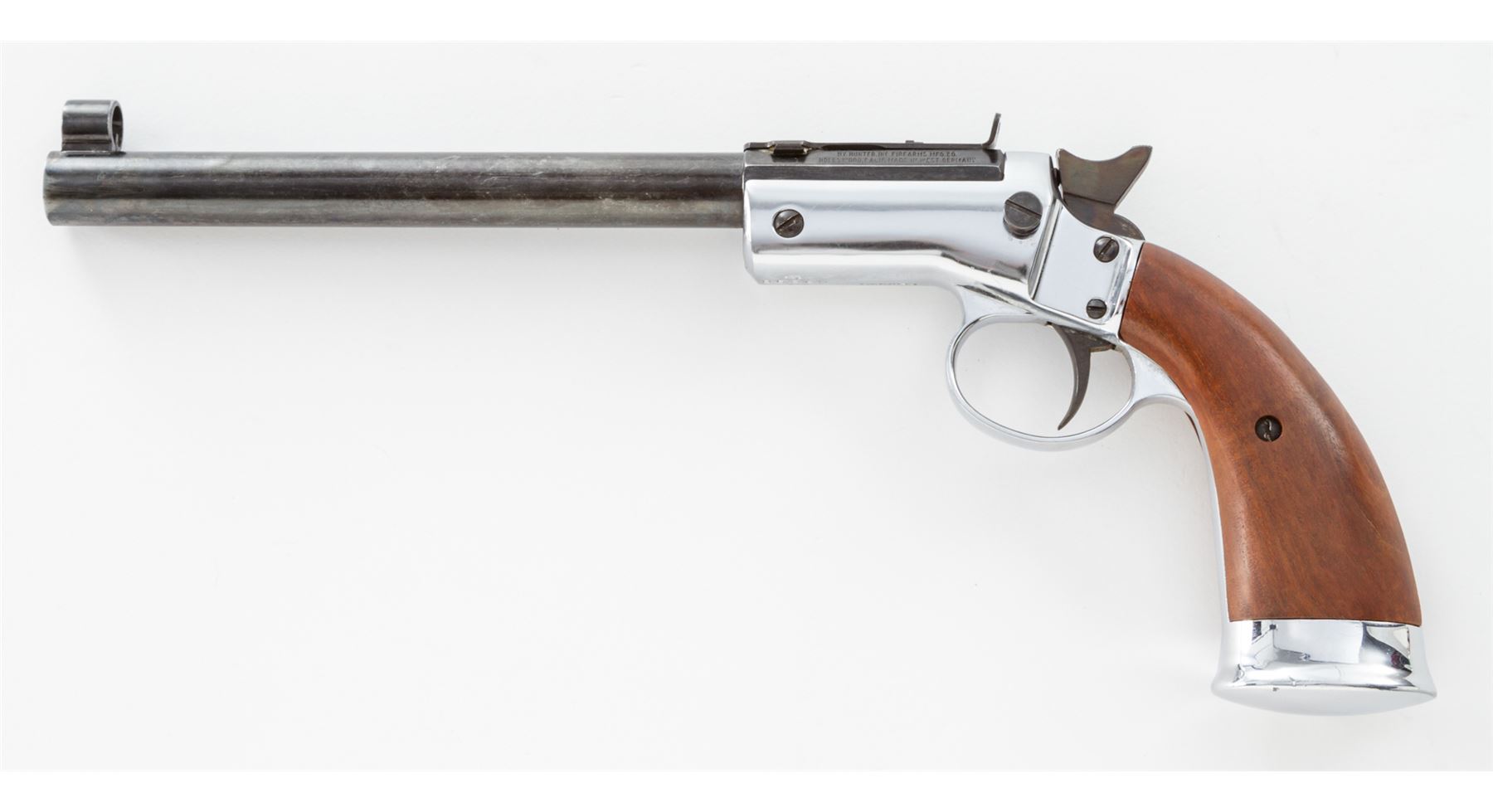 Hy Hunter Single Shot Spurtrigger Tip-Up Cartridge Pistol, in the Style of the Stevens Pocket Rifle, #05660, .22 RF cal., blued 8'' part octagon-part round heavy barrel with hooded front and adjustable open rear sights, marked ''Hy Hunter, Inc. Firearms Mfg. Co./Hollywood, Calif. Made in West Germany'' in two lines on left angled flat, with a proofmark on opposite angled flat; chrome-plated frame with integral triggerguard, gripstraps and buttcap marked underneath with the serial number, two proofmarks, and ''Germany''; case hardened hammer and trigger; smooth varnished walnut grips. In glass-topped display case with plaque marked ''1890 Stevens Turkey Shooter''. Condition is excellent retaining most of its original finishes, sharp edges and markings but for several bulges in the barrel toward the muzzle. Action is crisp, bore is shiny with clean rifling. Est.: $100-$150. (C&R/PPT)
