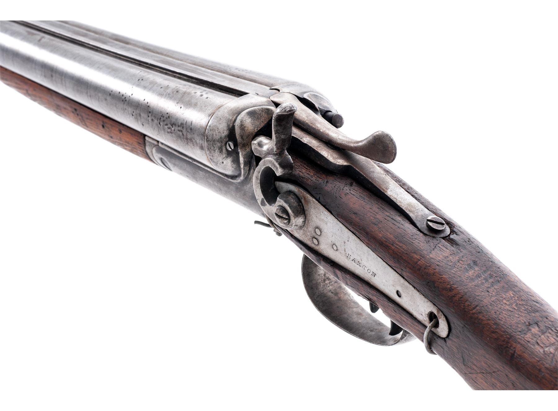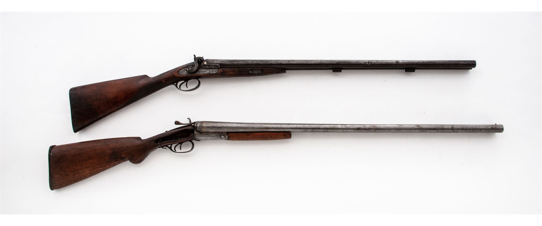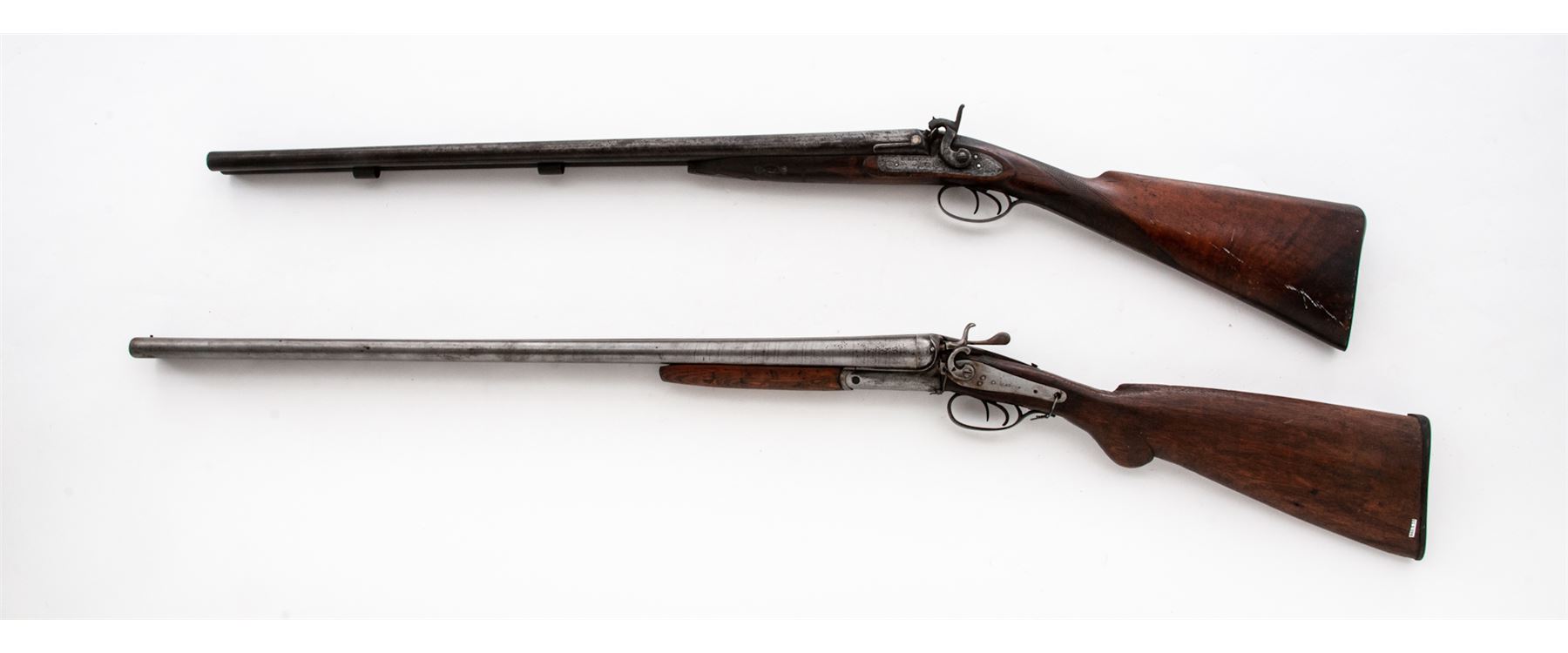 Lot of Two (2) Relic Condition Double Barrel Percussion Shotguns: (1) Marked ''Saxton'' on lockplate and ''Laminated Steel'' on topstrap, 10 ga., 32'' barrels, with double triggers. Missing sideplate and one hammer, wired together at wrist and triggerguard. Stock appears to be hand carved. (2) ''William Moore, London, Laminated Steel'' marked on topstrap, 10 ga., 30'' barrels, lightly engraved metal surfaces including top of barrels, with double triggers. One hammer is broken and missing rod. Checkered stocks are worn smooth showing much wear and discoloration. Est.: $250-$350/lot. (Both Antique)
