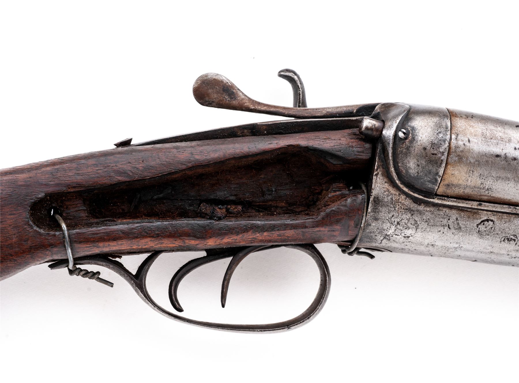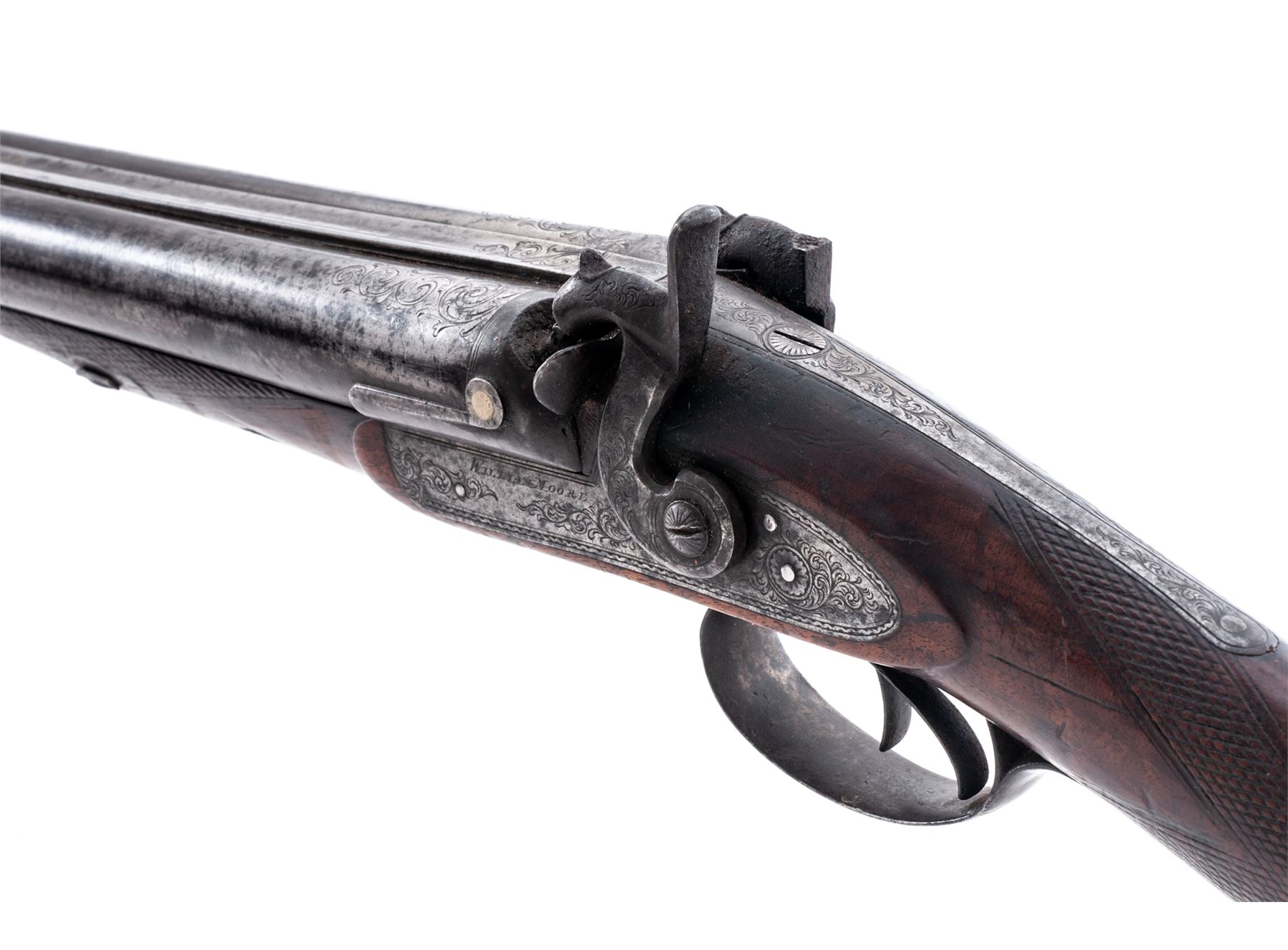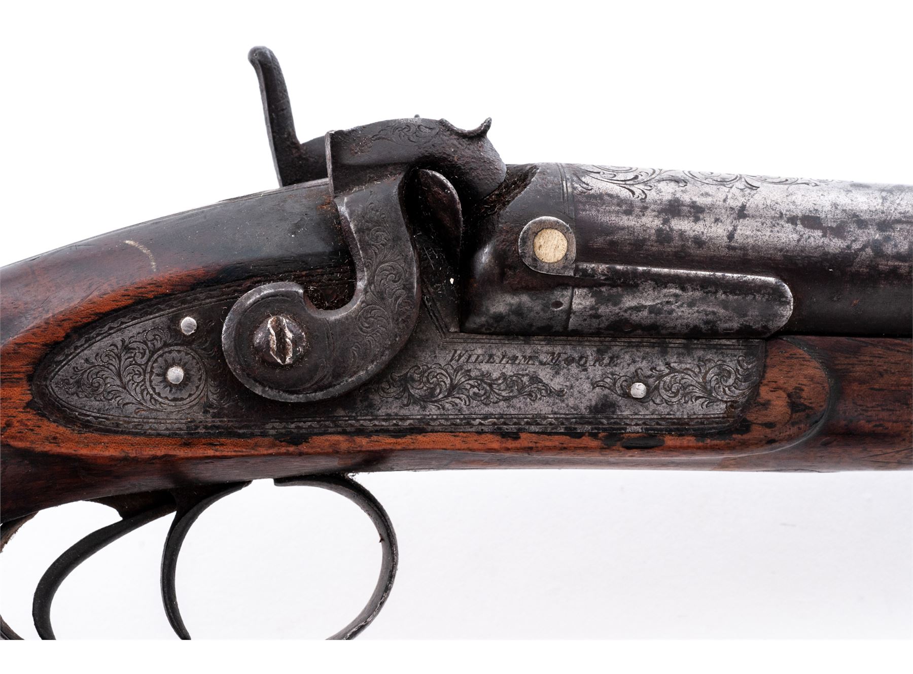 Lot of Two (2) Relic Condition Double Barrel Percussion Shotguns: (1) Marked ''Saxton'' on lockplate and ''Laminated Steel'' on topstrap, 10 ga., 32'' barrels, with double triggers. Missing sideplate and one hammer, wired together at wrist and triggerguard. Stock appears to be hand carved. (2) ''William Moore, London, Laminated Steel'' marked on topstrap, 10 ga., 30'' barrels, lightly engraved metal surfaces including top of barrels, with double triggers. One hammer is broken and missing rod. Checkered stocks are worn smooth showing much wear and discoloration. Est.: $250-$350/lot. (Both Antique)