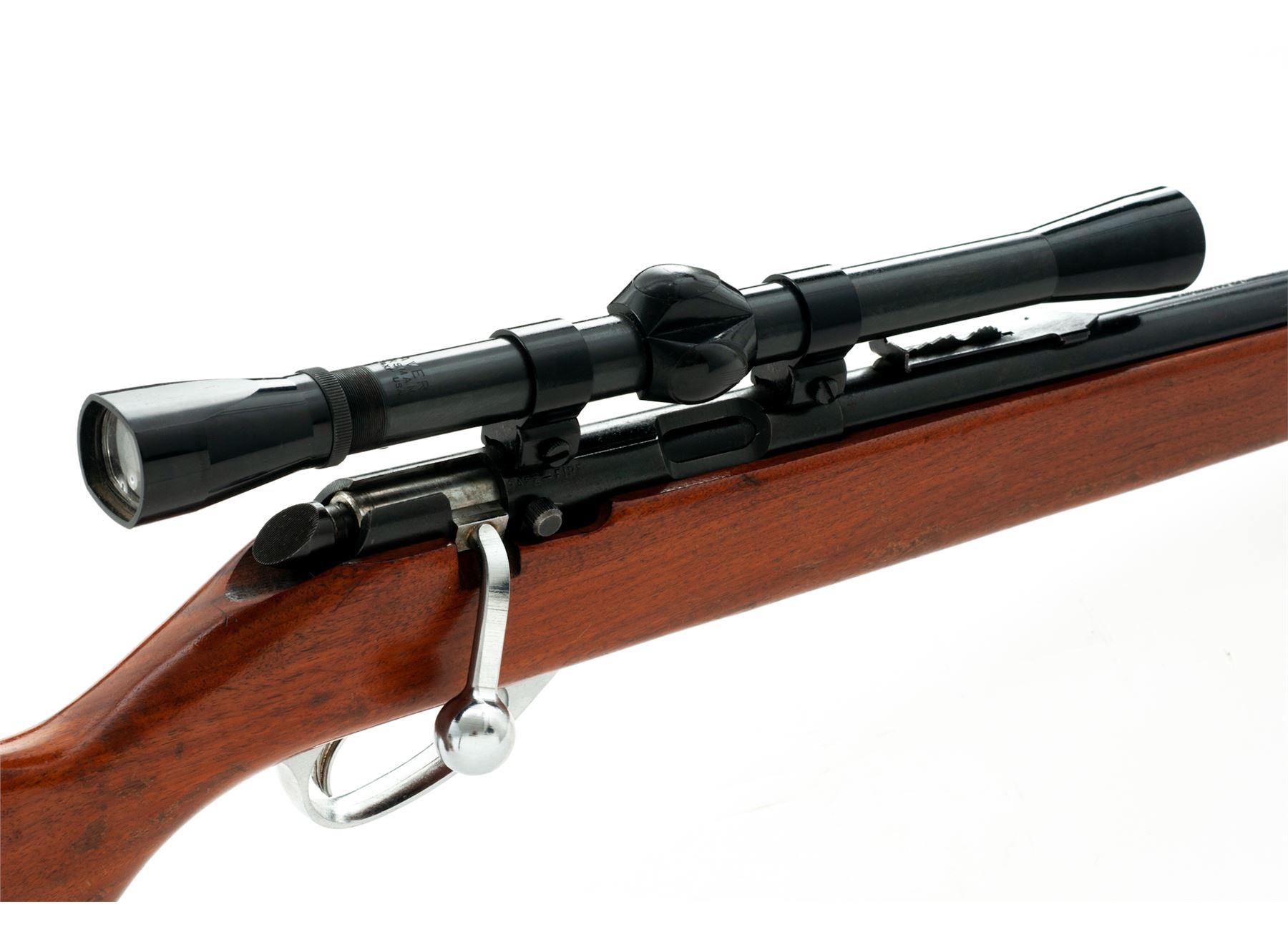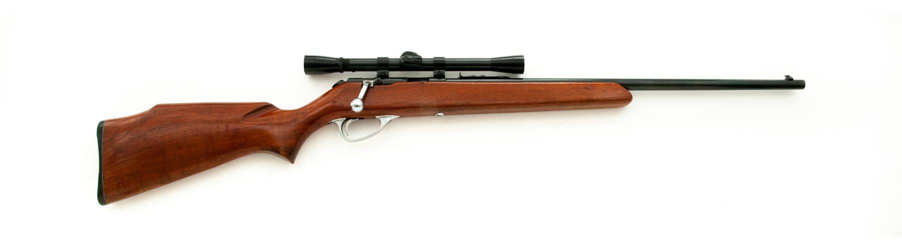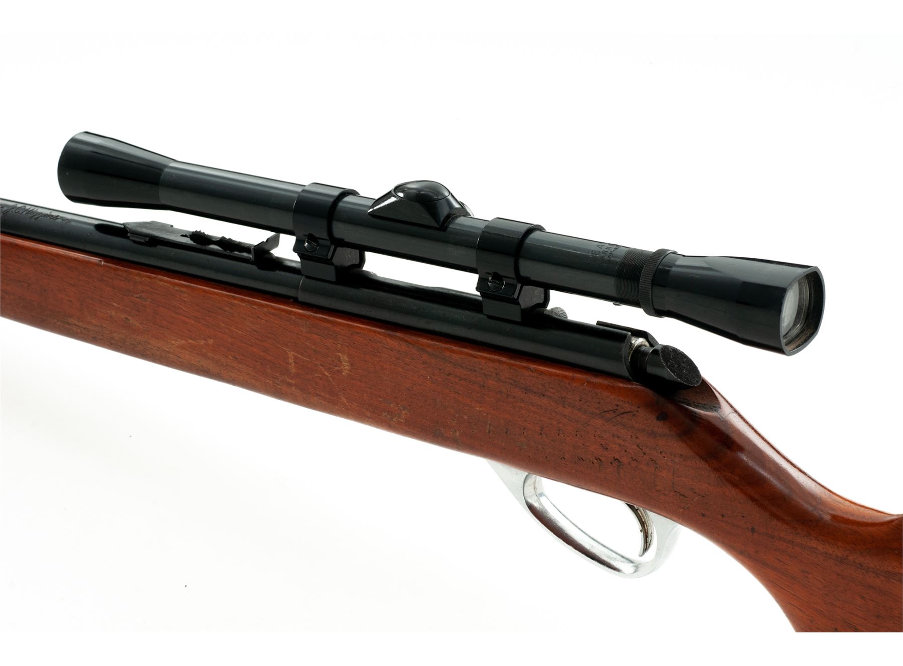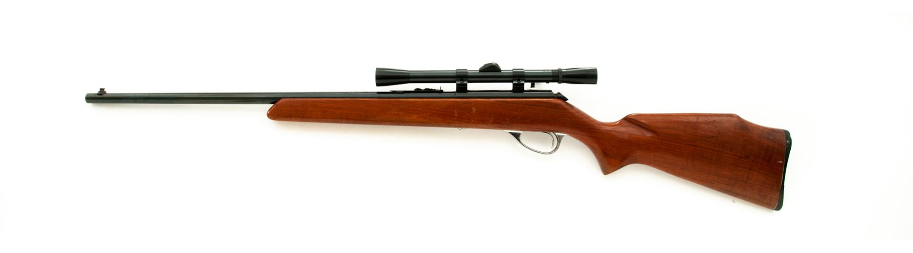 J.C. Higgins Model 41-DLA Bolt Action Single-Shot Rifle, with scope, NVSN, .22 Auto RF cal., blued 27'' round barrel, with dovetailed bead-blade front and adjustable leaf open rear sights. Steel receiver is mounted with a Weaver ''Marksman'' 12'' scope marked ''M 3/4'' - 4XW U.S.A.''; bolt with chromed handle, chromed grooved trigger and loop guard; varnished hardwood pistol-grip halfstock with grooved black plastic buttplate. Condition is fine, the blued and plated parts retaining approx. 96% original finish, the scope with excellent optics and two end caps. Stock is smooth and solid with normal handling marks and nice color. Action is smooth; bore is bright with deep rifling. Est.: $100-$200. (C&R)
