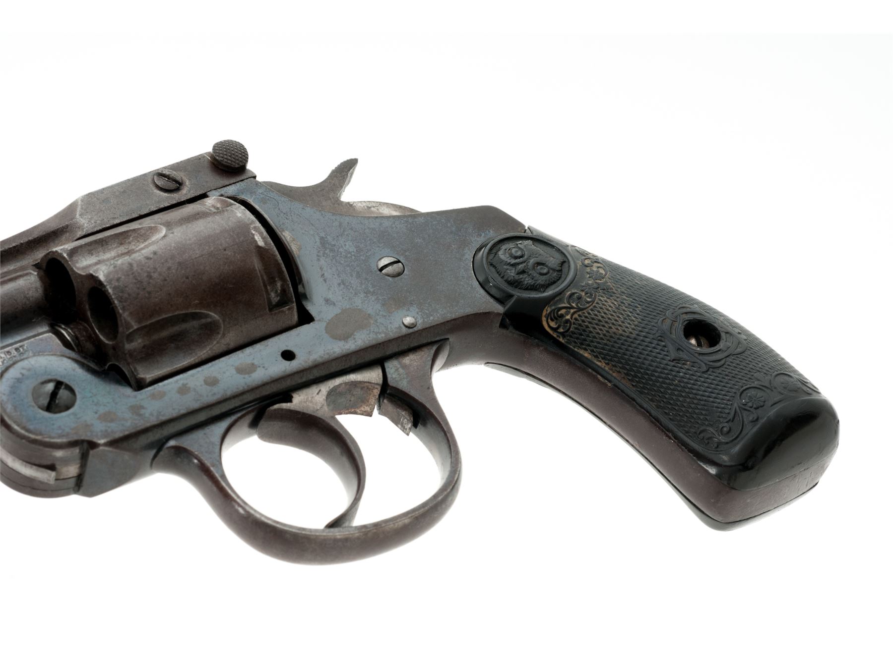 Iver Johnson Double Action Top-Break Pocket Revolver, NVSN, .38 CF cal., 3.25'' round barrel marked with two-line Iver Johnson address and three-line patent dates, 5-shot round fluted cylinder with automatic ejector, frame with integral gripstraps, and two-piece checkered black hard rubber grips having the Iver Johnson ''Owl's Head'' logo. Condition is very good retaining approx. 80% original blue finish to frame sides, left barrel lug above hinge, and sides of triggerguard, the balance a smooth brown age patina; silvering case hardening hues to hammer and trigger. Grips with only light wear and no cracks or chips. Action is sticky and cylinder does not turn, bore appears clean with distinct rifling. Est.: $75-$150. (C&R/PPT)