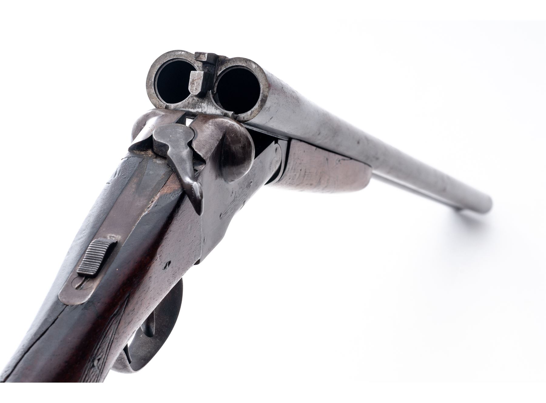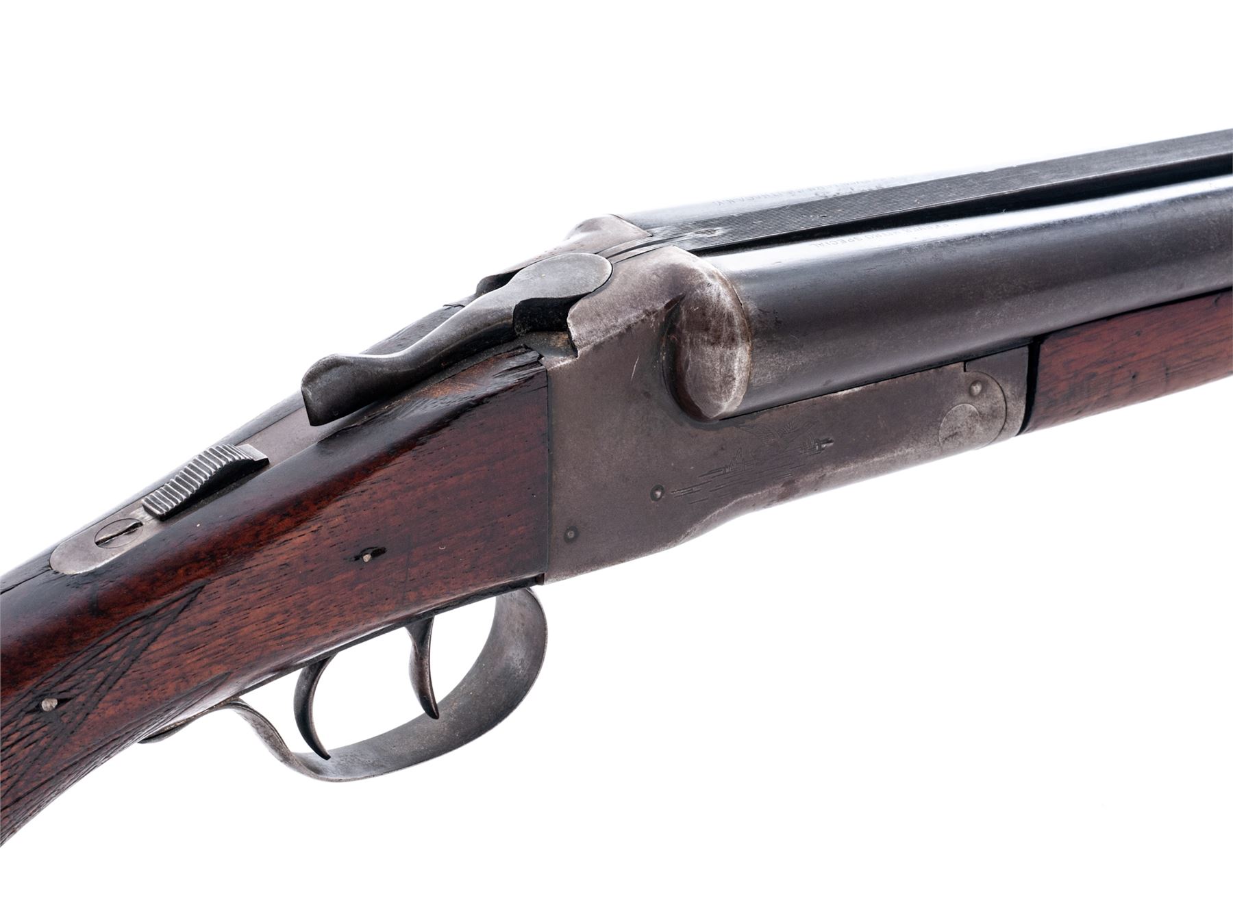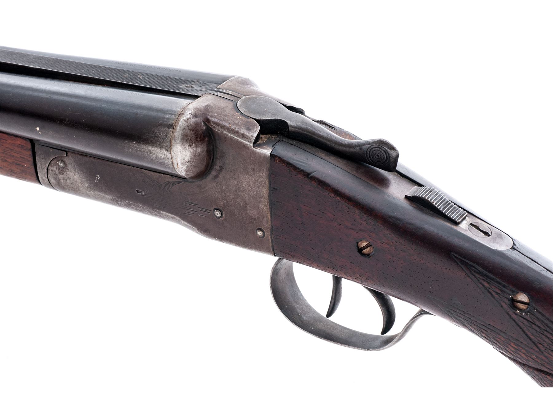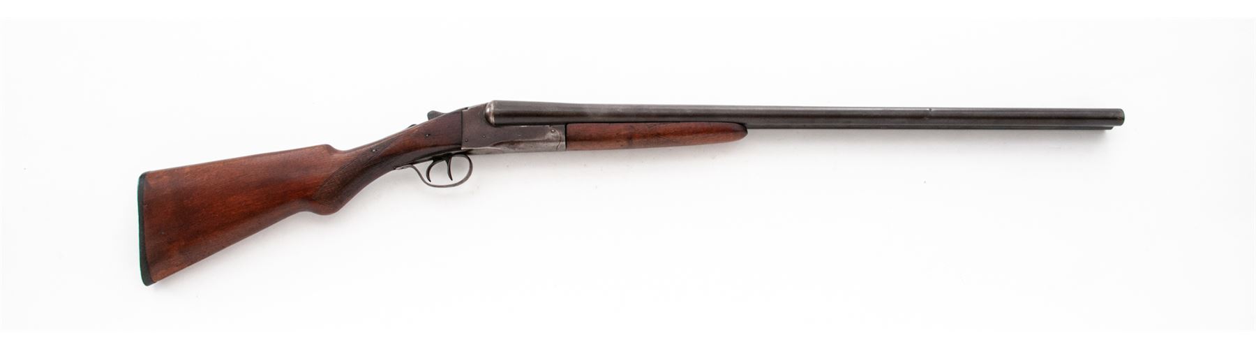 Lefever Side-by-Side Double Barrel Shotgun, #175336, 12 ga., blued 28'' barrels with bead front sight on full-length matted top rib choked F/IC and marked ''Lefever Nitro Special'' on right and ''Lefever Arms Co., Ithaca, N.Y.'' on left; steel receiver with sliding safety, auto ejectors, and water birds lightly engraved on both sides; loop triggerguard; varnished walnut forend checkered in a diamond pattern and pistol-grip buttstock checkered at wrist with grooved black hard rubber buttplate. Condition is good, the barrels retaining a smooth blue-brown patina; the receiver gunmetal gray. Stocks are smooth with worn checkering and a poorly-repaired break at wrist. Action functions as designed; bores are brilliant. Est.: $100-$200. (C&R)