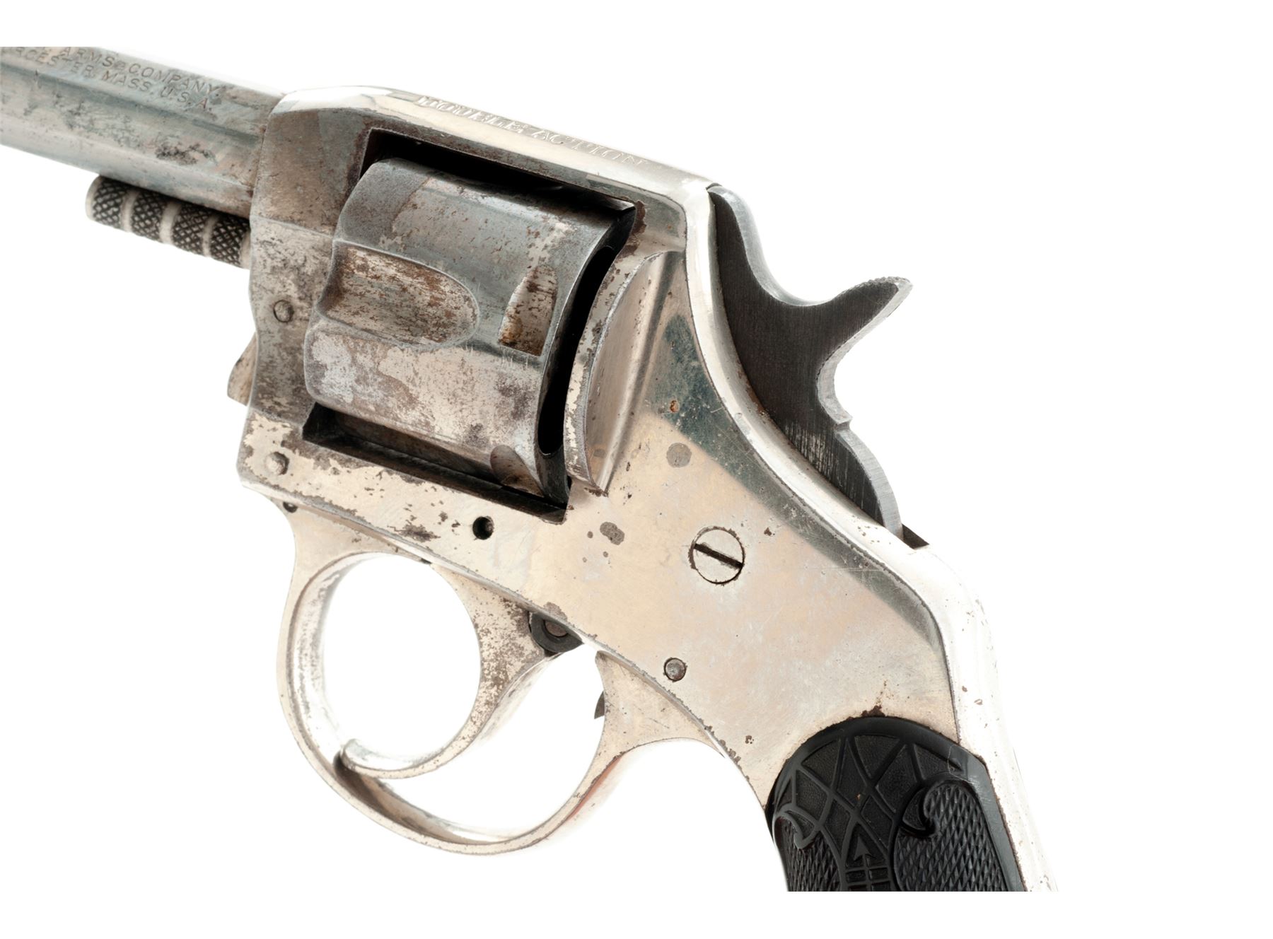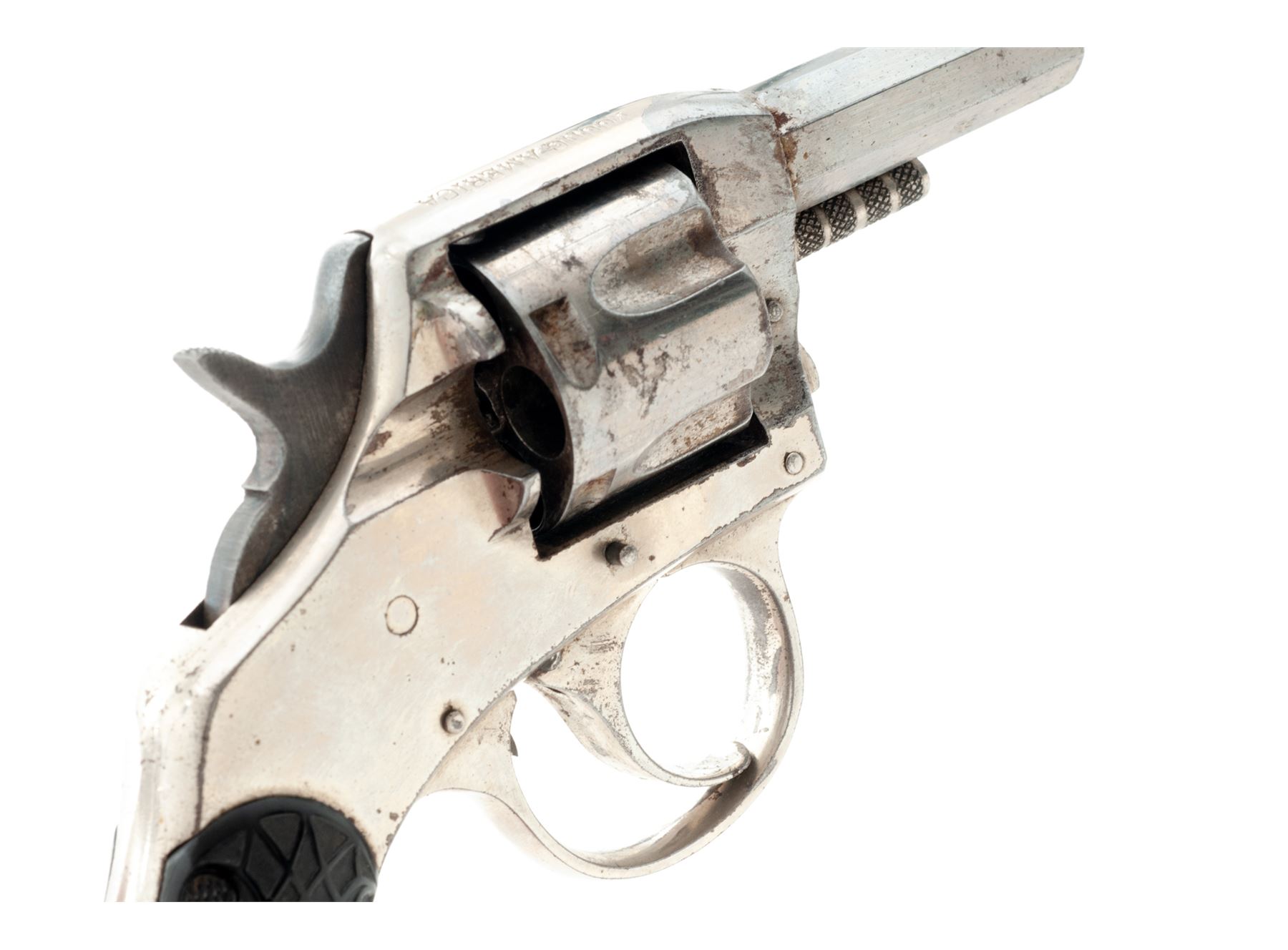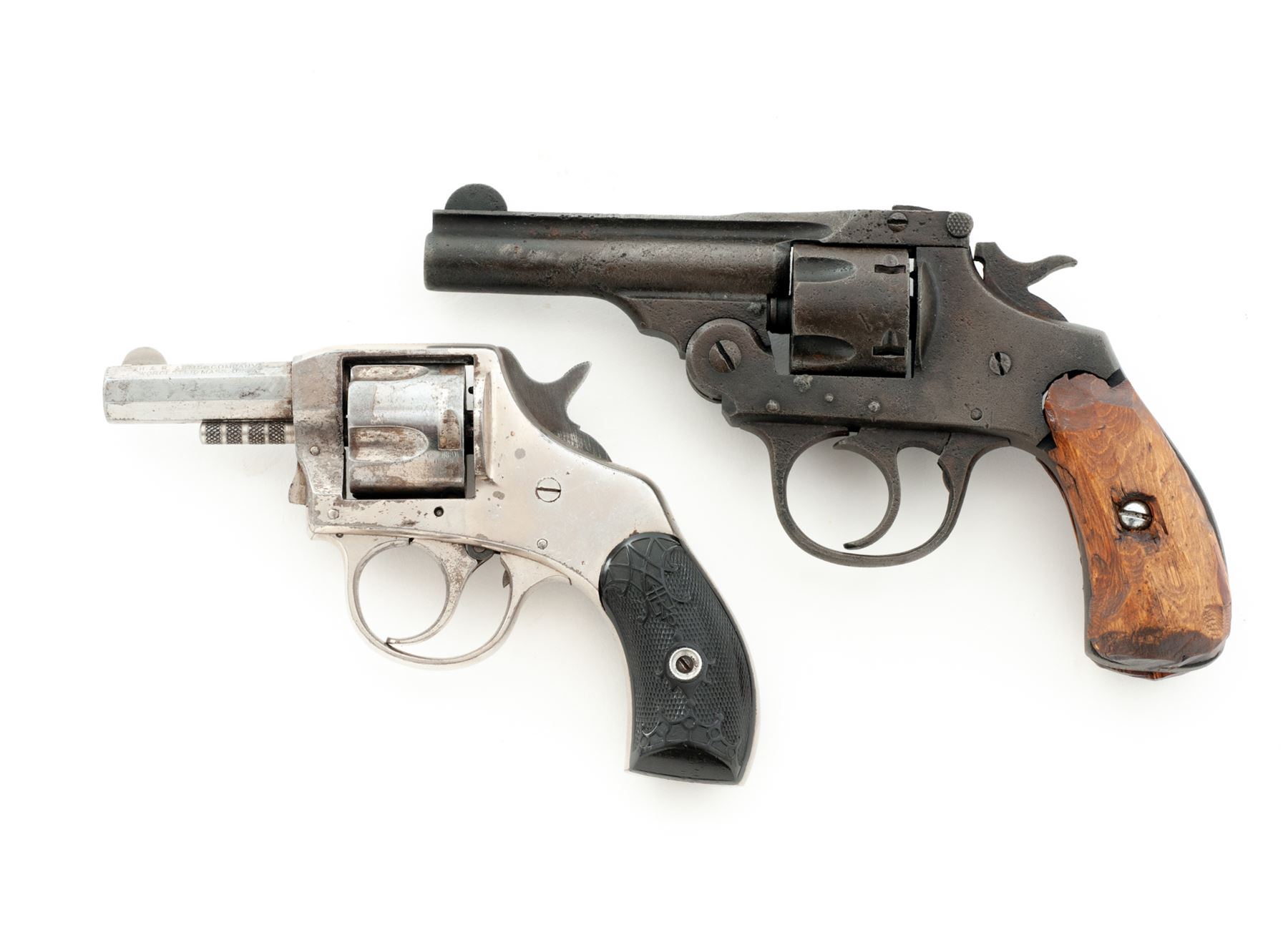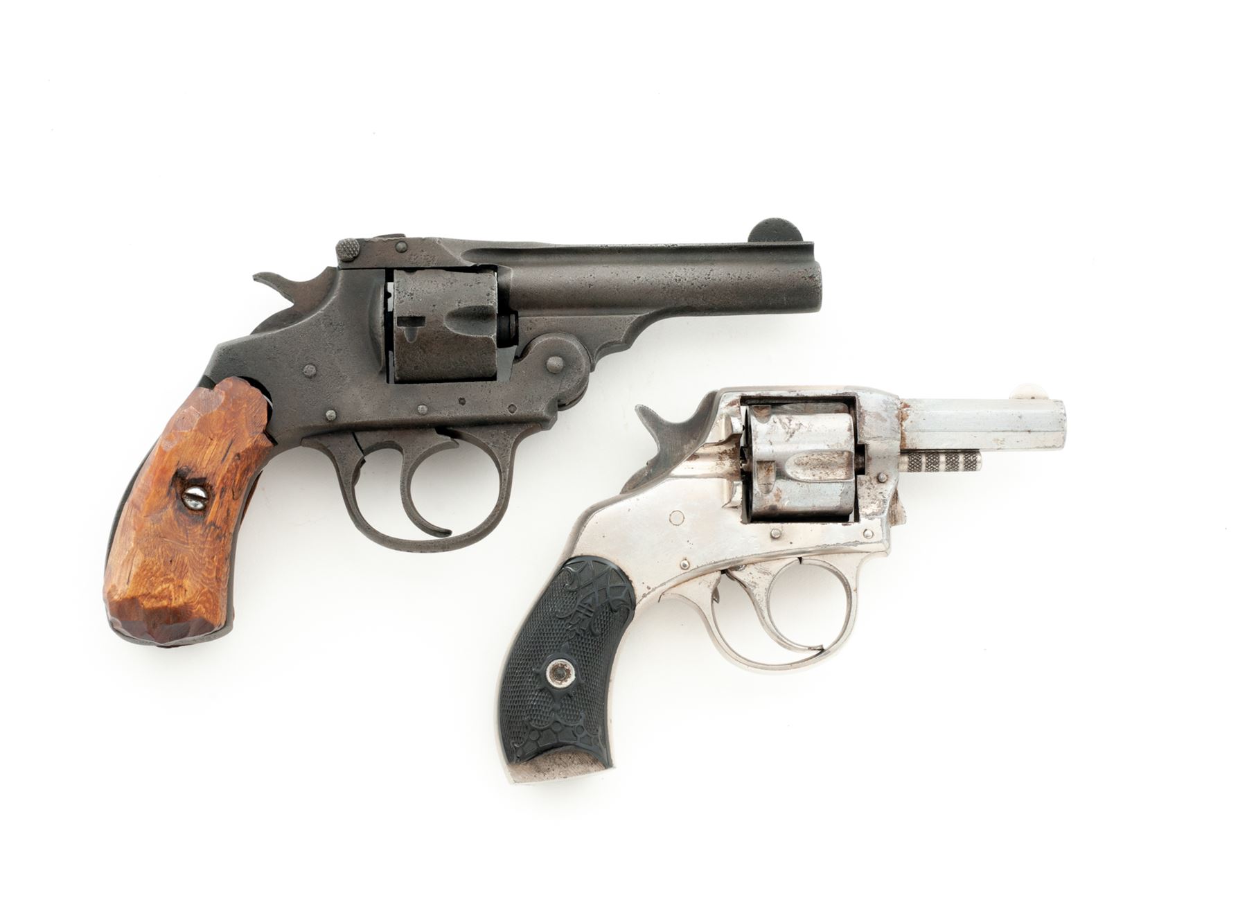Lot of Two (2) American Double Action Pocket Revolvers: (1) Iver Johnson Top-Break, #24860, .32 CF cal., 3'' round barrel marked on top rib with two-line Iver Johnson address, 5-shot fluted cylinder with auto-ejector (not working), frame with large S&W-type barrel hinge and integral triggerguard and grip straps with two-line patent dates on butt, and two-piece wood grips. Condition is poor retaining a later dark, matte parkerizing-like finish over pitting. Grips are crudely-whittled replacements. Action is non-functioning; bore shows etching and discernable rifling. (2) Harrington & Richardson Solid Frame, NVSN, .32 CF cal., 2'' octagonal barrel marked on left angled flat ''H&R Arms Company/Worcester, Mass. U.S.A.'' in two lines, 5-shot fluted cylinder, solid frame marked on topstrap ''Young America/Double Action'' in two lines, finely checkered two-piece hard rubber grips with ornate art-nouveau relief design. Originally fully nickel plated. Condition is fine retaining 90% nickel plating. Grips are very fine but for a large chip missing from butt of right panel. Action works in both single- and double action, bore appears clean with discernable rifling. Est.: $100-$200/Lot (C&R)