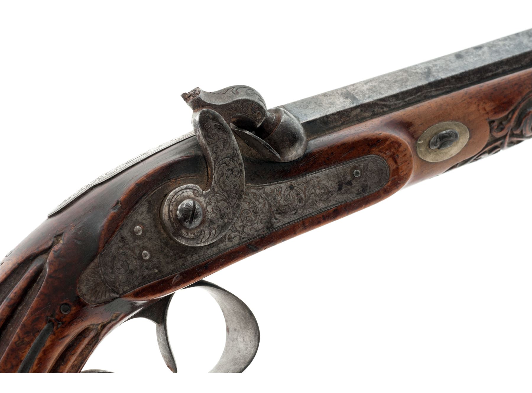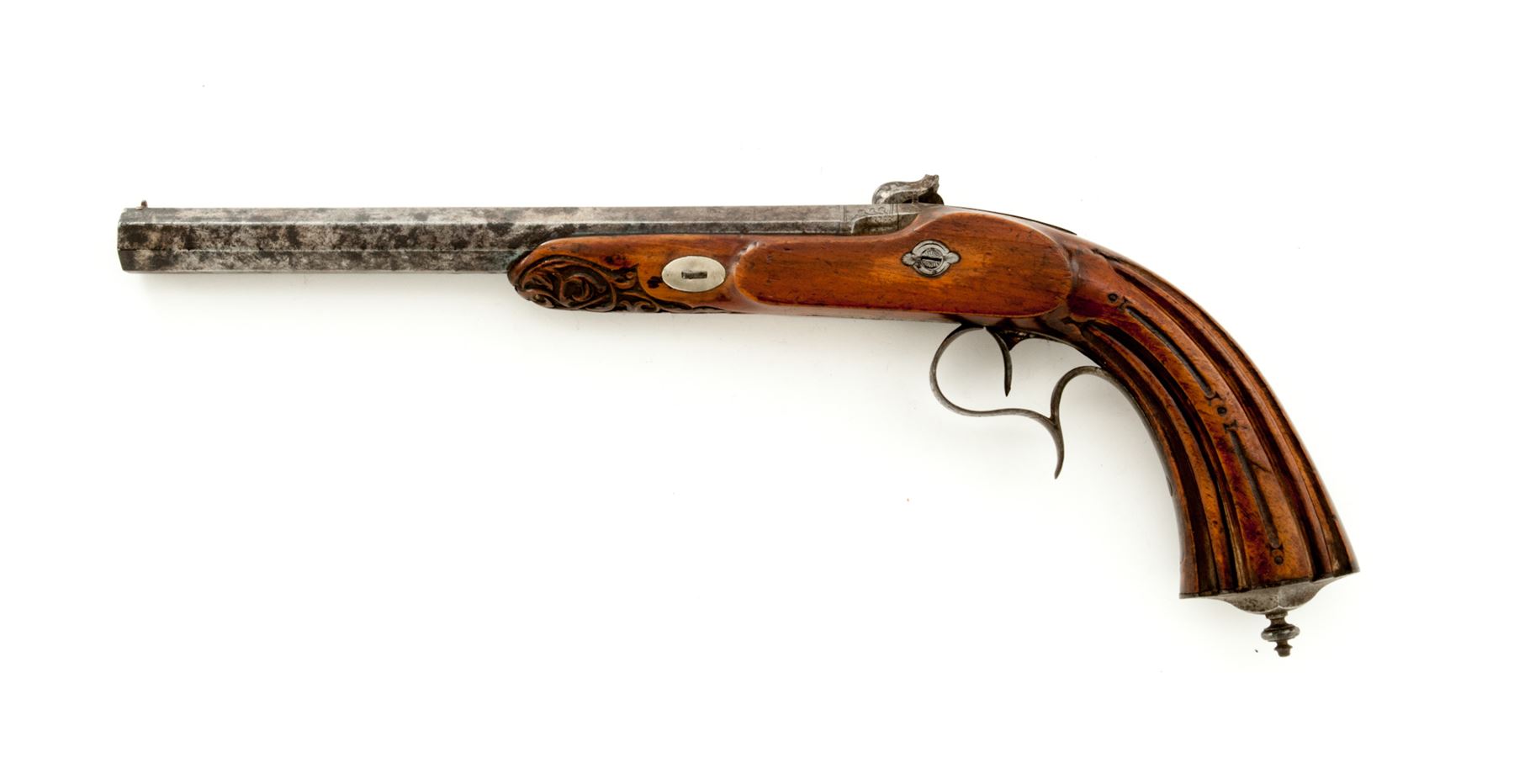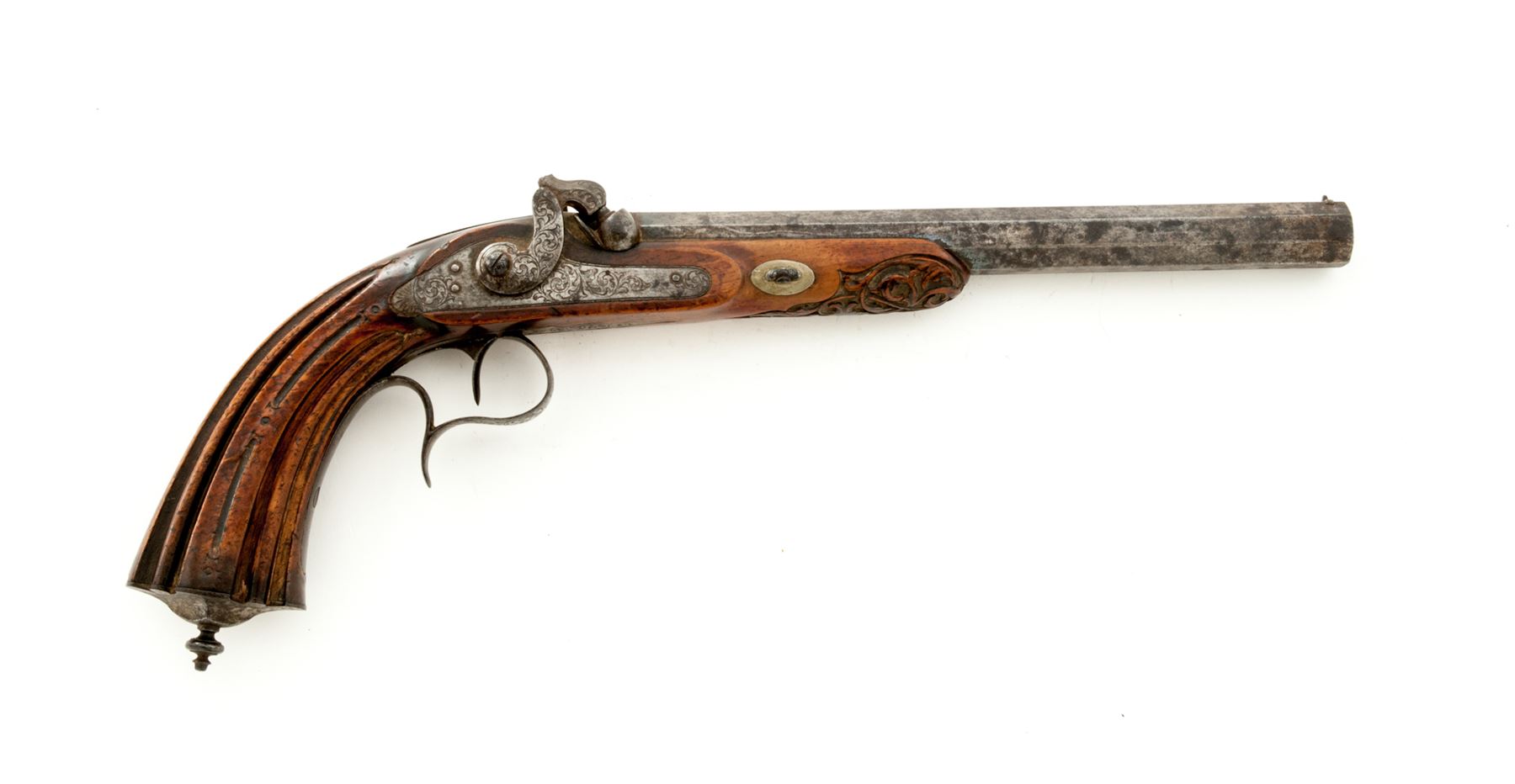 Antique European Large Bore Single Shot Dueling Style Percussion Pistol, NVSN, approx. .50 cal., 10'' octagonal barrel with dovetailed front post sight and integral notched rear, marked ''WWF'' on top flat and numbered ''2'' at breech and on tang behind rear sight; engraved but unmarked iron lockplate and hammer with thumb spur broken off; engraved loop triggerguard with fancy front tang and finger spur at rear; carved and fluted European hardwood stock with lovely entwined floral carving at forend; matching fluted and engraved iron buttplate with turned finial. Condition is good, showing no original finish (traces of original blue ahead of percussion bolster) and overall discoloration to the gunmetal coloring. Stock is very good showing wear to original varnish finish and nicks. Est.: $150-$250. (Antique)