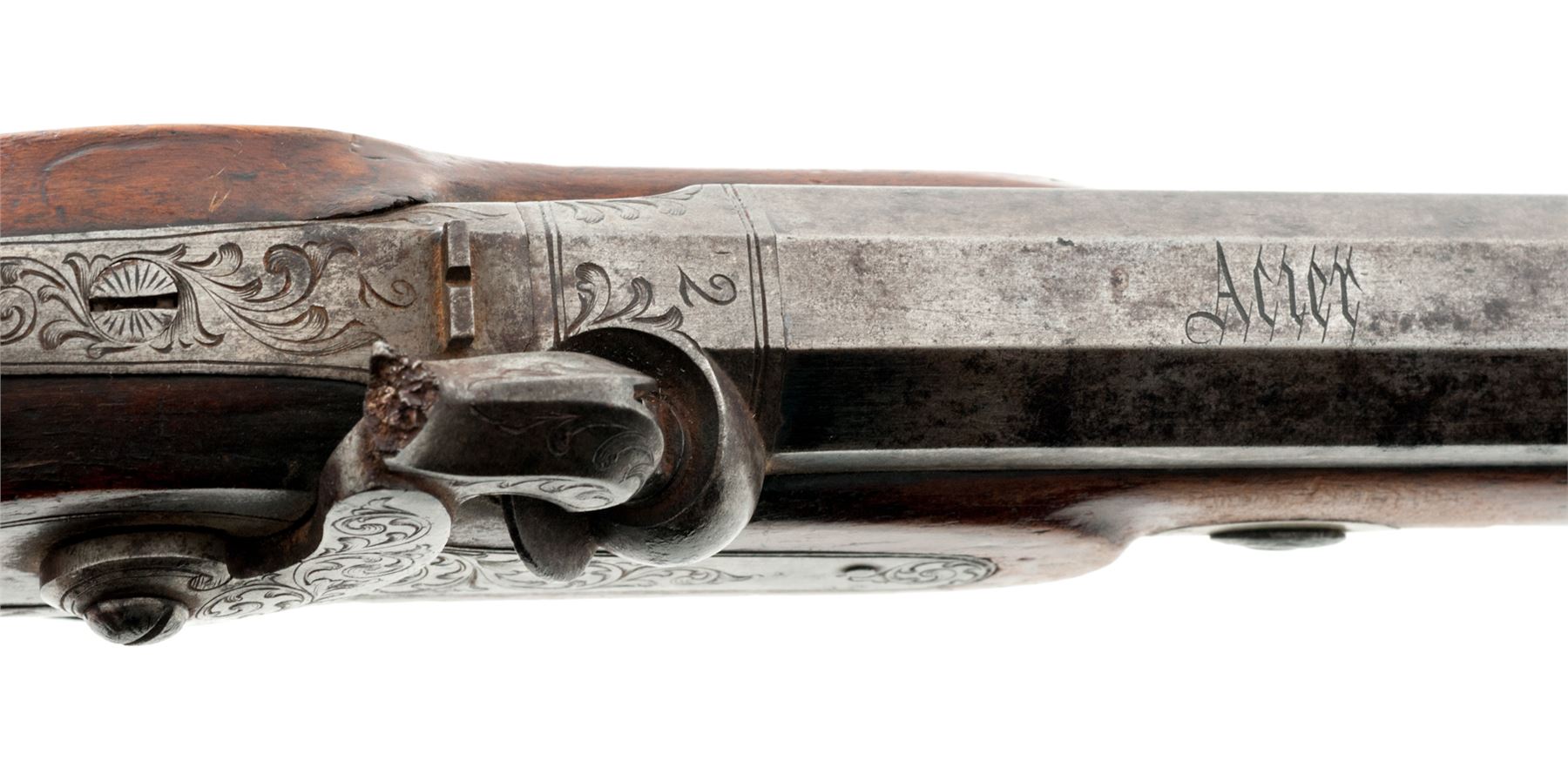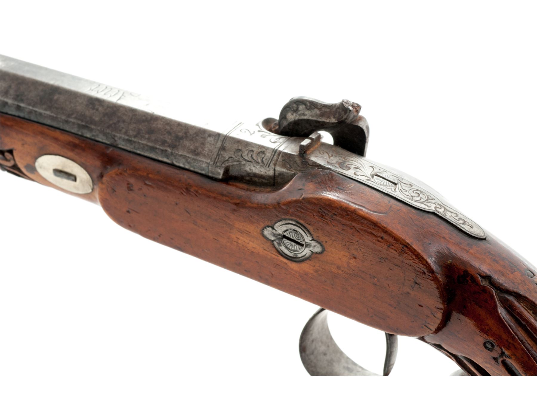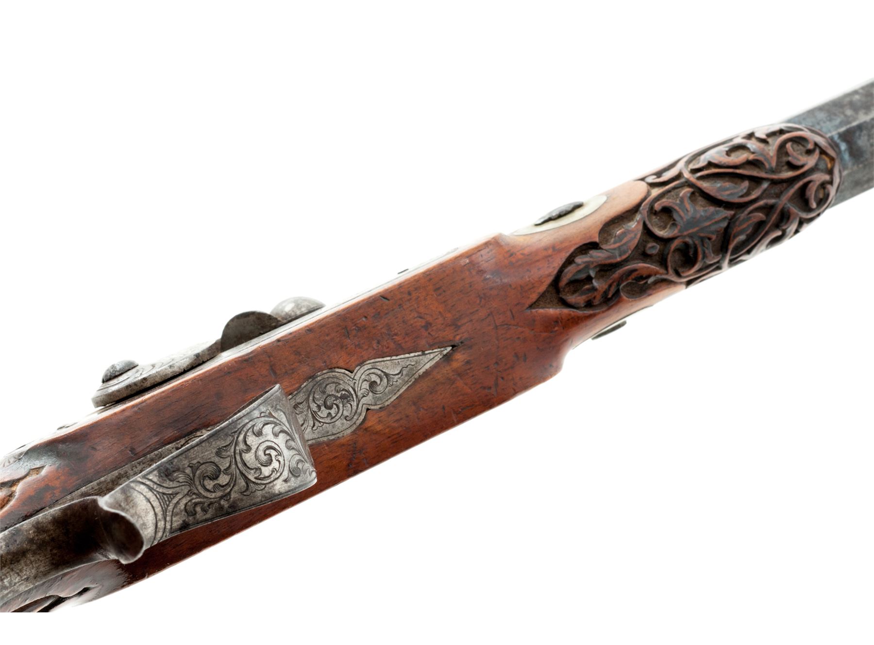 Antique European Large Bore Single Shot Dueling Style Percussion Pistol, NVSN, approx. .50 cal., 10'' octagonal barrel with dovetailed front post sight and integral notched rear, marked ''WWF'' on top flat and numbered ''2'' at breech and on tang behind rear sight; engraved but unmarked iron lockplate and hammer with thumb spur broken off; engraved loop triggerguard with fancy front tang and finger spur at rear; carved and fluted European hardwood stock with lovely entwined floral carving at forend; matching fluted and engraved iron buttplate with turned finial. Condition is good, showing no original finish (traces of original blue ahead of percussion bolster) and overall discoloration to the gunmetal coloring. Stock is very good showing wear to original varnish finish and nicks. Est.: $150-$250. (Antique)