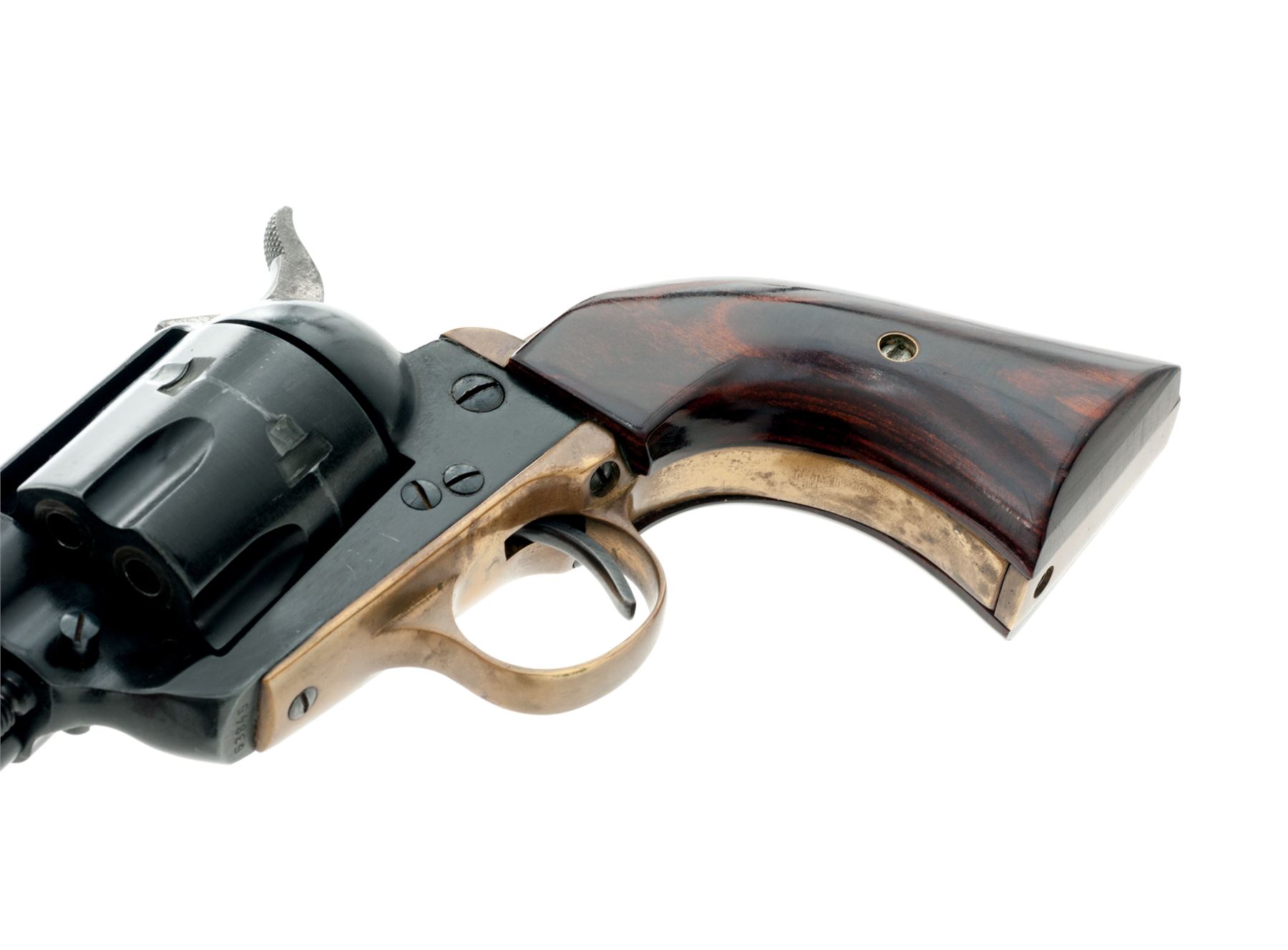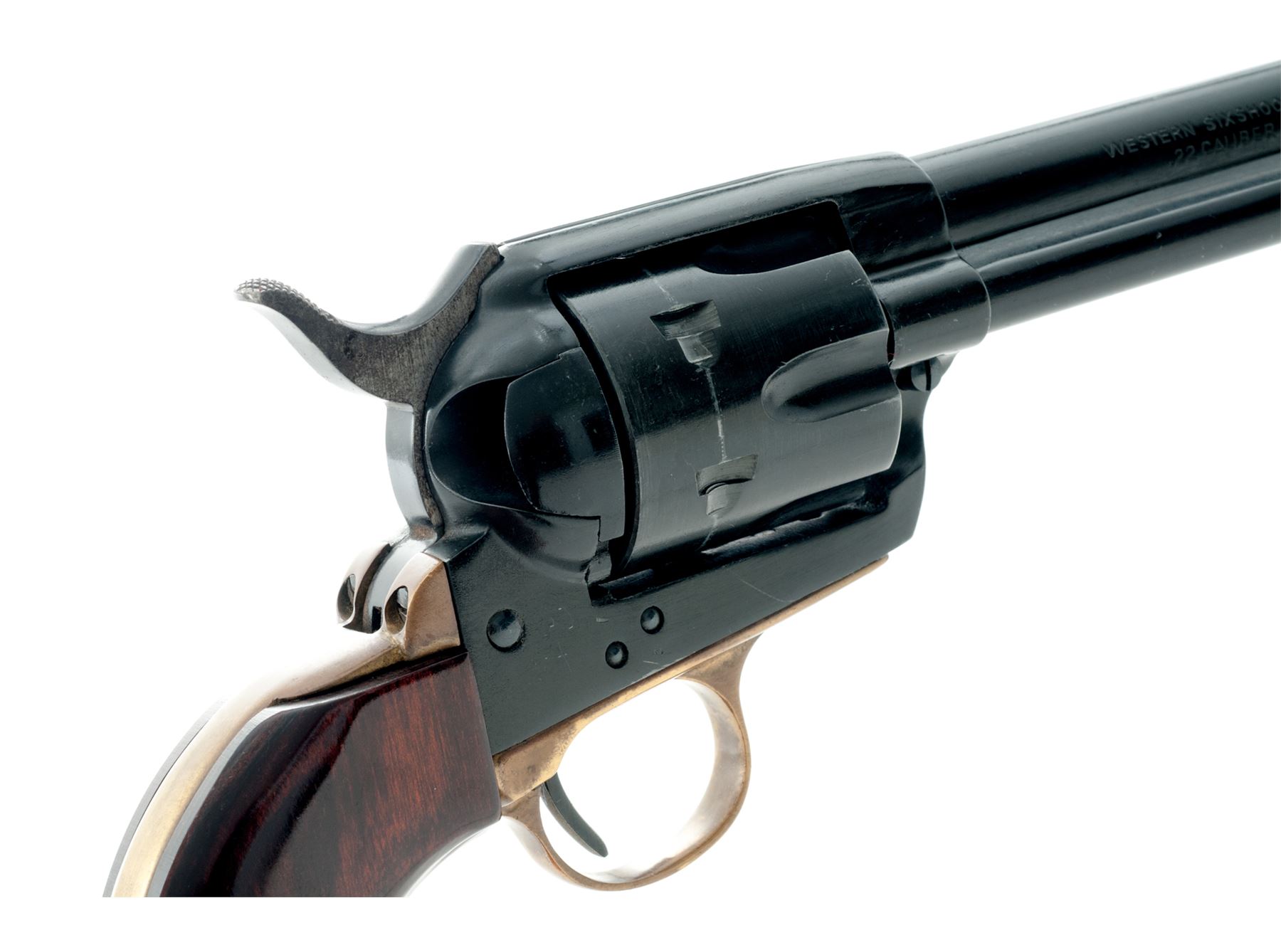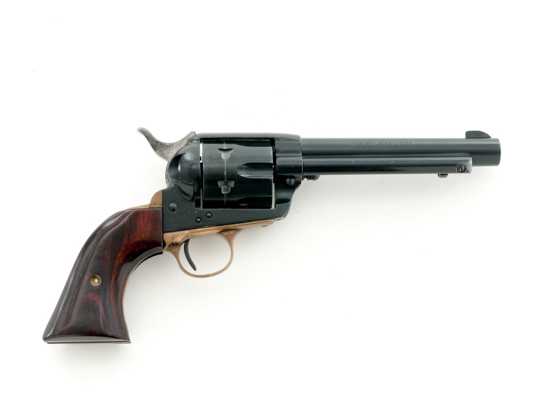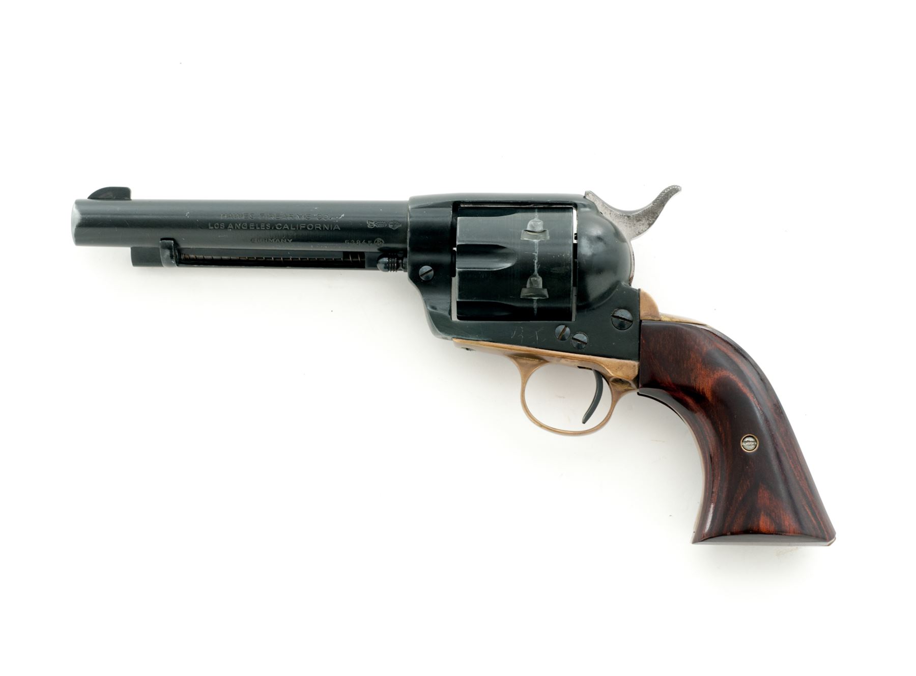 Hawes Firearms Western Six Shooter Single Action Revolver, #63845, .22 LR cal., 5.5'' barrel, black finish, brass triggerguard, two-piece smooth laminate wood grips, with standard sights. Made in West Germany by J.P. Sauer & Sohn. Condition overall is very good with approx. 92% finish remaining; highpoint wear at the muzzle, cylinder, and ejector rod housing account for a majority of the finish loss. Grips with normal light marks from handling and retain most of their semi-gloss finish. Brass with moderate toning. Barrel address, etc. is clear and defined. Hammer with areas of cloudy dark spotting. Smooth crisp action; mirror bright bore rates excellent. Est.: $125-$225. (Modern/PPT)