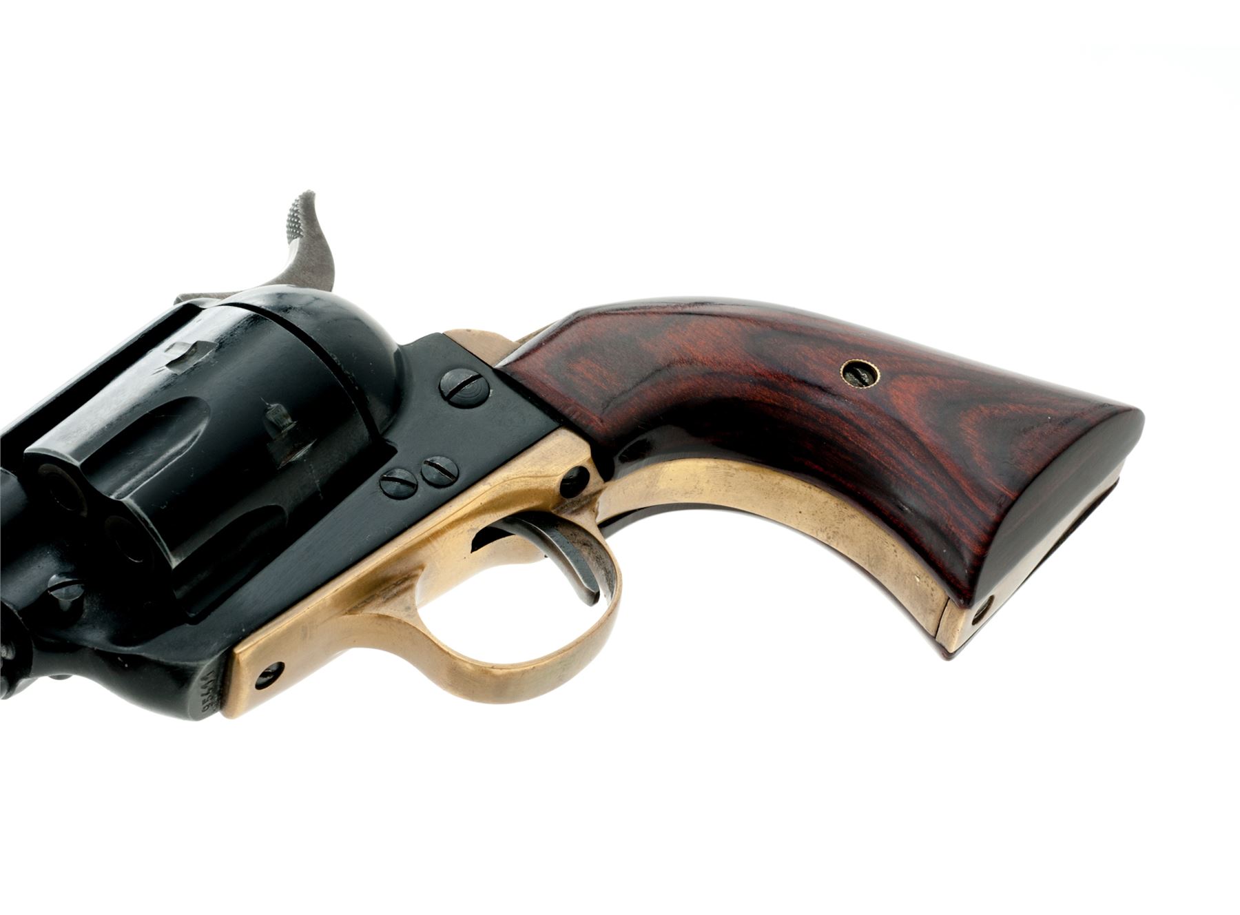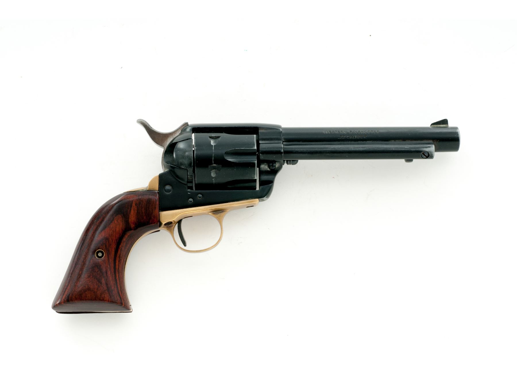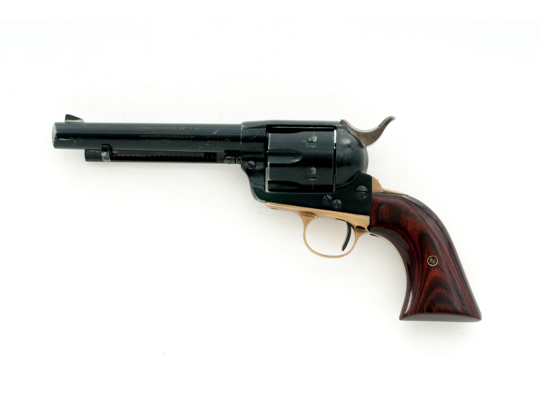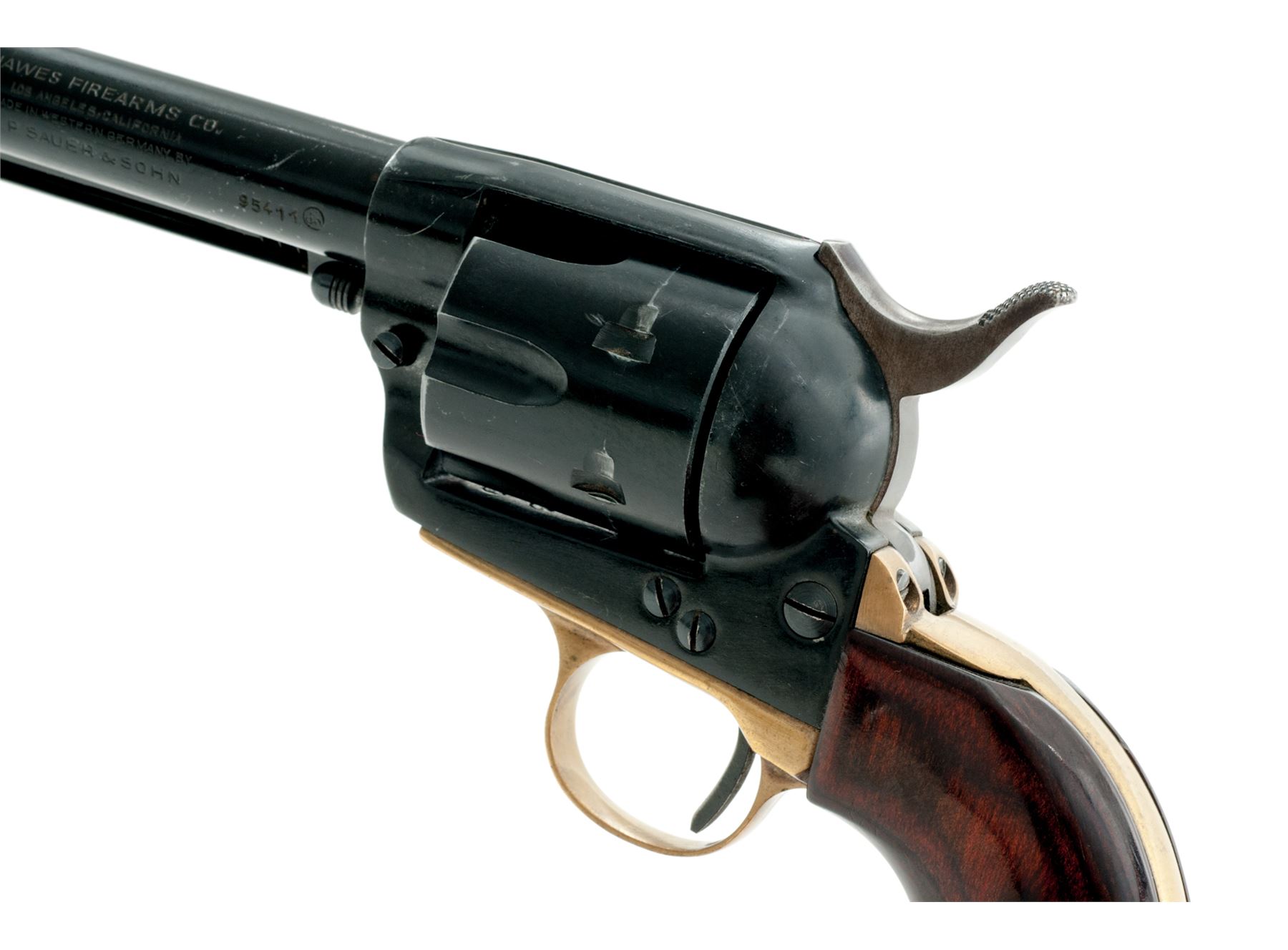 Hawes Firearms Western Six Shooter Single Action Revolver, #95411, .22 LR cal., 5.5'' barrel, black finish, brass triggerguard, two-piece smooth laminate wood grips, with standard sights. Made in West Germany by J.P. Sauer & Sohn. Condition overall is very good with approx. 93% finish remaining; highpoint wear at the muzzle, cylinder, and ejector rod housing account for a majority of the finish loss. Grips with normal light marks from handling and retain nearly all of their semi-gloss finish. Brass with moderate toning. Barrel address, etc. is clear and defined. Smooth crisp action; mirror bright bore rates excellent. Est.: $125-$225. (Modern/PPT)