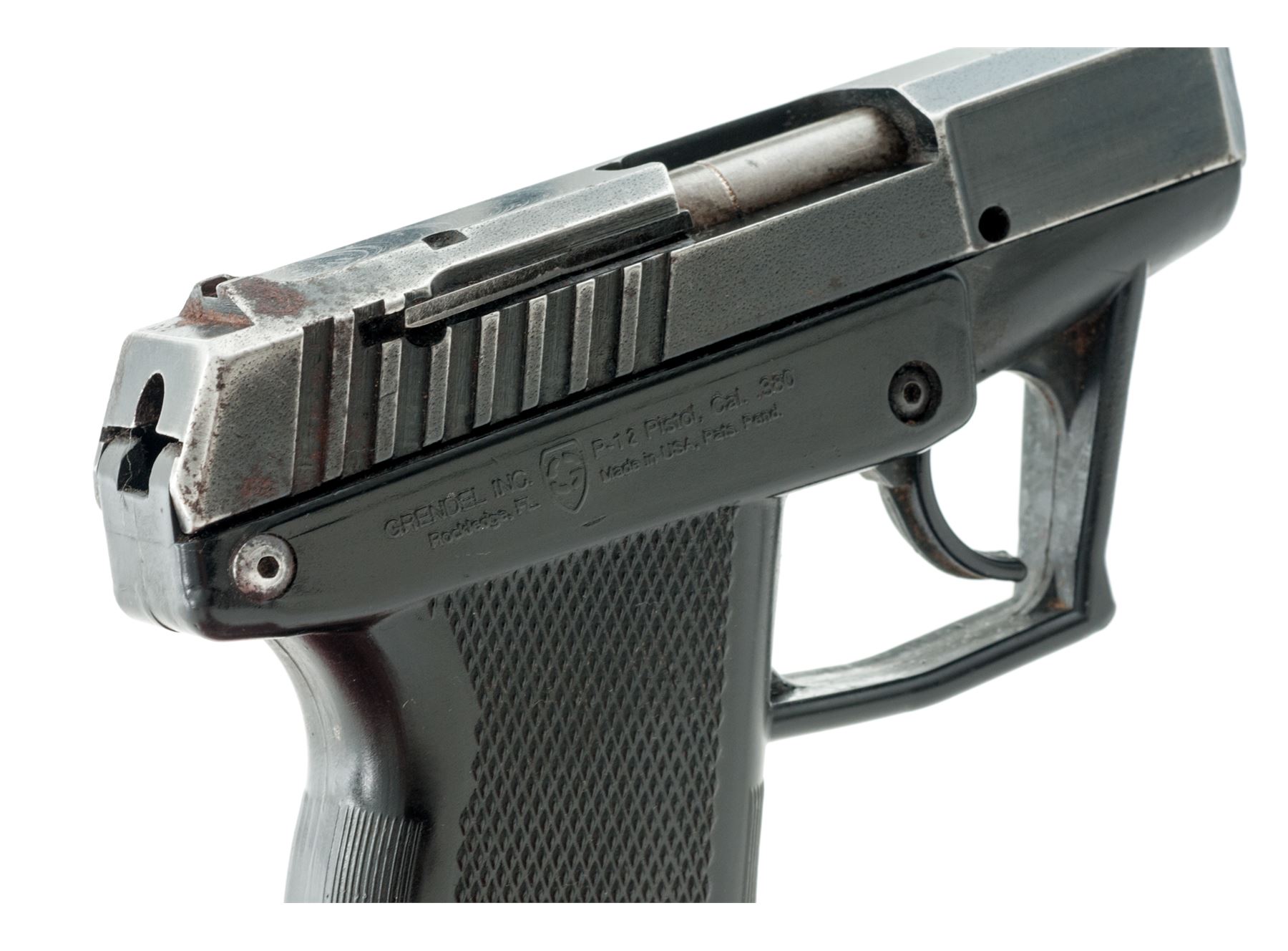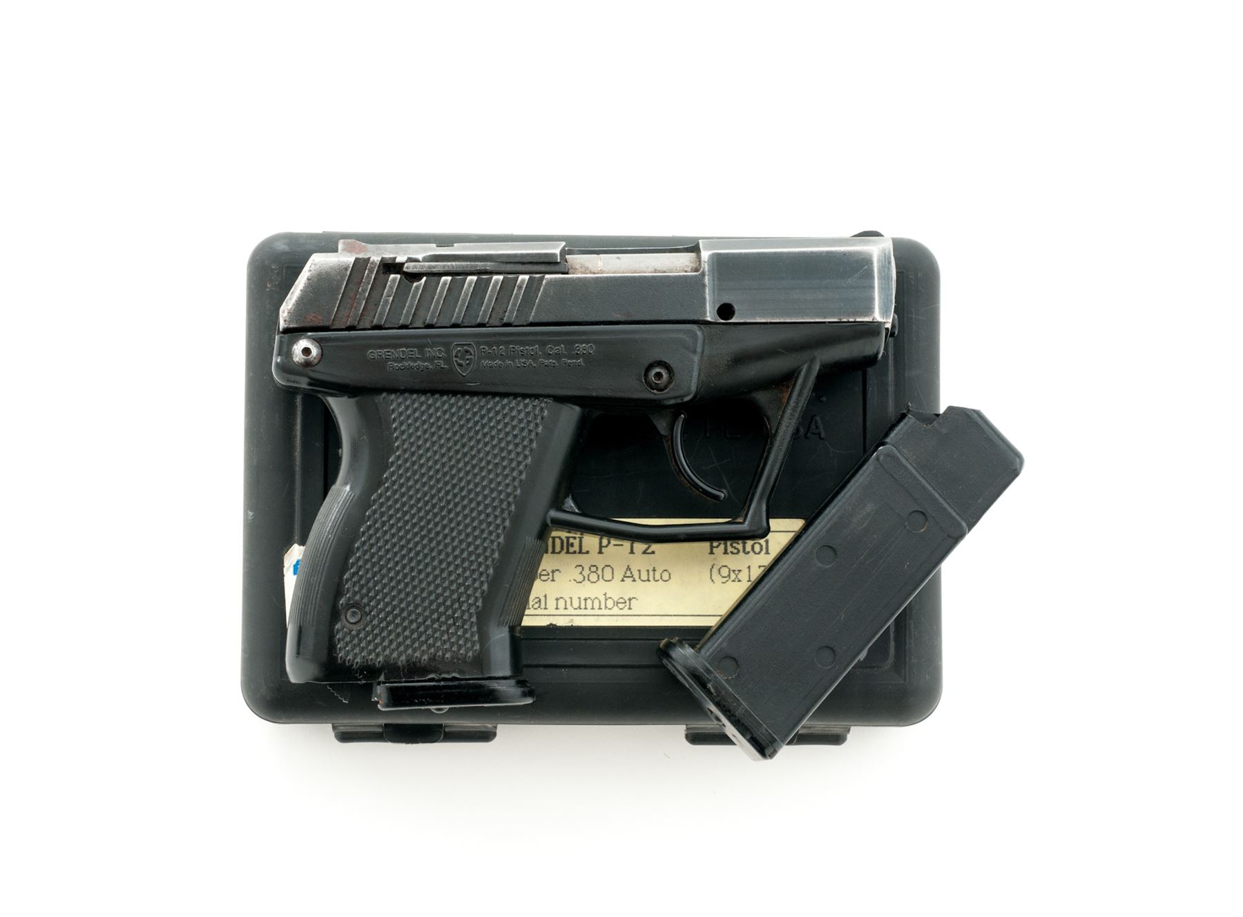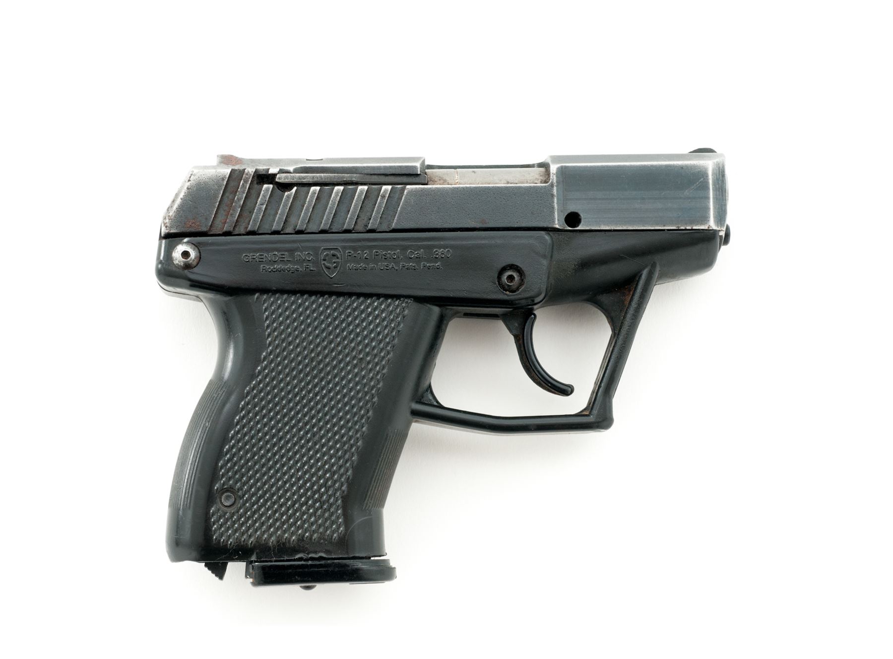 Grendel Model P-12 Semi-Automatic Pistol, #12130, double action only, 3'' barrel, dark blue/black slide, black polymer frame, with integral fixed sights, and two (2) 11-round Grendel magazines. In original black plastic case with matching end label and owner's manual. Condition is good with approx. 75%-80% thinning blue finish; slide with surface rust at the slide serrations and rear sight. Frame with some built-up dirt in the grip checkering and would improve with a thorough cleaning. Very good action and bore. Est.: $100-$150. (Modern/PPT)(High-cap mags not available to Calif. residents.)