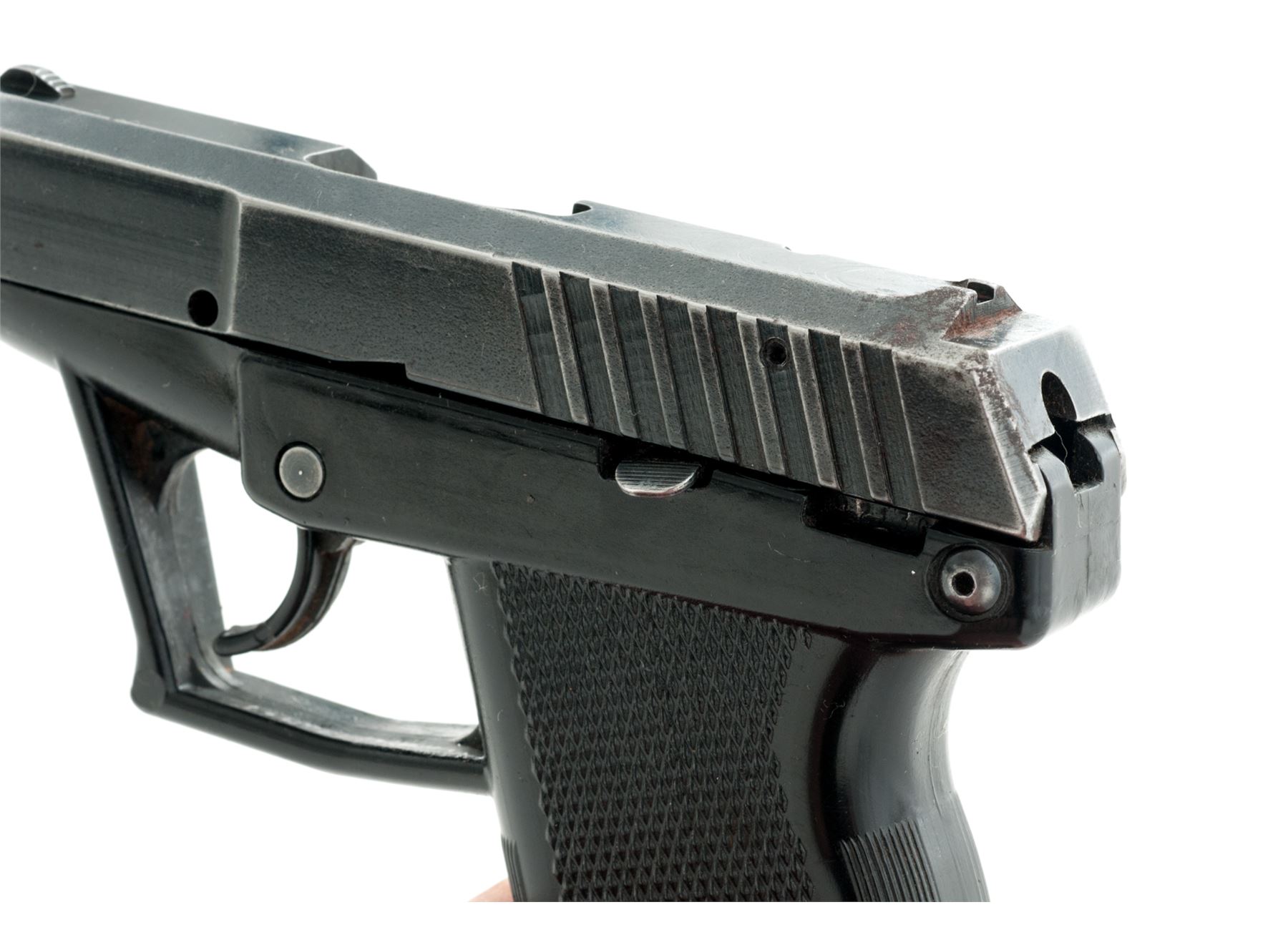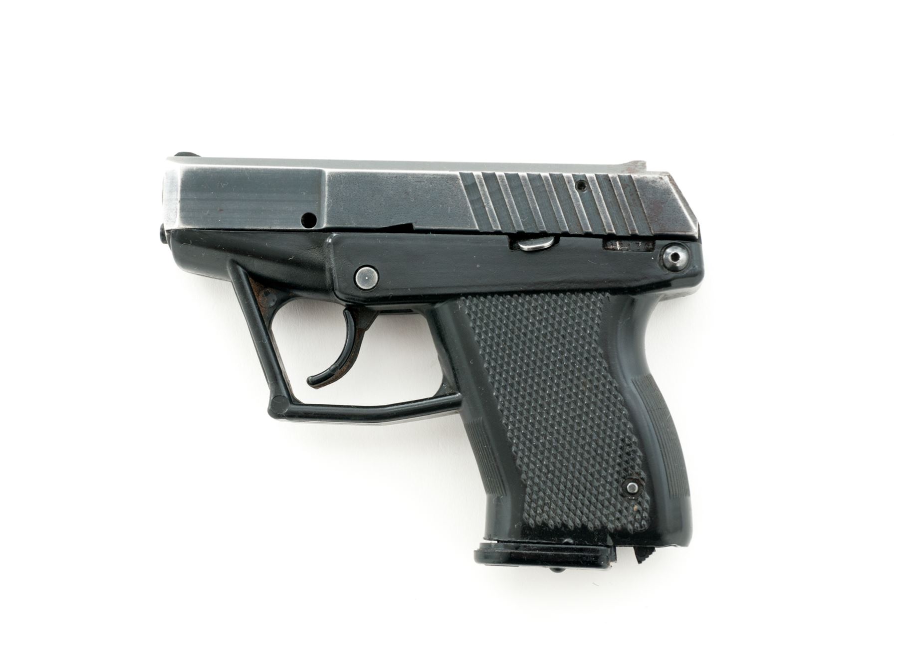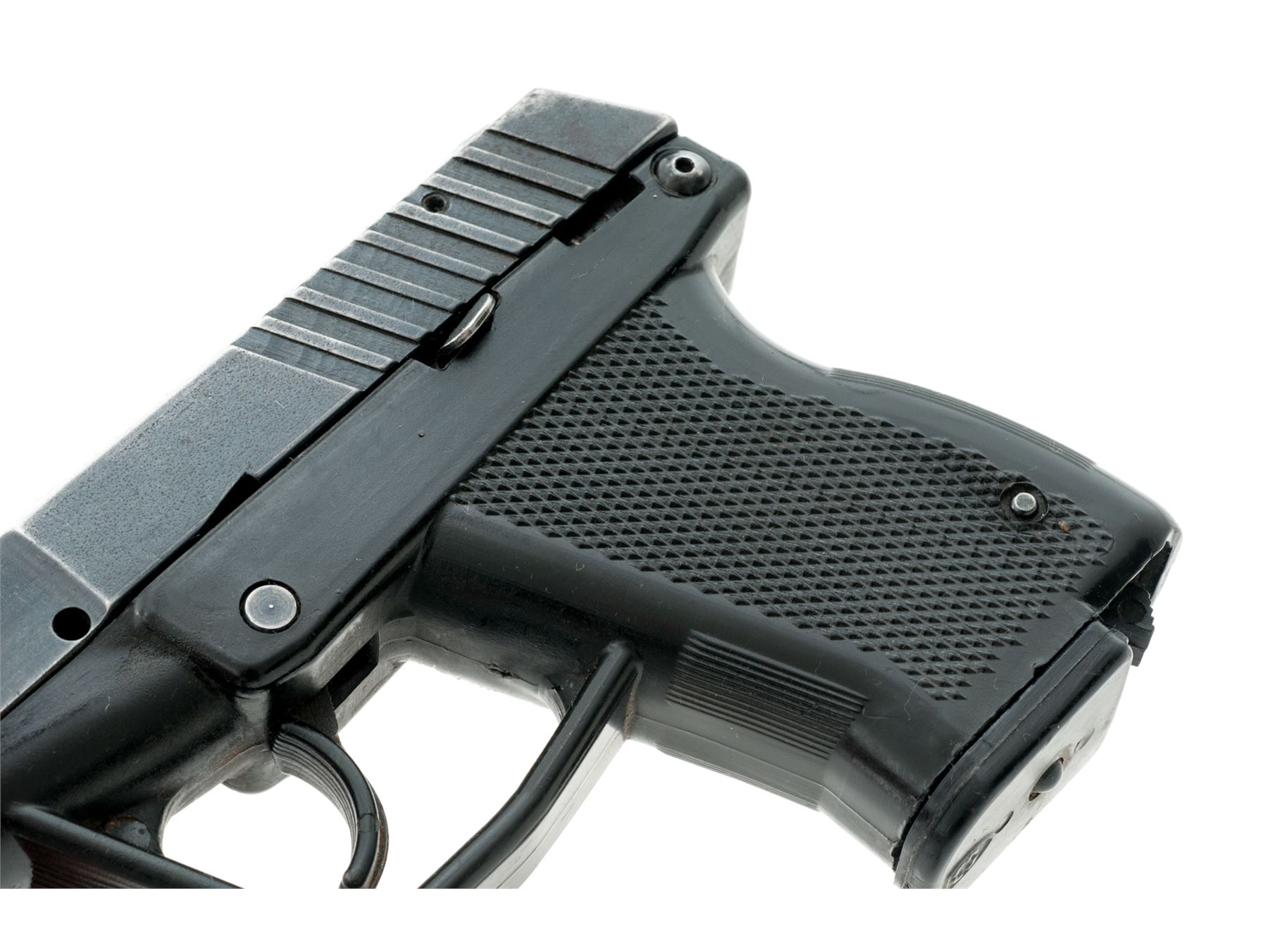 Grendel Model P-12 Semi-Automatic Pistol, #12130, double action only, 3'' barrel, dark blue/black slide, black polymer frame, with integral fixed sights, and two (2) 11-round Grendel magazines. In original black plastic case with matching end label and owner's manual. Condition is good with approx. 75%-80% thinning blue finish; slide with surface rust at the slide serrations and rear sight. Frame with some built-up dirt in the grip checkering and would improve with a thorough cleaning. Very good action and bore. Est.: $100-$150. (Modern/PPT)(High-cap mags not available to Calif. residents.)