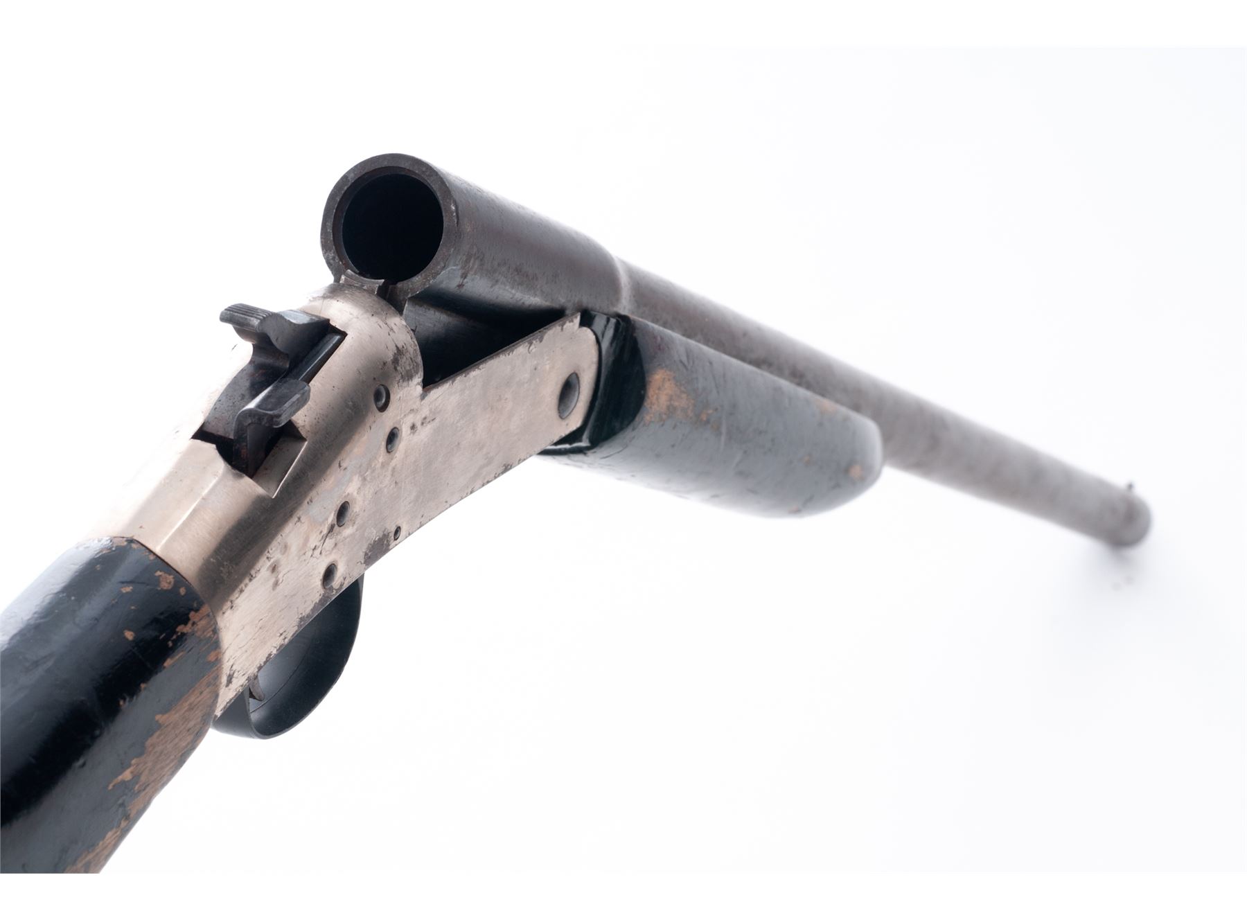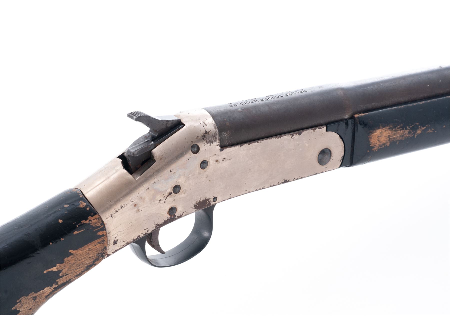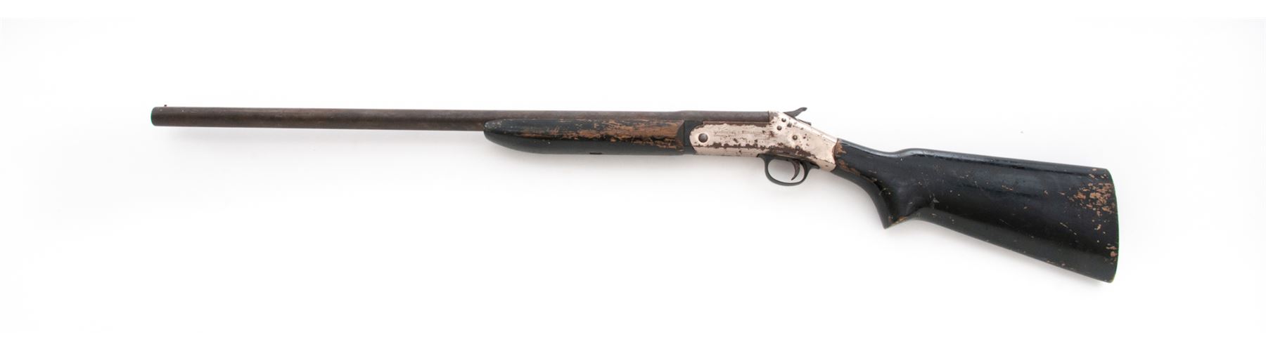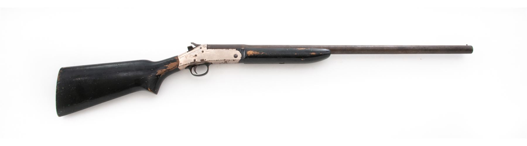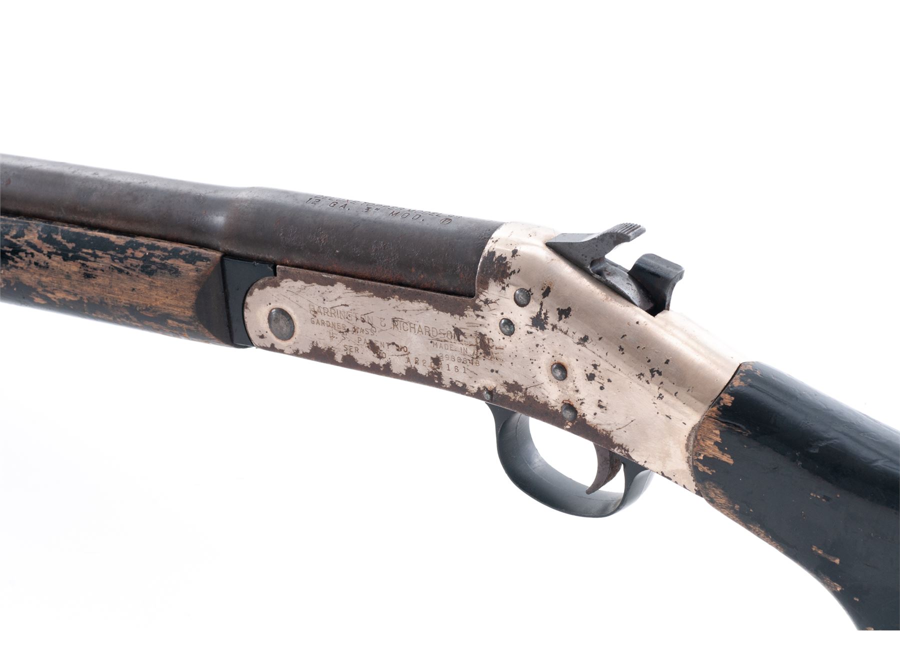 Harrington & Richardson ''Deluxe Topper'' Model 98 Single Barrel Tip-Up Shotgun, #AR204161, 12 ga., 26'' round barrel with bead front sight choked M and marked ''Deluxe Topper Model 98/12 Ga. 3'' Mod. (circled P)'' on top at breech; nickel-plated receiver, black loop triggerguard; black painted hardwood forestock and pistol-grip buttstock. Condition is good to very good, the barrel brown with scattered erosion, the receiver with 65% nickel plate and overall flaking and spotting. Stocks are solid and retain 75% black paint with chipping and losses. Missing buttplate. Action is smooth; bore is bright with spotting toward breech. Est.: $100-$200. (Modern)