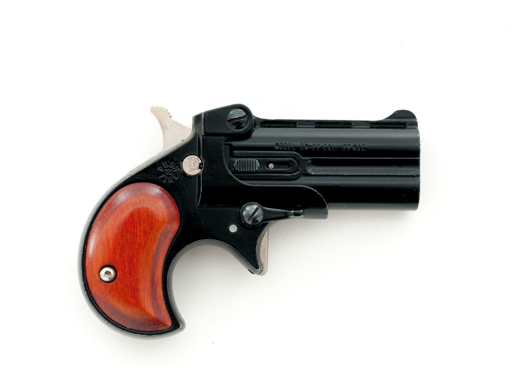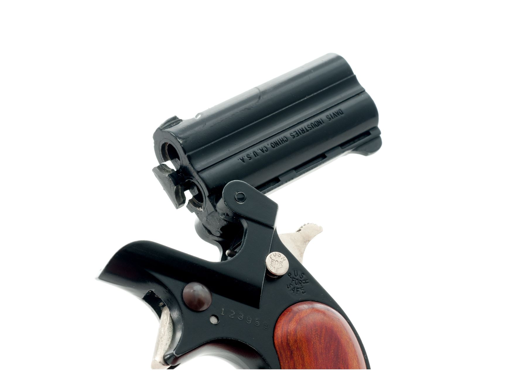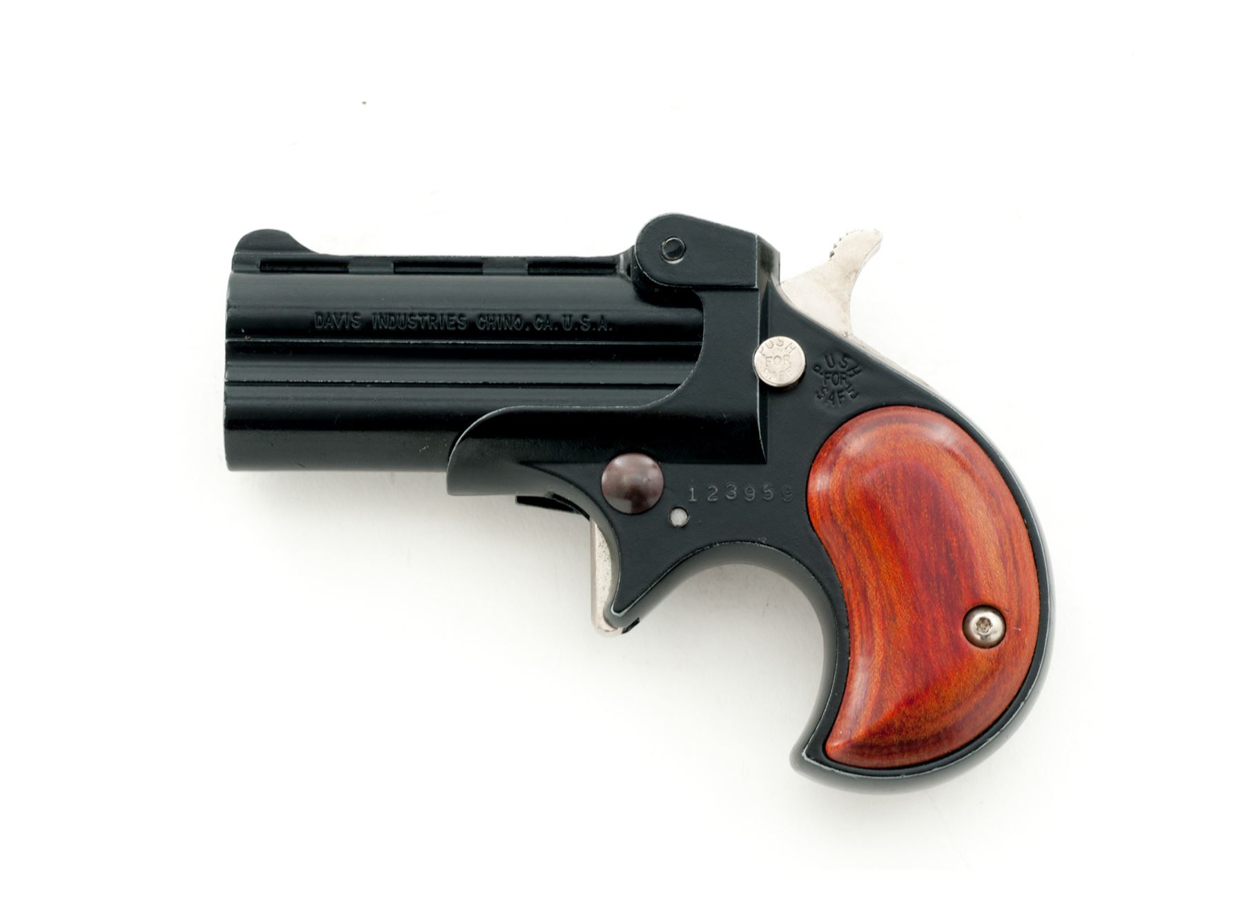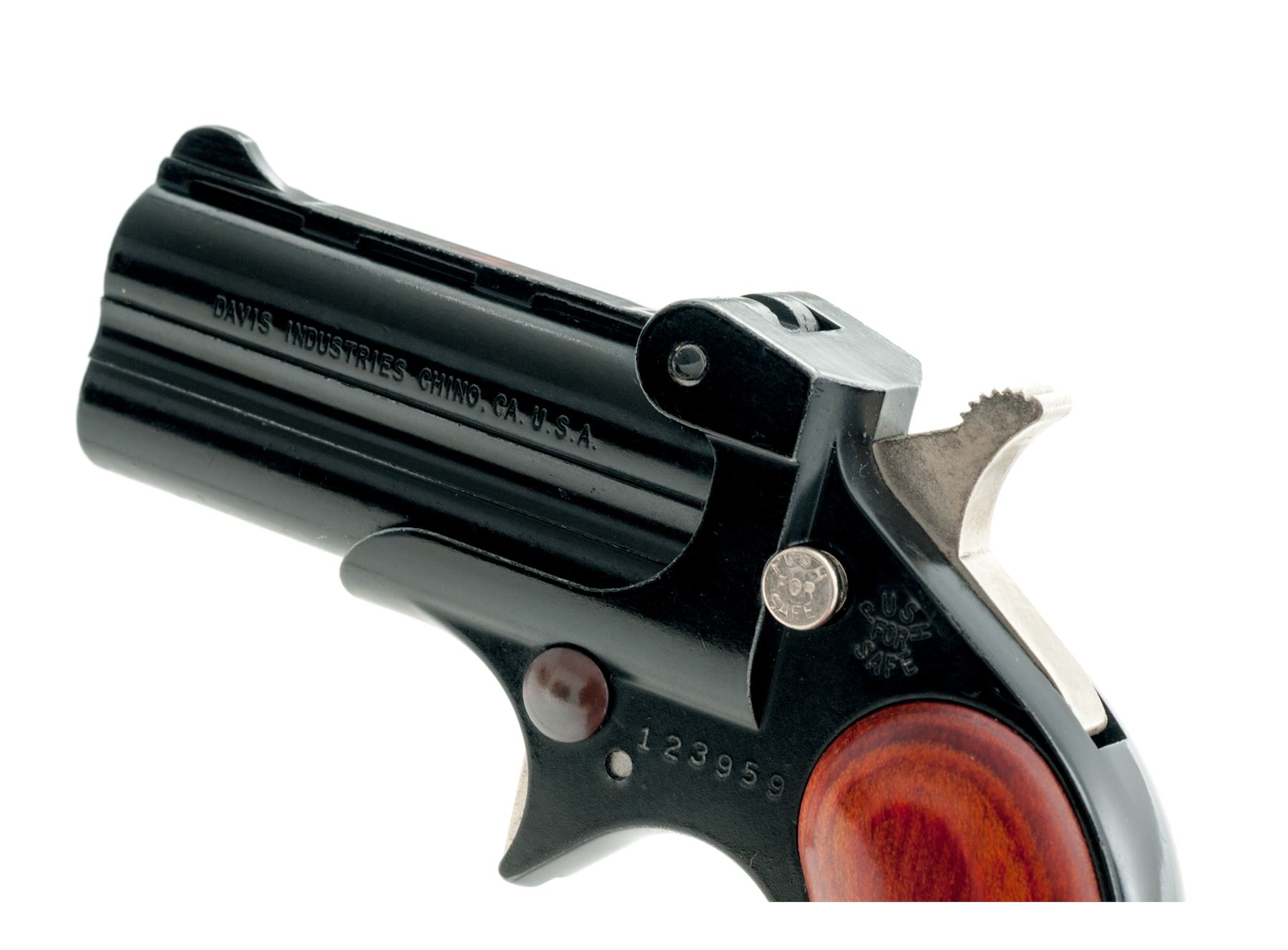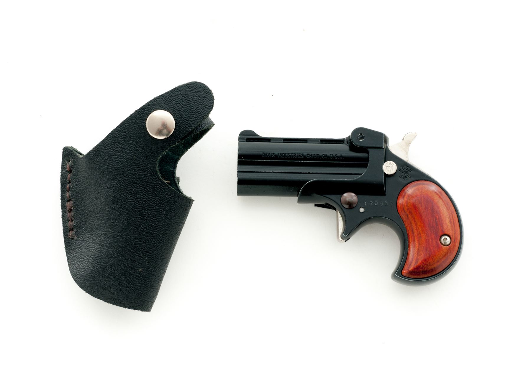 Davis Industries Model DM-22 Derringer, #123959, .22 mag. cal., 2-3/8'' barrel, black finish, smooth wood grips, with standard sights. Included is a black faux leather holster. Condition is excellent with approx. 97% remaining black finish. High edgewear accounts for a majority of the finish wear. Grips are near new with one small handling mark to the right grip. Hammer and trigger operate smoothly; excellent bores. Est.: $100-$200. (Modern/PPT)