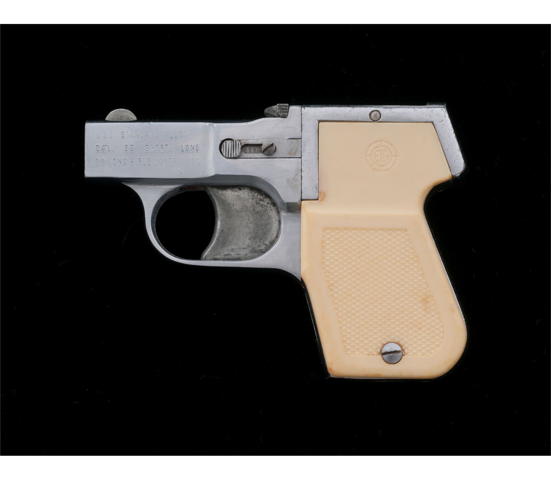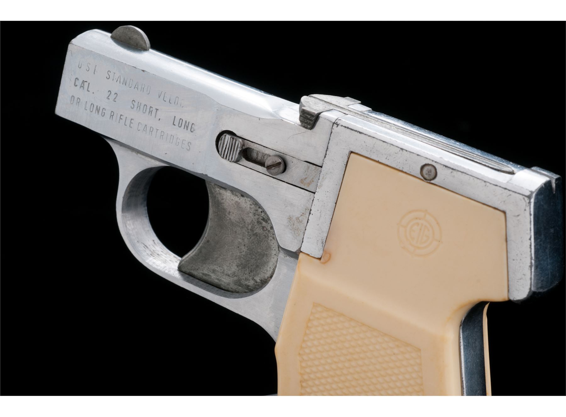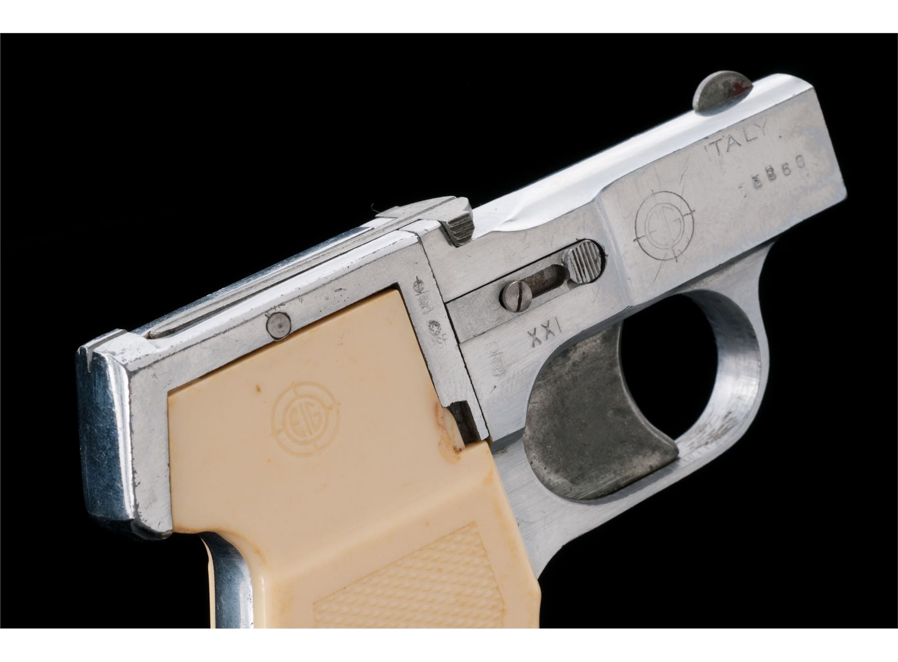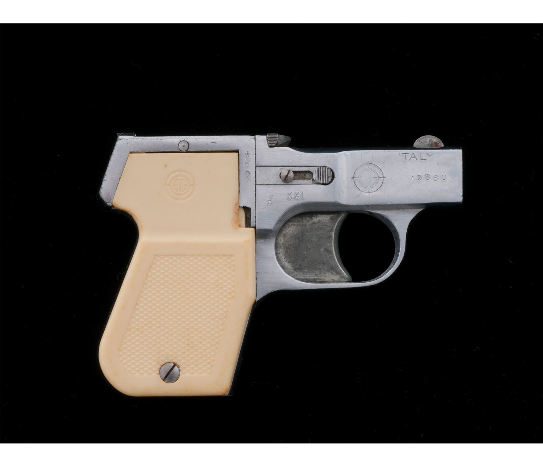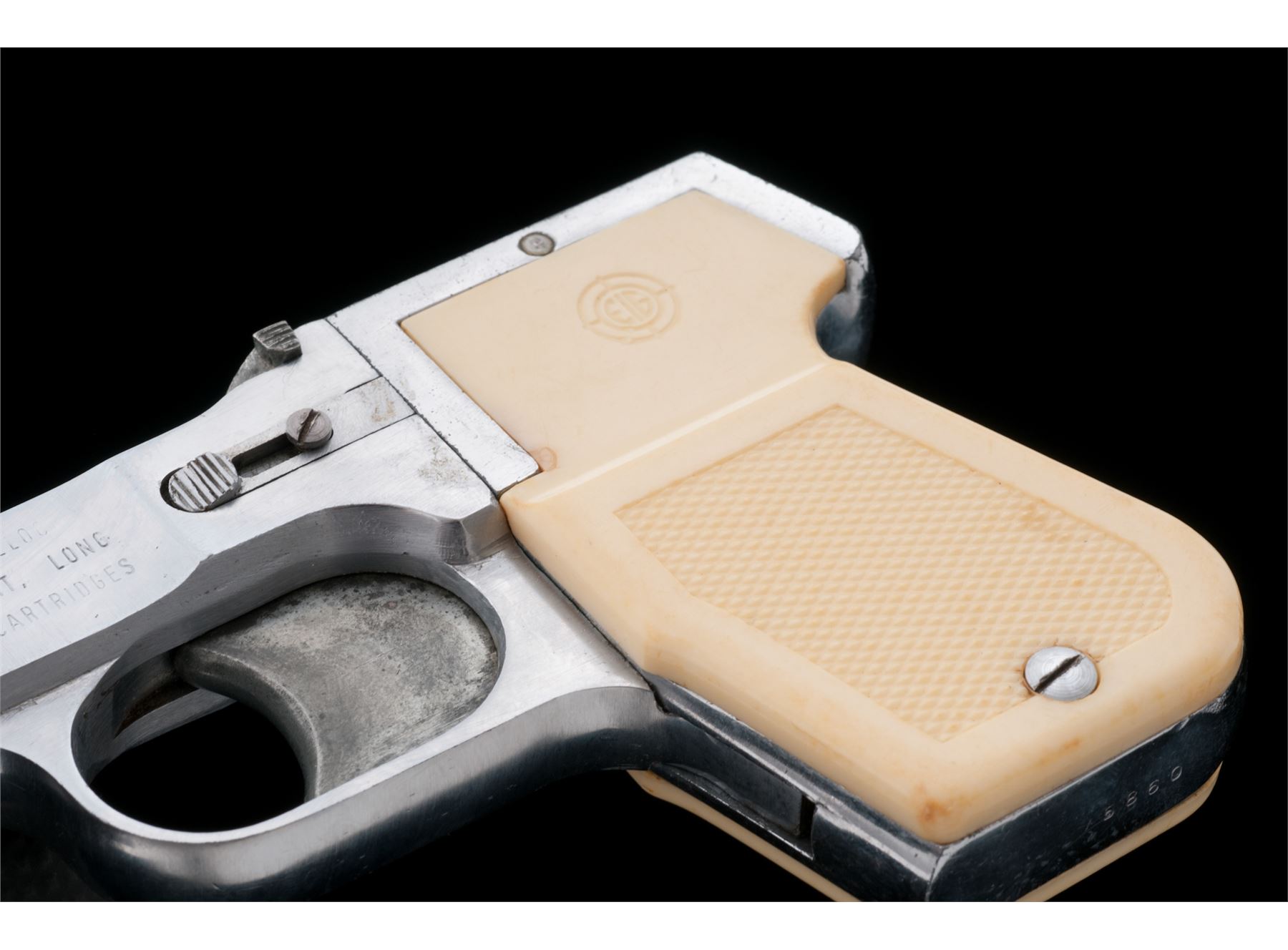 Italian EIG Four-Barrel Derringer, #75860, .22 S-L-LR cal., 2.5'' barrels, nickel finish, ivory-colored checkered plastic EIG grips, extractor, with standard sights. Mfg'd 1965. Condition is good. Most of the nickel finish remains with general light scratches and small handling marks. Right side of frame with a small corner missing where it meets the grip. Grips show moderate handling marks and a little discoloration, no chips or cracks. Good action and bores. Est.: $100-$200. (C&R/PPT)
