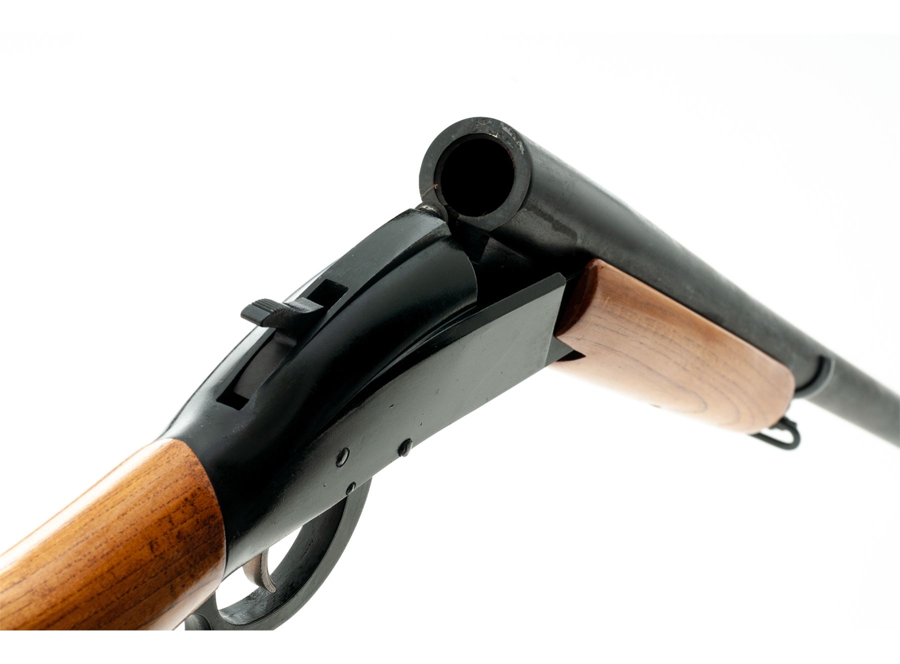 Ithaca Model 66 Super Single Lever Action Shotgun, #128078, single shot, 12 ga., 28'' barrel, Full choke, blue finish, straight grip walnut stock, black plastic Ithaca buttplate, brass bead front sight, barrel with a removable quick-release sling swivel. Condition overall is near excellent with approx. 97%-98% original blue finish, receiver with scattered small nicks and light edgewear. Wood has been refinished and shows only a handful of shallow impressions and surface scratches. Very good action and bright bore. Est.: $100-$150. (Modern)