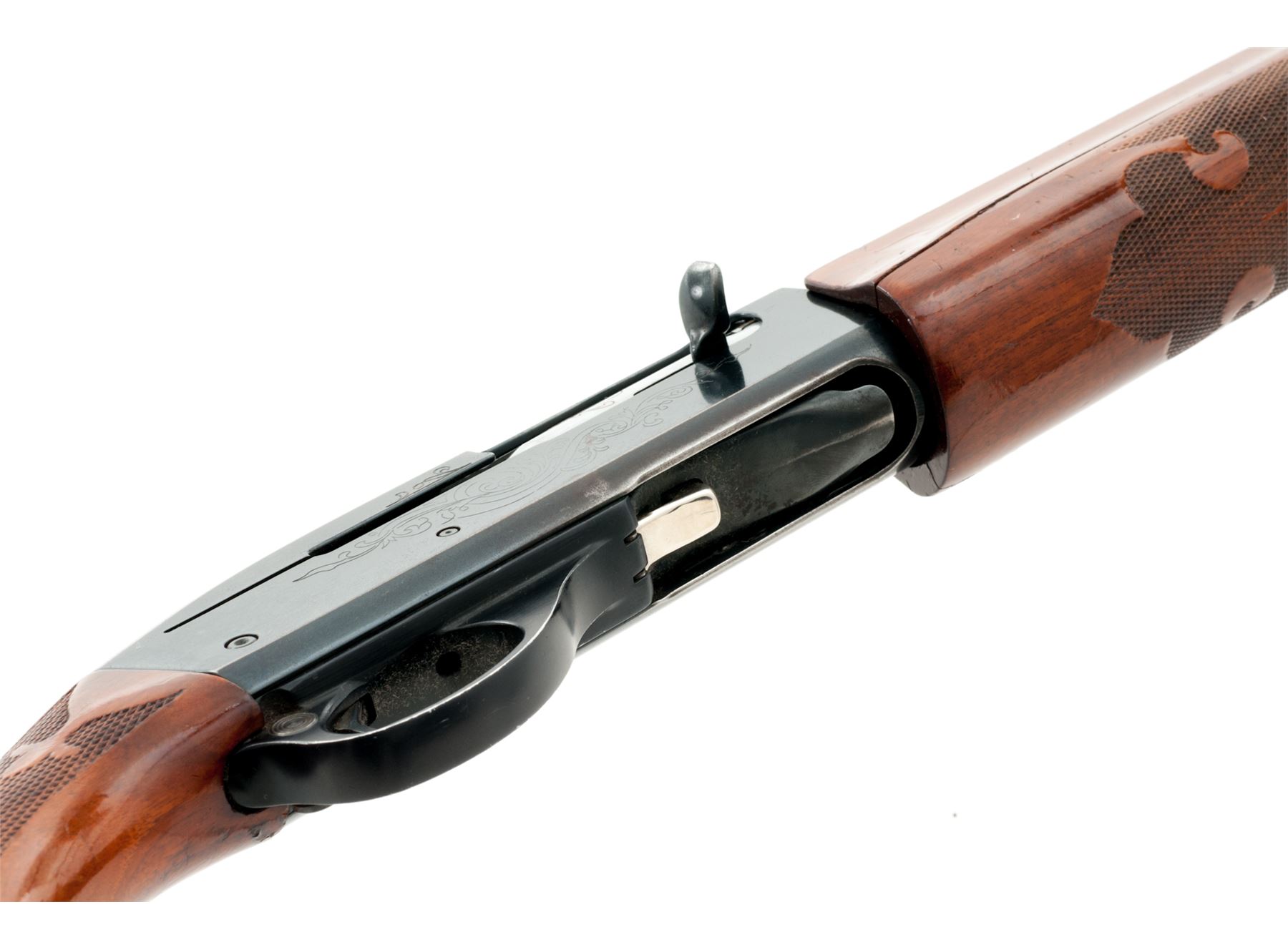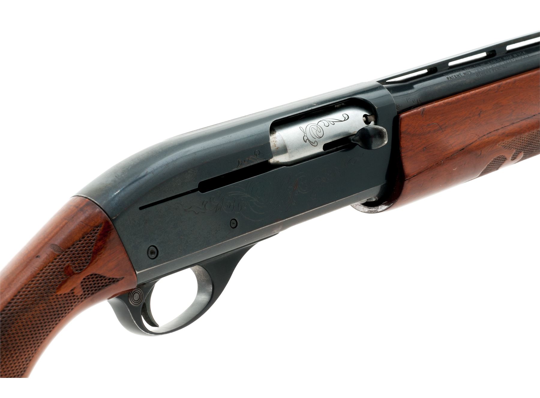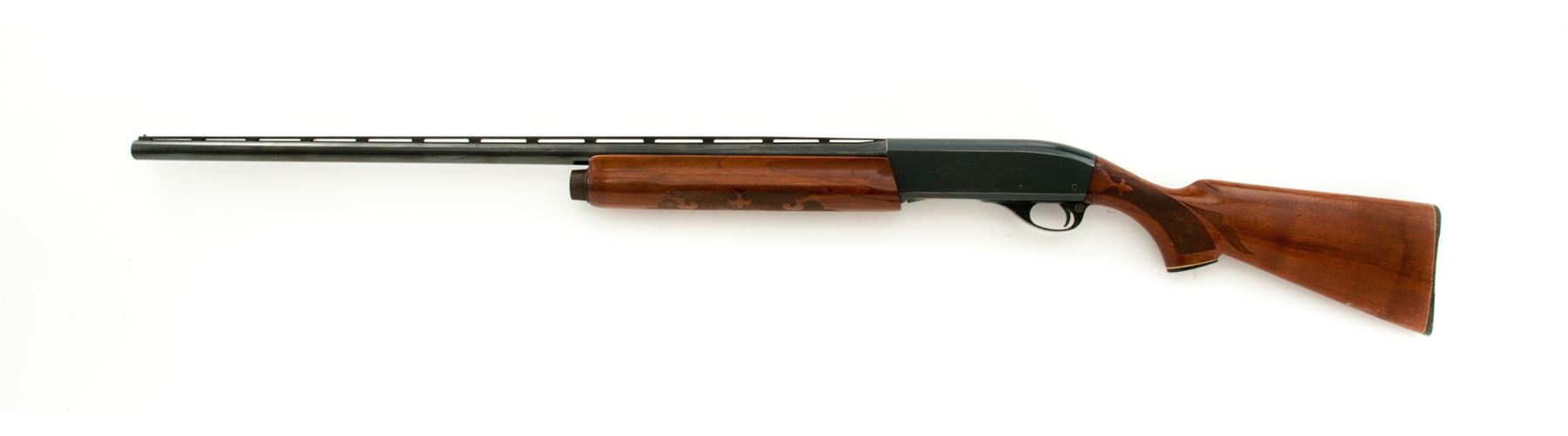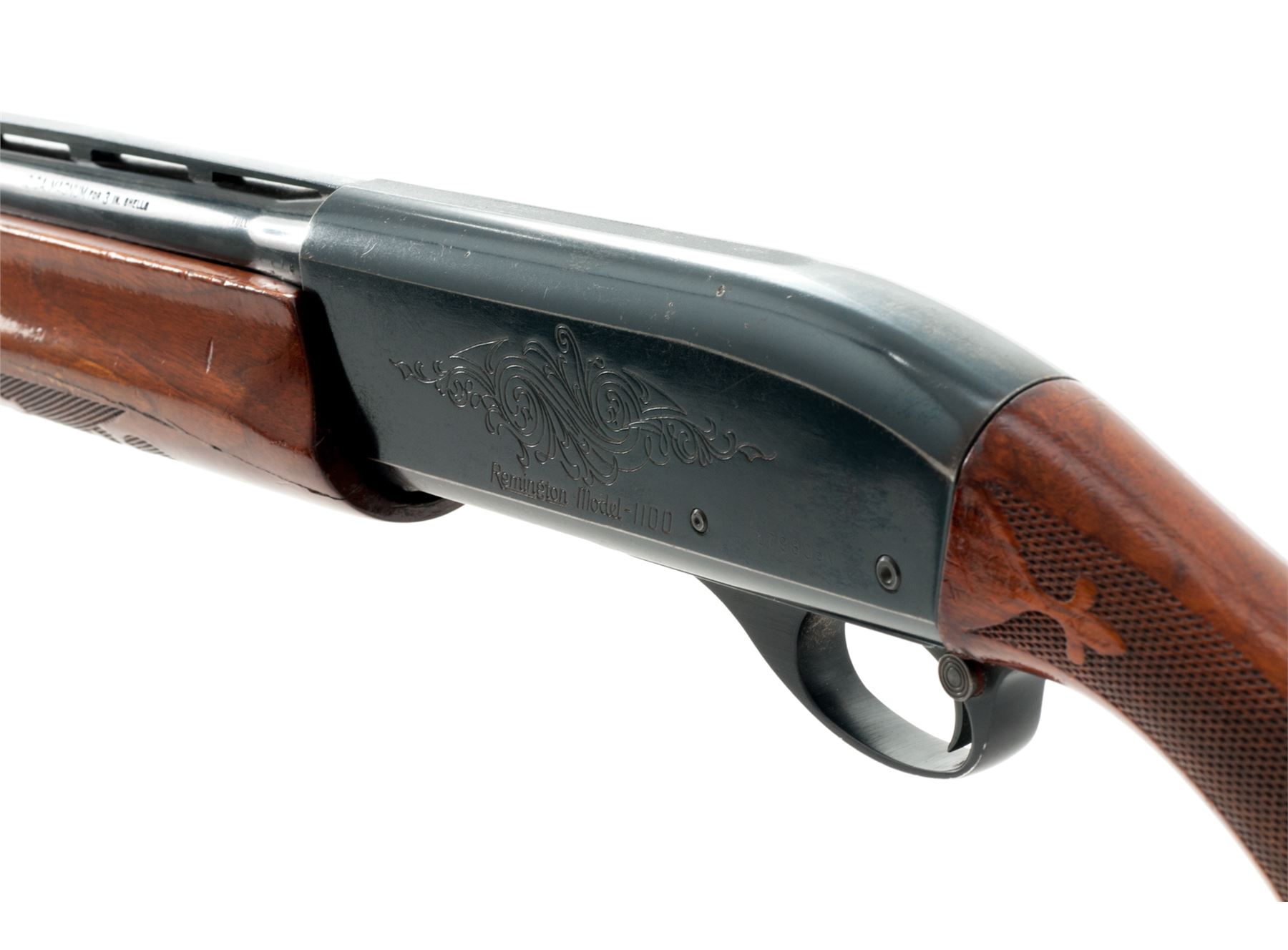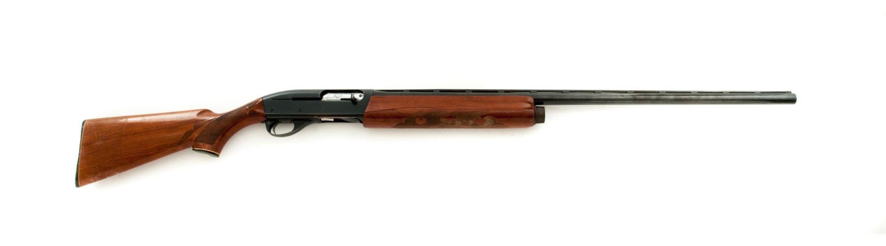 Remington Model 1100 Magnum Semi-Automatic Shotgun, #179805V, 12 ga., 30'' vent rib barrel with silver bead front sight, 3'' chamber, choked Full, blue finish, receiver with standard light engraving. Press checkered pistol-grip walnut stock with gloss finish, black plastic Remington buttplate and grip cap with white diamond. Metal retains approx. 90% finish and rates as good overall; receiver with some brown toning, tiny impressions and specks of surface rust. Factory lettering is clear. Wood with general shallow impressions and scratches; rear portion of the buttstock is a little discolored and worn, most likely from a slip-on recoil pad. Forend with a considerable crack to both sides. Excellent smooth action and mirror bright bore. Est.: $150-$250. (Modern)