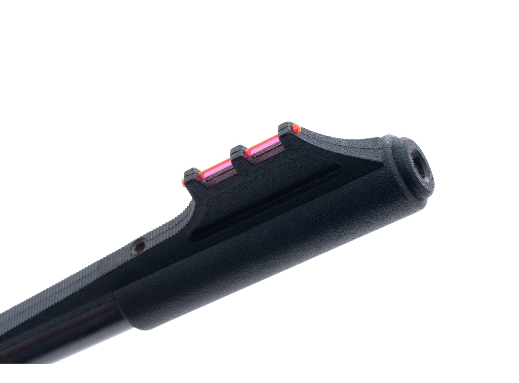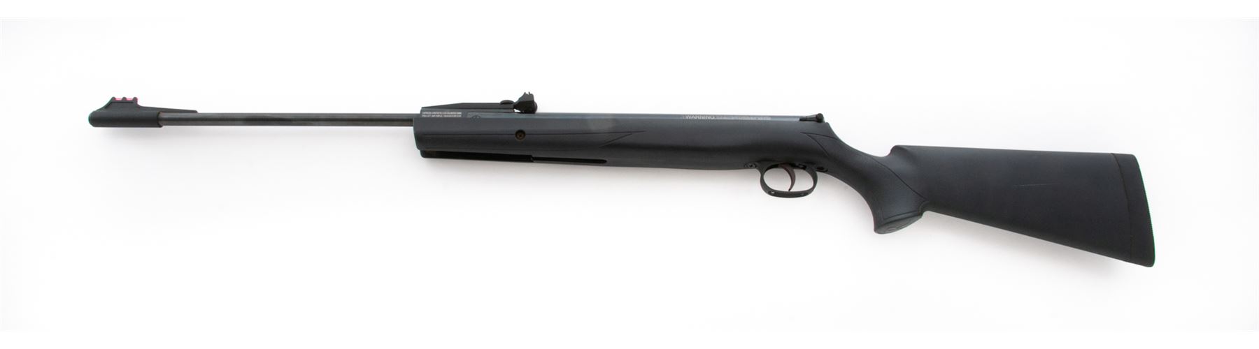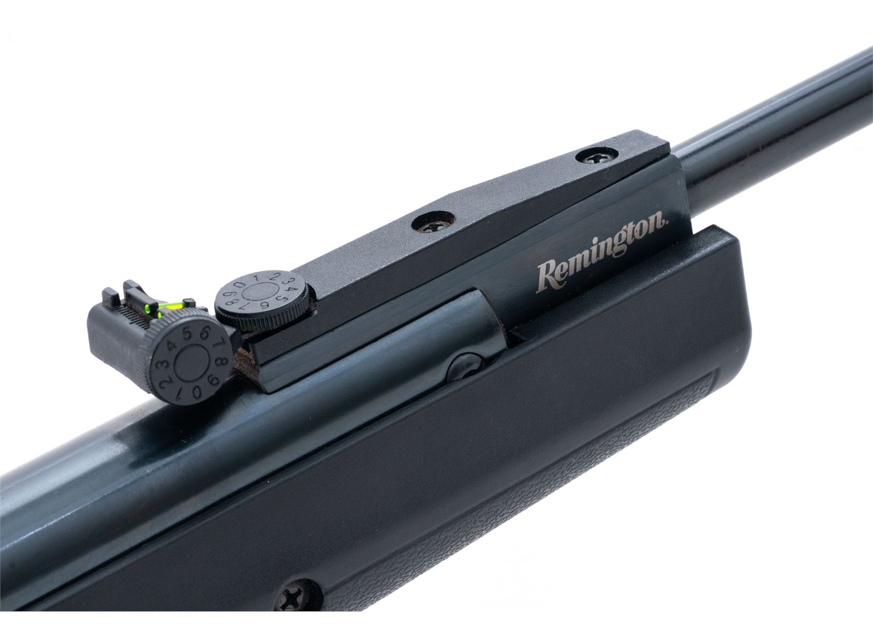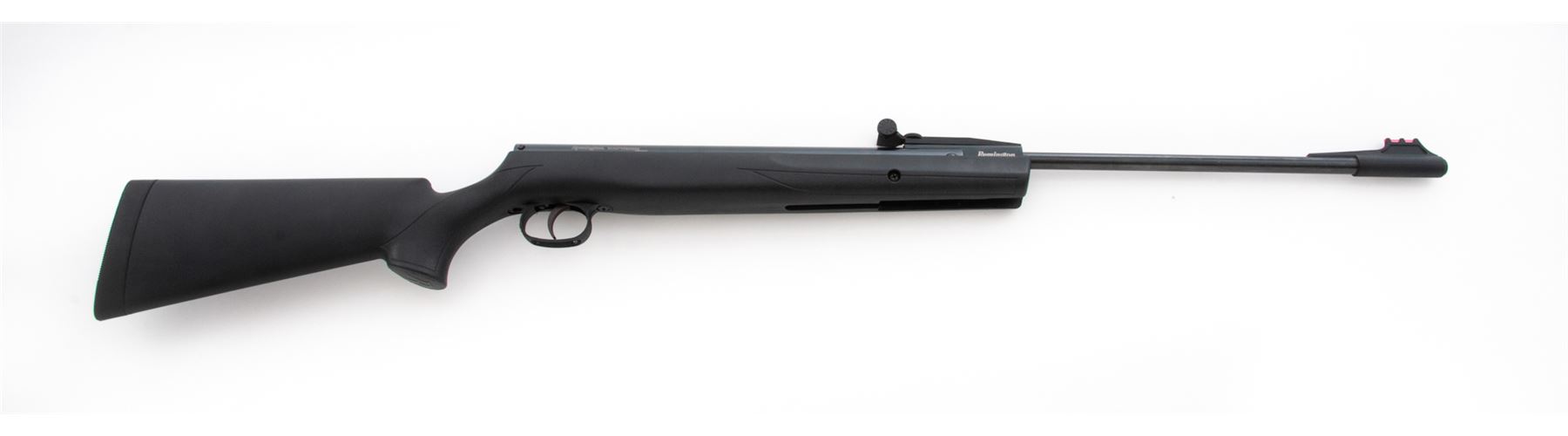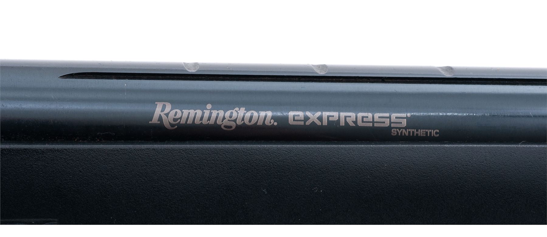 Remington Express Air Rifle, .22 (5.5mm) cal., 45.5'' overall, dark blue finish, pistol-grip black synthetic stock, red fiber optic front sight and adjustable green fiber optic rear sight, with adjustable trigger. Condition overall is excellent showing only a few light handling marks to the metal and stock, most noticeable being a thin surface scratch on the left side of the buttstock; approx. 98%+ finish remains. Action remains tight; bright bore with excellent rifling. Est.: $75-$125. (No FFL Required)