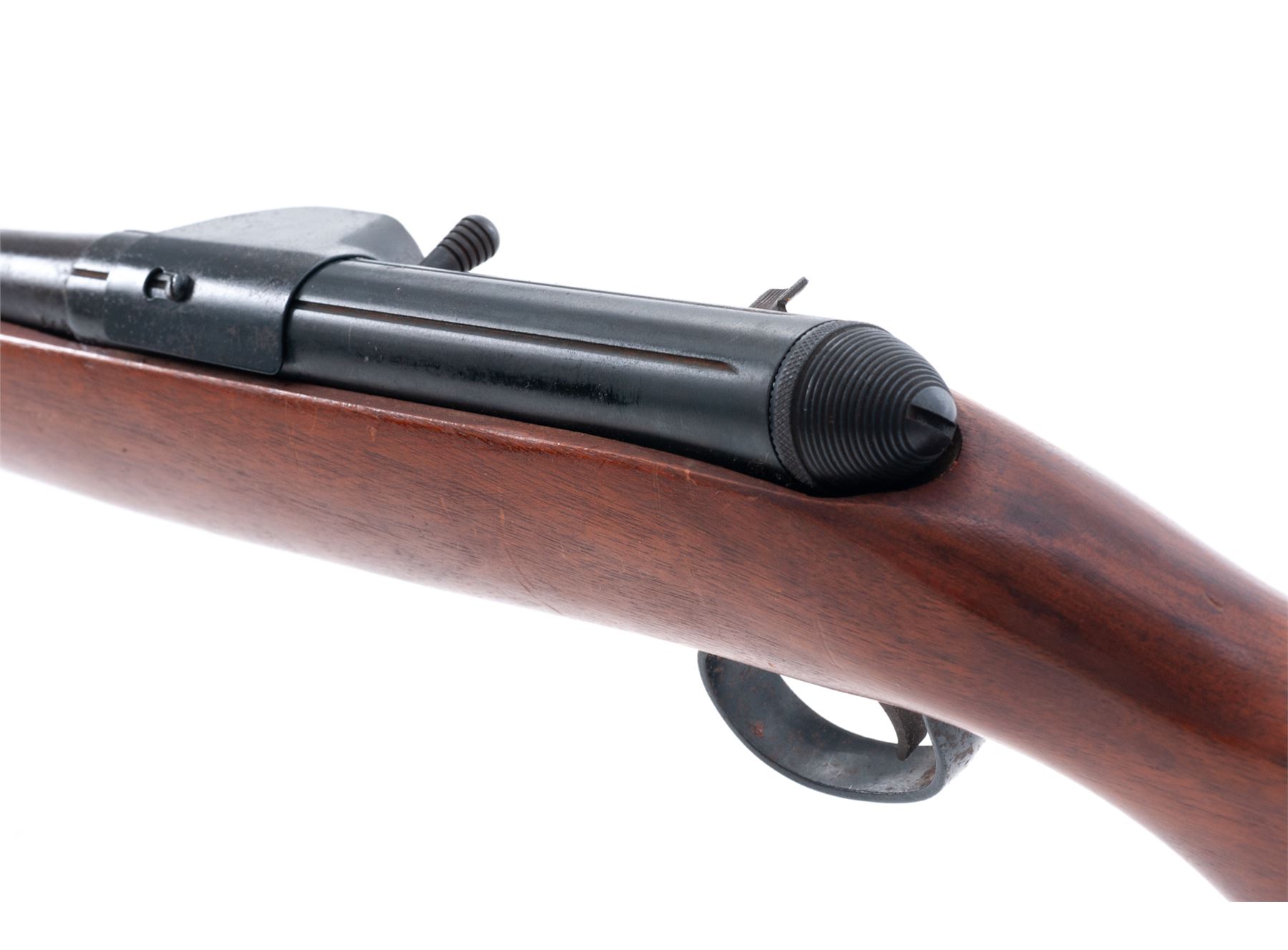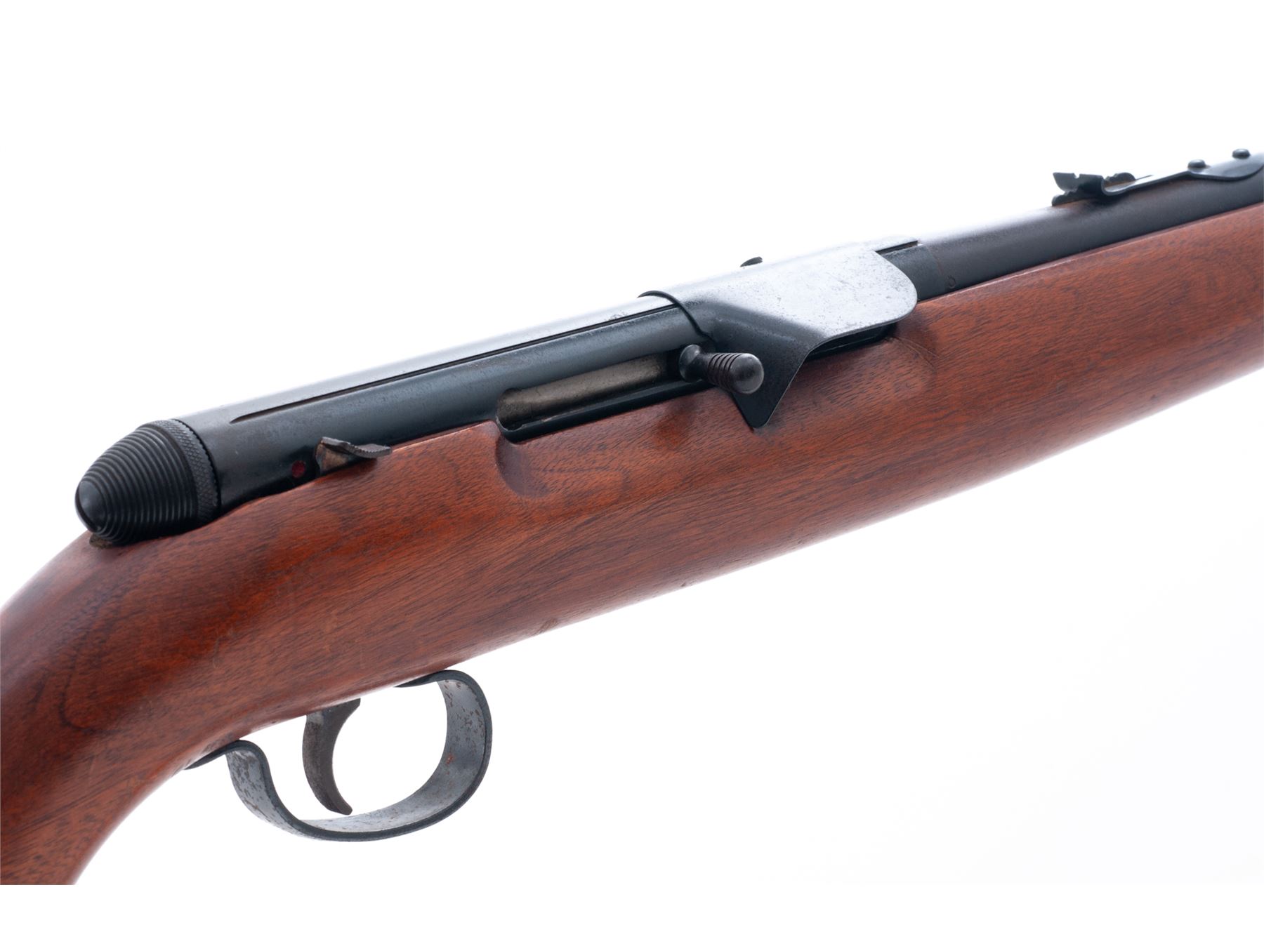 Lot of Two (2) .22 Caliber Rifles, by Winchester & Remington: 1.) Winchester Model 68 Single Shot Bolt Action Rifle, NVSN, .22 S-L-LR cal., 27'' barrel, blue finish, one-piece walnut stock with finger-grooved forend, black composite Winchester buttplate, dovetailed front sight with silver bead, and adjustable rear peep sight. Overall condition is fair to good. Metal with a combination toning blue and dark patina with general specks of light oxidation. Stock with an added coat of finish that shows cracking and blistering, mainly to the right side, buttplate with a chip at the toe. Factory lettering is clear. Very good action and clean bore. 2.) Remington Model 550-1 Semi-Automatic Rifle, NVSN, .22 S-L-LR cal., 24'' barrel, blue finish, one-piece pistol-grip walnut stock, standard sights, with a factory grooved receiver. Metal is fair to good with a combination toning blue and dark patina with general spots of light surface rust. Stock is very good with small handling marks and a few shallow impressions, top of buttplate is missing. Smooth action, bright bore. Est.: $150-$250/lot (Both/C&R)