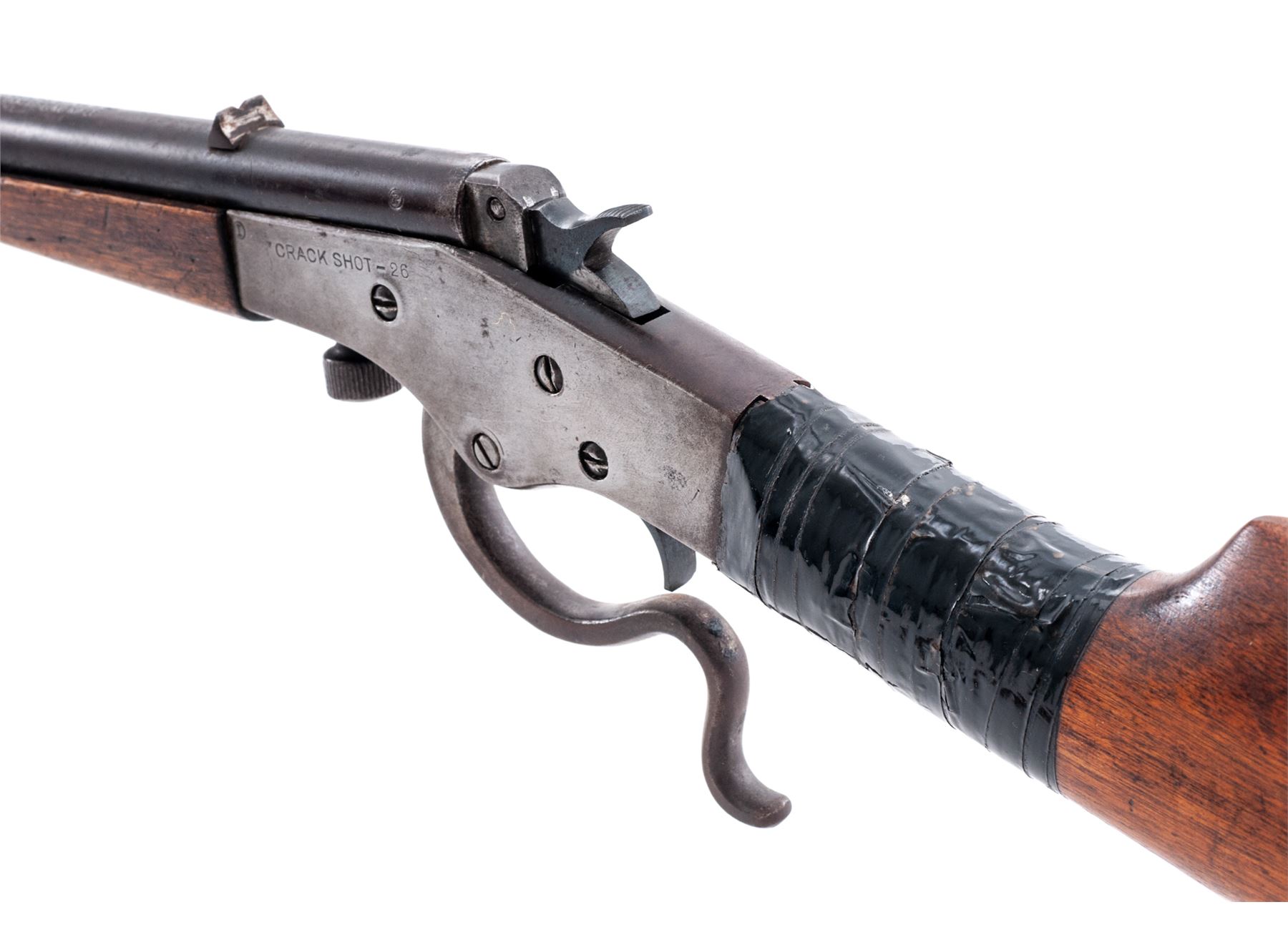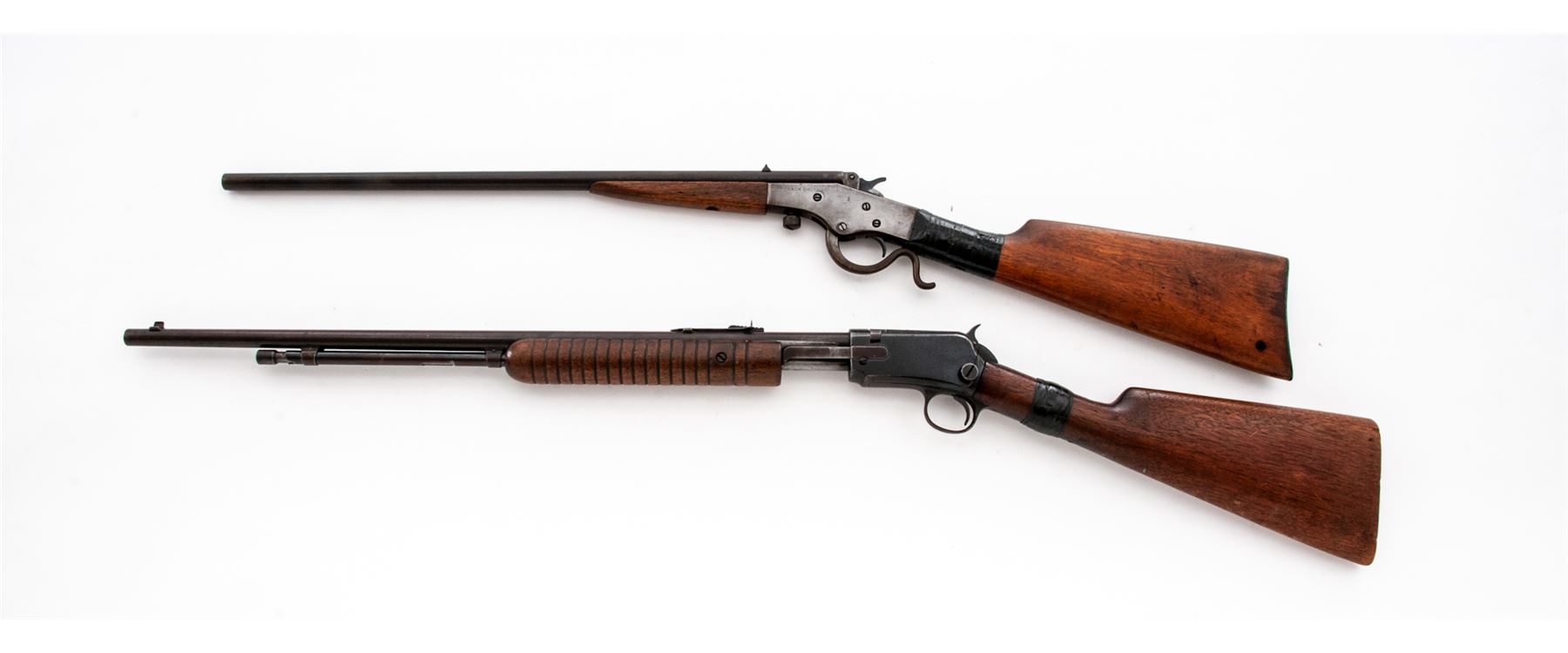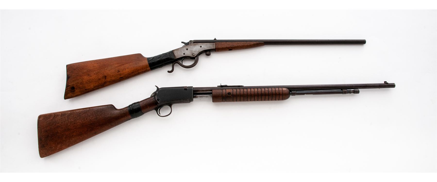 Lot of Two (2) Boys' Single Shot Rifles: (1) J. Stevens ''Crack Shot'' No. 26 Rifle, NVSN, .22 LR RF cal., 20'' round barrel with missing blade front and dovetailed notched rear sights; steel receiver with large knurled bottom takedown screw and serpentine operating lever marked ''Crack Shot-26'' on left side; plain oil-stained hardwood forend and straight buttstock with steel buttplate. Mfg'd 1912-39. Condition is about good, the metal parts retaining no original finish with an overall gunmetal gray color and clear markings (slight battering at barrel address), the buttstock with what appears to be black electrical tape covering a break repair at wrist and a hole drilled through near toe, perhaps for a leather thong. Action functions as designed; bore is clean with defined rifling. (2) Winchester Model 62A Pump Action Rifle, #146722, .22 S-L-LR RF cal., 23'' round barrel with dovetailed blade front and adjustable open rear; blued tubular cartridge magazine; blued steel receiver with large knurled takedown screw on left side; oil-stained walnut grooved forend slide and straight buttstock. Mfg'd 1942. Condition is good to very good, the metal retaining perhaps 15% blue blending with brown patina, the buttstock with what may be black electrical tape covering a break repair at wrist. Action is smooth; bore shines with defined rifling. Est.: $150-$250/Lot. (Both C&R)